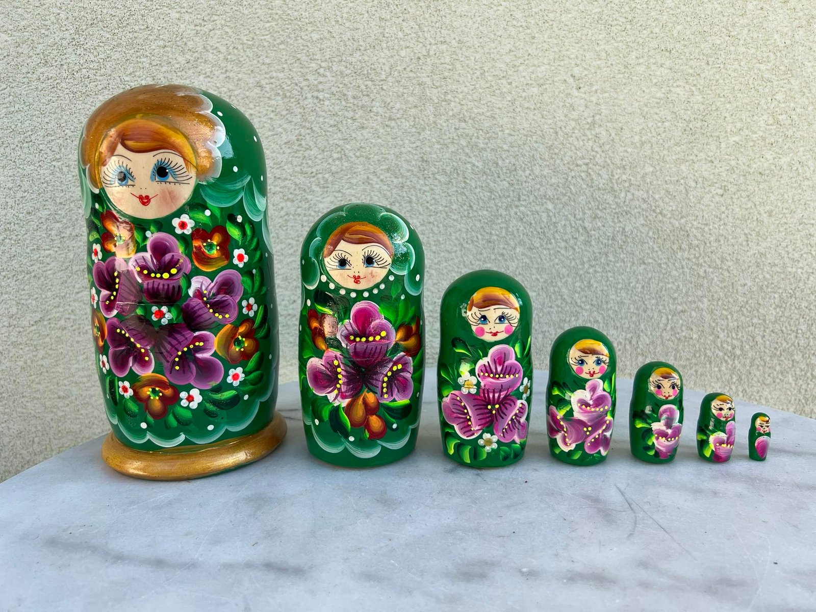 Matrioška tapyta 7 dalių, medinė, sovietinė, tarybinių laikų. Aukštis 25 cm. Skersmuo 11 cm. Kaina 83