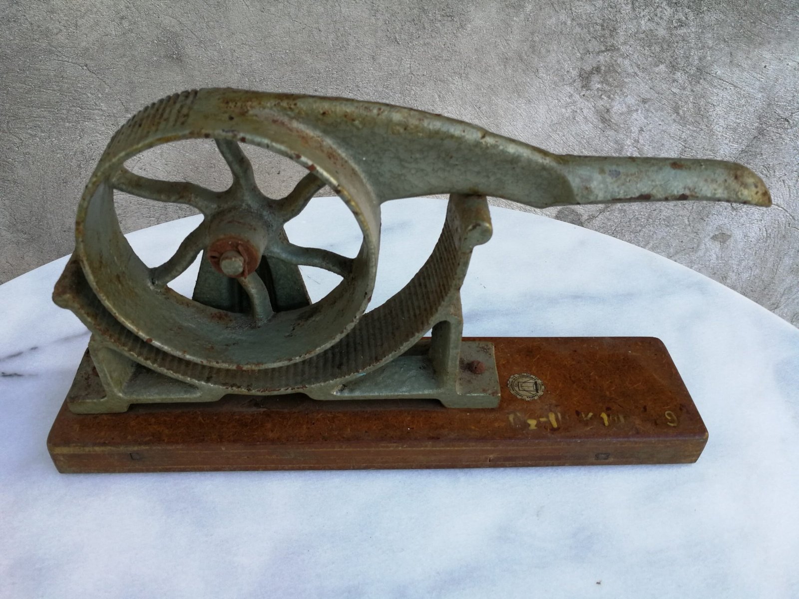 Medicininis antikvarinis prietaisas butelių kamščiams užspausti (užkorkuoti). Pagamintas is ketaus (špižinis). Dydis: 30, 17, 7 cm. Kaina 33