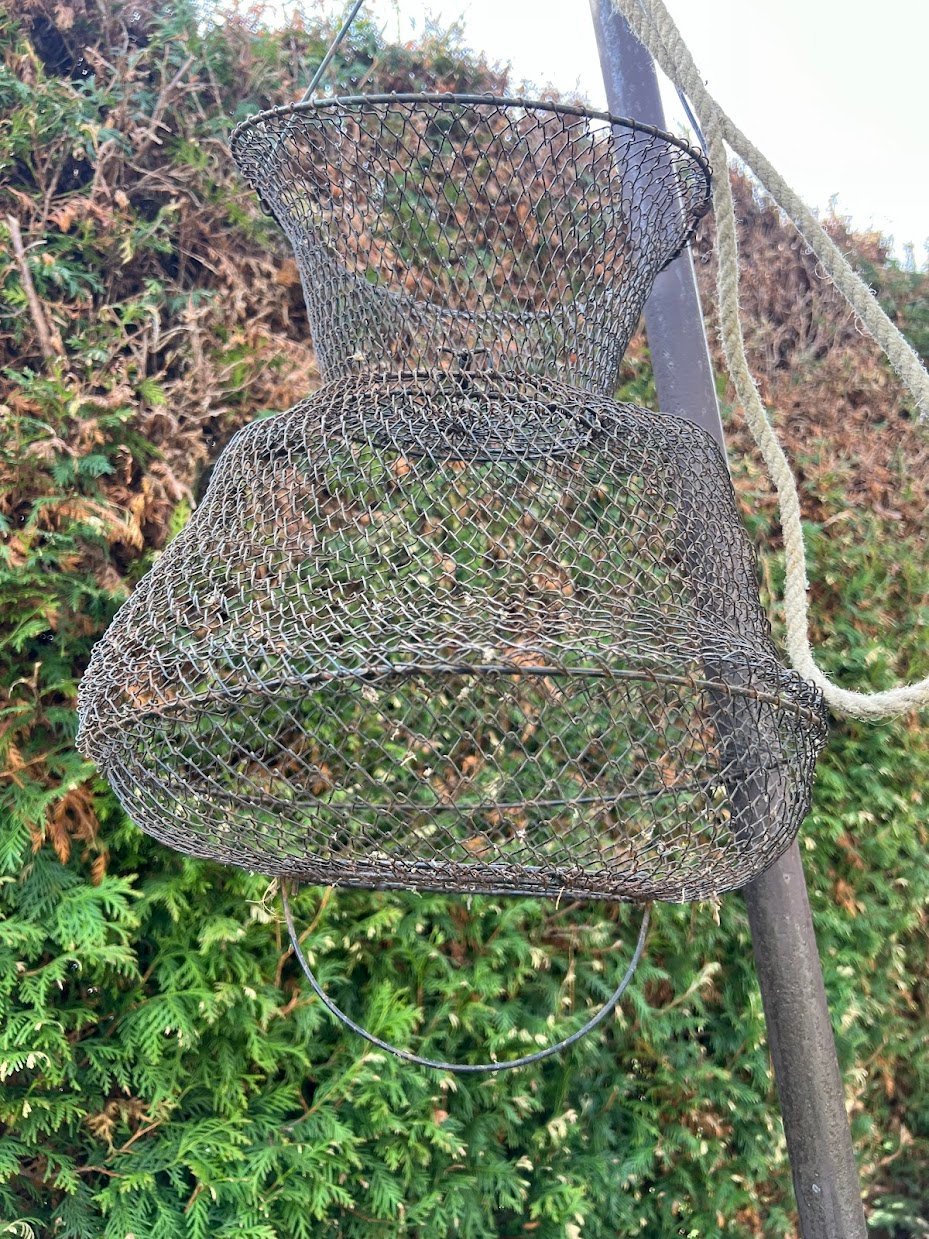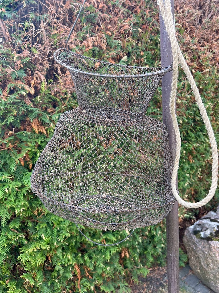 Metalinis žvejybinis sietelis, vintažinis. Aukštis 45, skersmuo 35 cm. Kaina 18