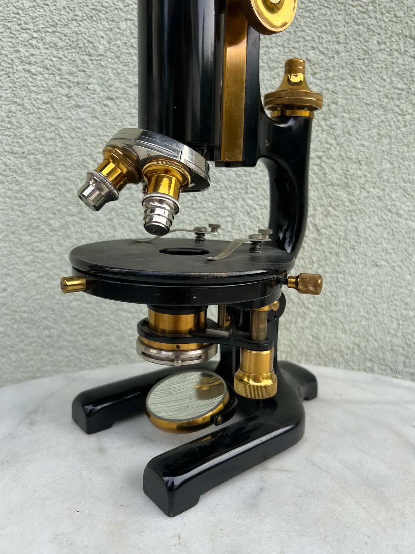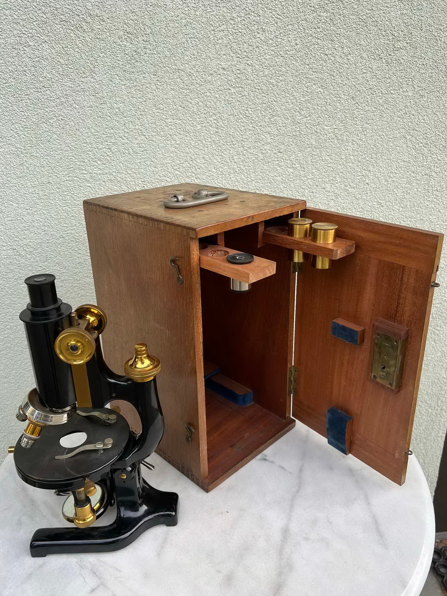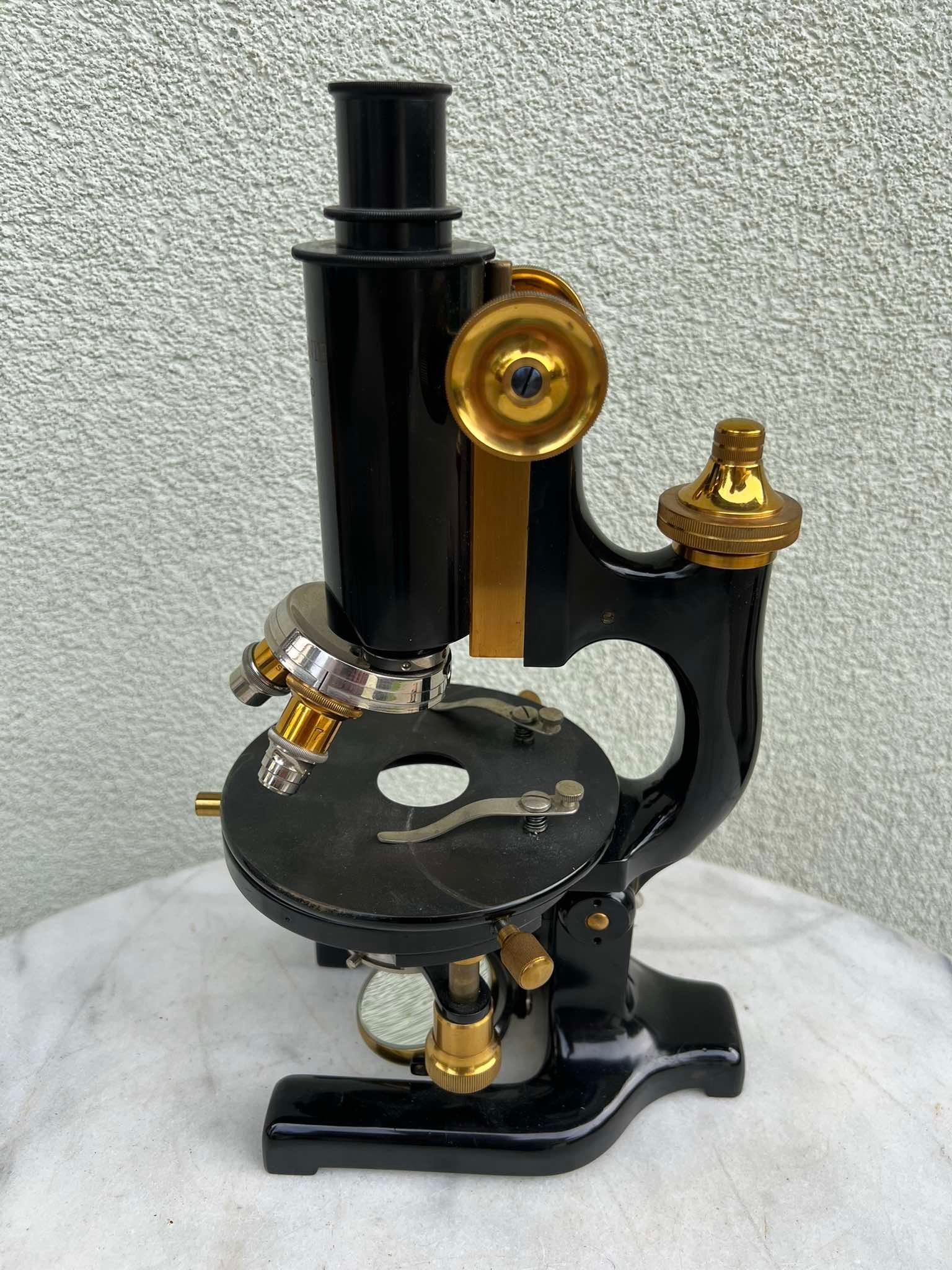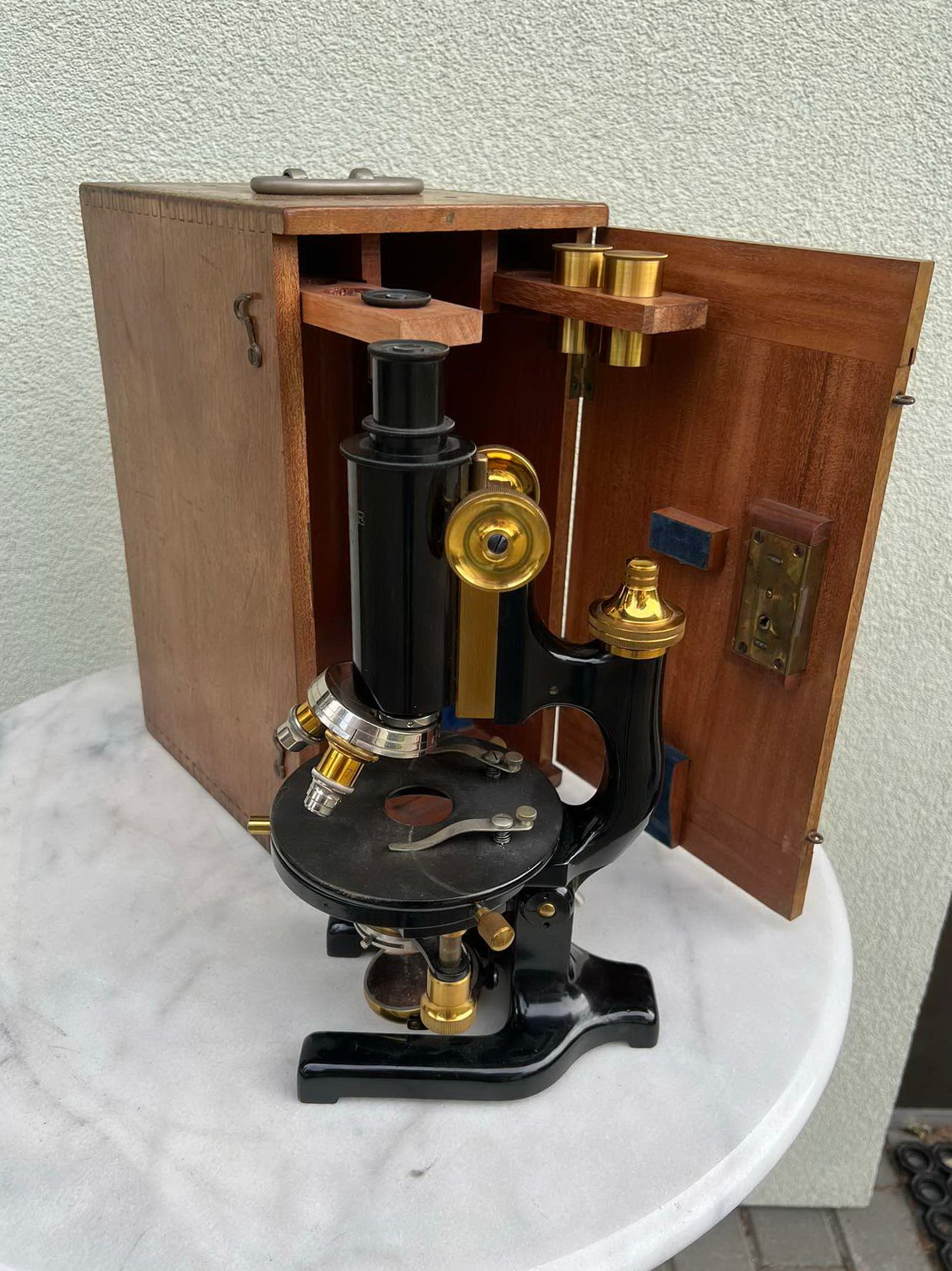 Apie 1930 m. gamintas laboratorinis mikroskopas pasižymėjo juodai dažytu metaliniu korpusu su auksinio žalvario detalėmis ir buvo komplektuojamas su originalia laikymo dėže bei priedais.