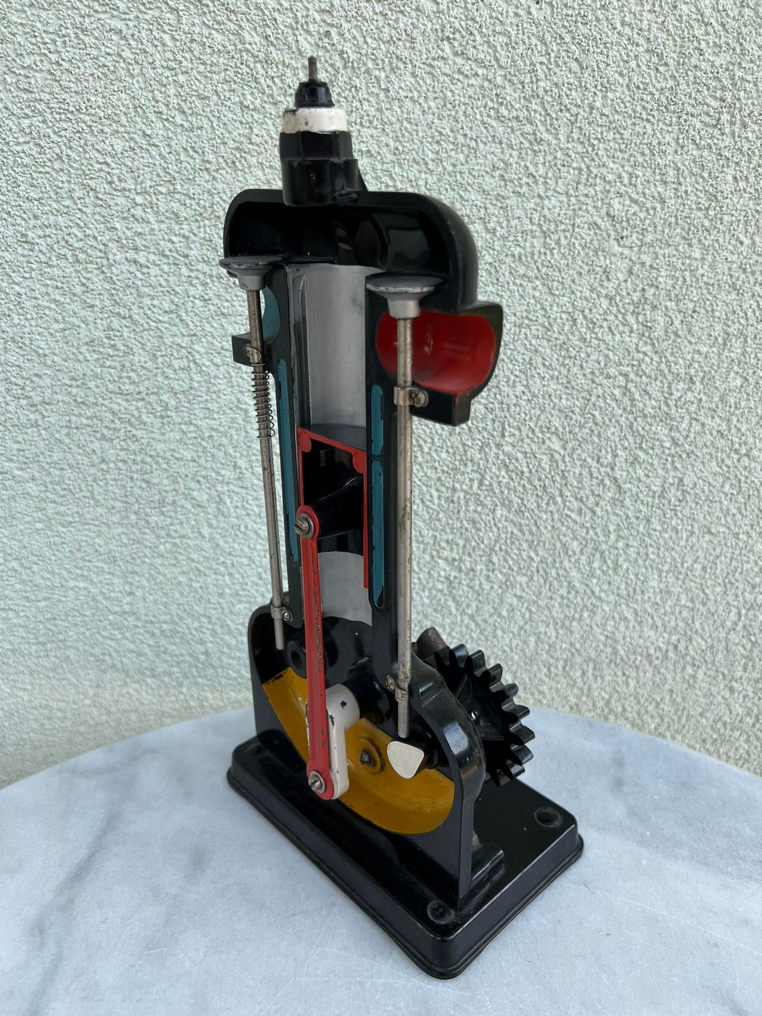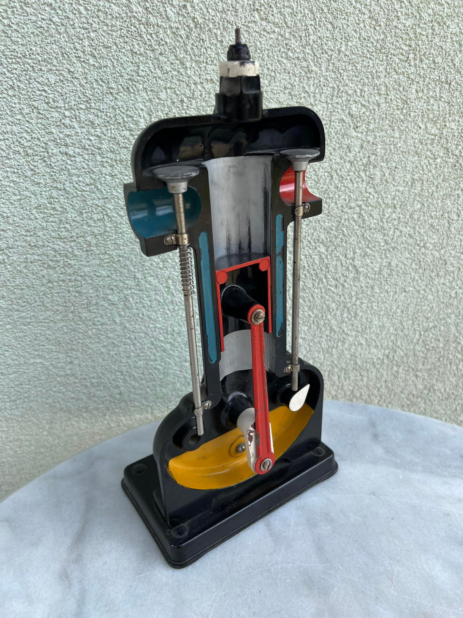 Modelis demonstracinis variklio tarybinis, sovietinių laikų. Aukštis 33, pagrindo ilgis 16, plotis 10 cm. Viskas yra taip kaip matosi nuotraukose, papildomų detalių nėra. Kaina 53