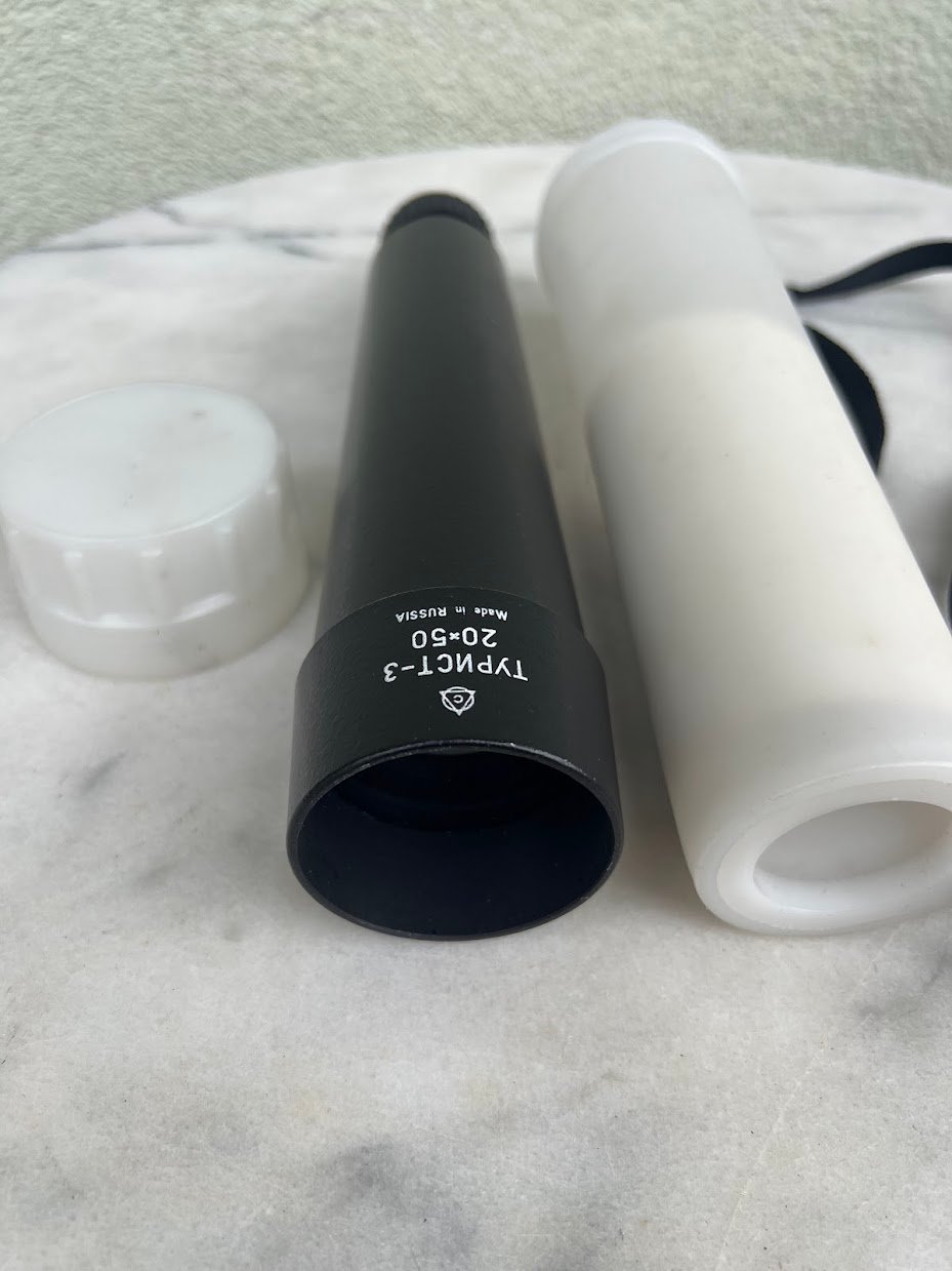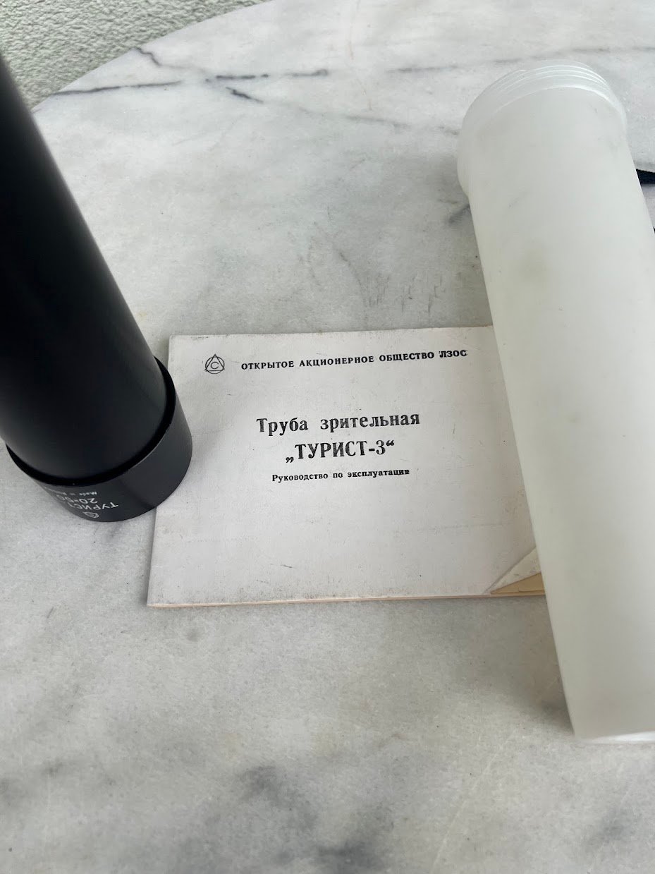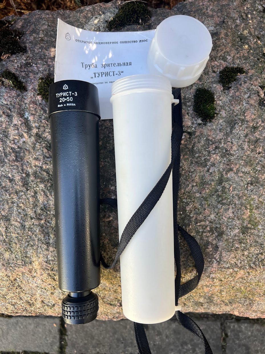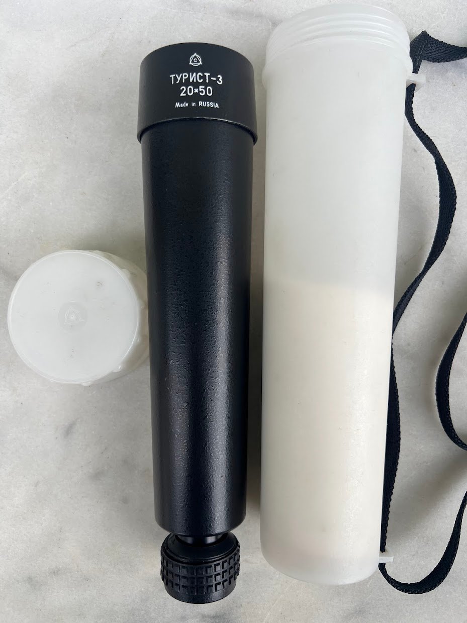 Monokolis, monokuliarinis teleskopas, sovietinis, tarybinių laikų, 20 x 50, Turist-3, Турист-3. 1960-1990 m. Futliaro ilgis 27 cm. Nenaudotas
