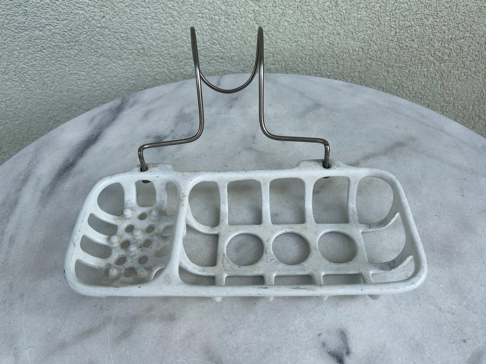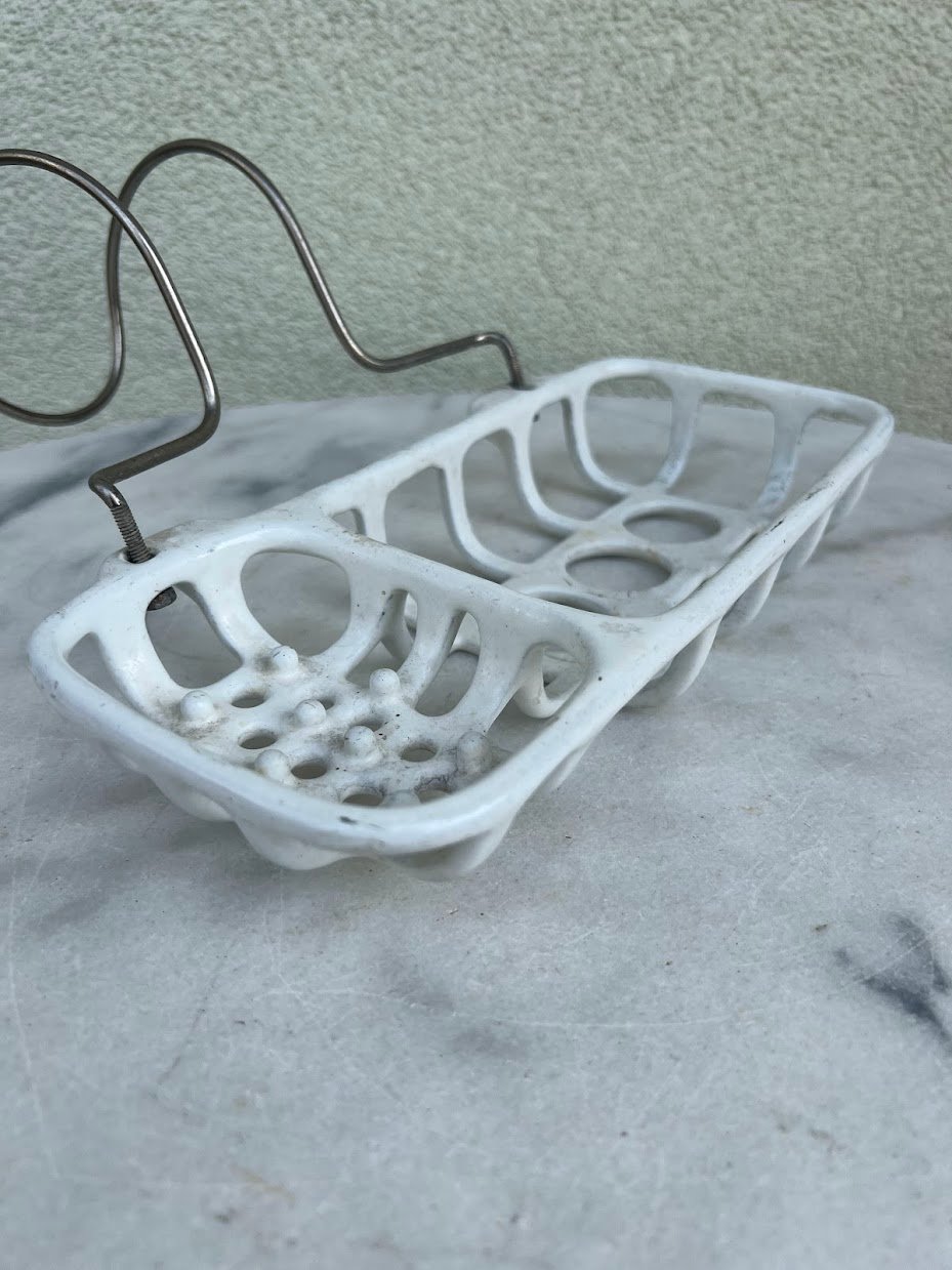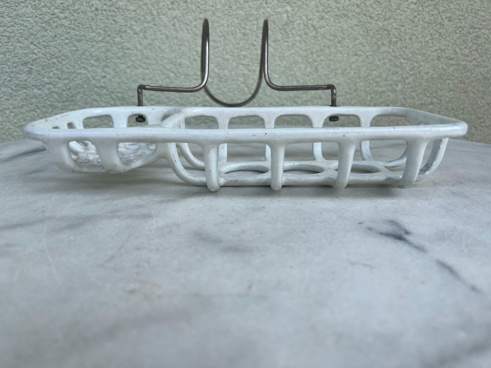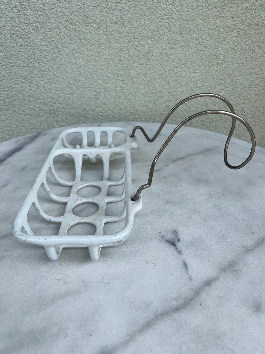 Muilinė ketaus, špižinė, emaliuota antikvarinė, prancūziška. Pakabinama ar prisukama prie sienos. Ilgis 26, plotis 12, aukštis 5 cm. Kaina 87