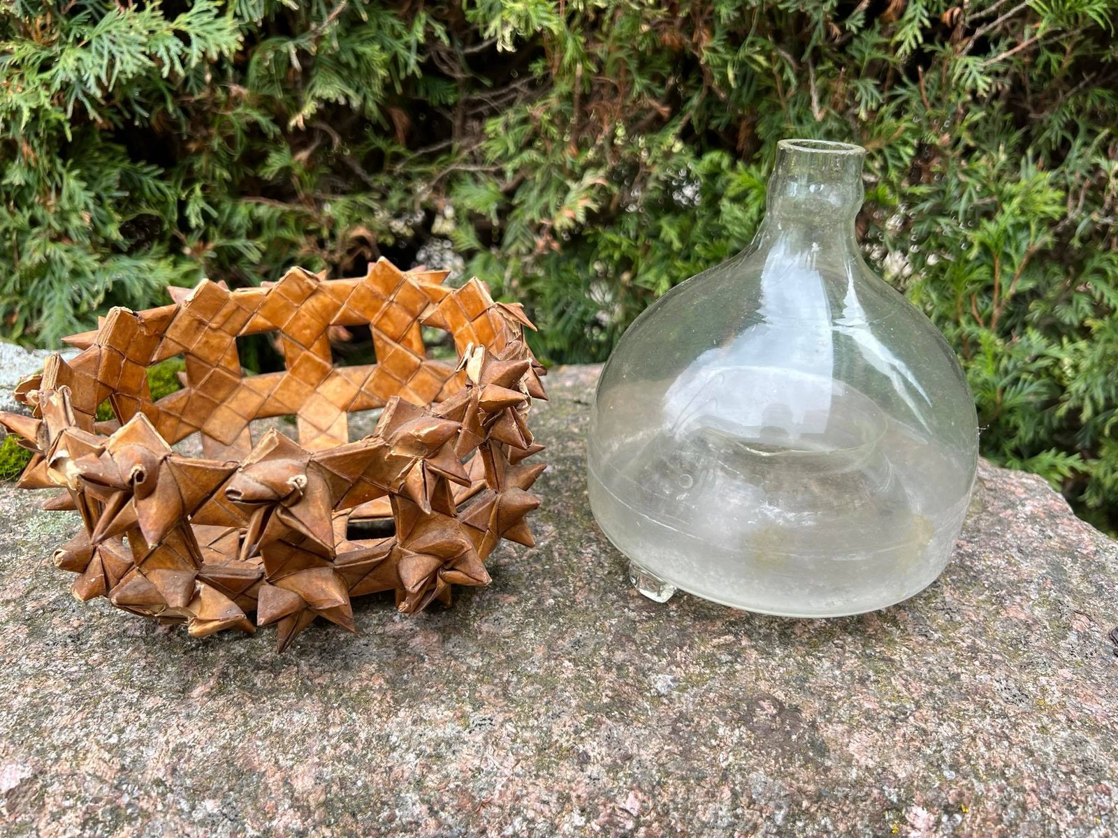Musgaudis stiklinis pintame dėkle antikvarinis. Aukštis 19, skersmuo 16 cm. Kaina 68