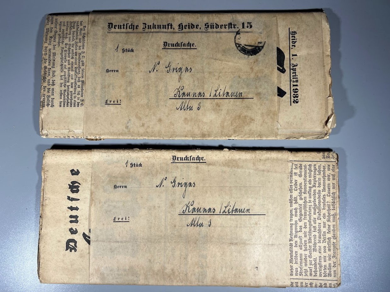Napalio Grigo tarpukario laikų korespondencija, užsakyti vokiški laikraščiai. Nenaudota. 2 vnt. Kaina po 18