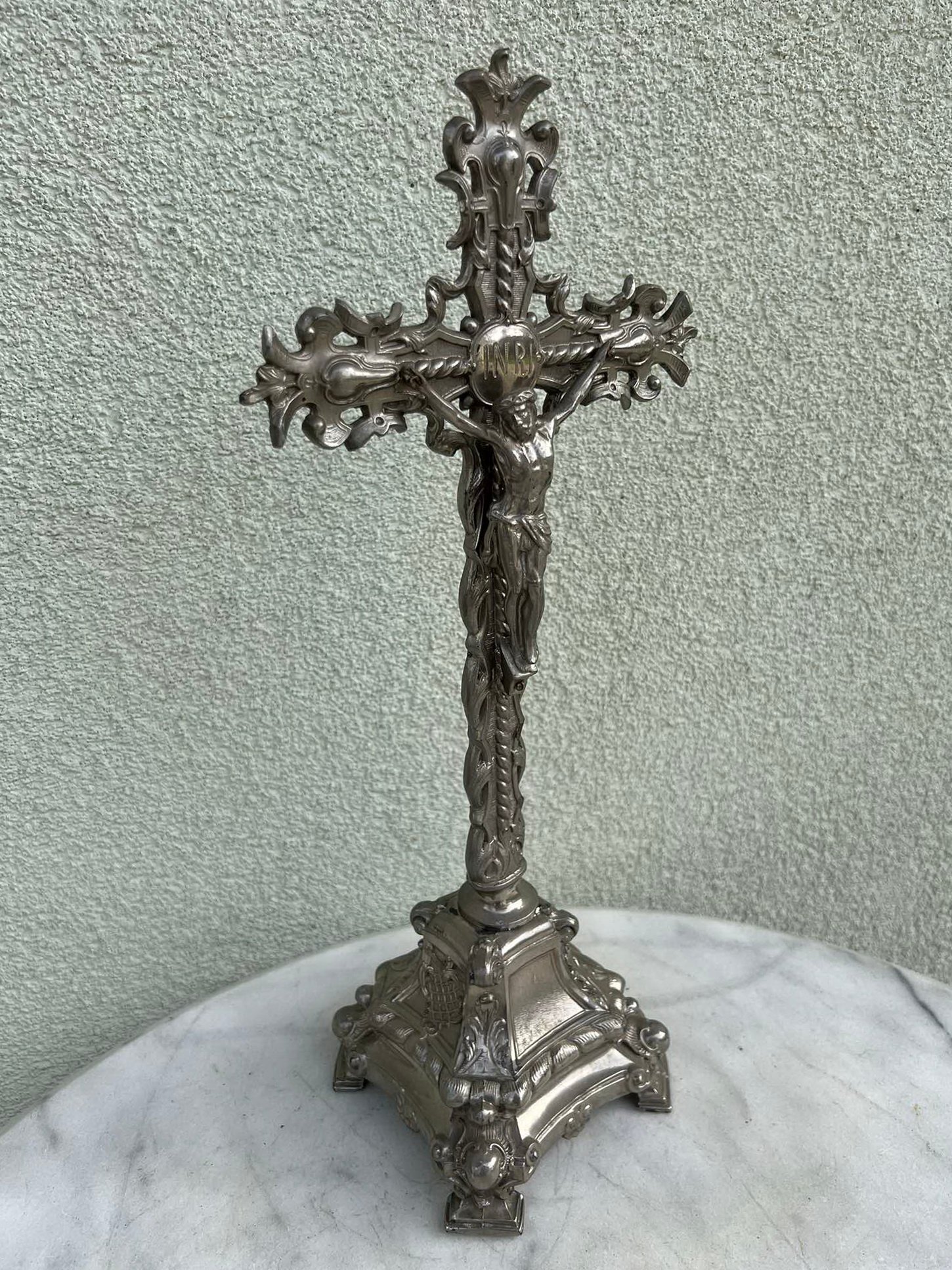 Nukryžiuotasis, kryžius pastatomas, antikvarinis. Metalas. Aukštis 39, plotis 18 cm. Kaina 73