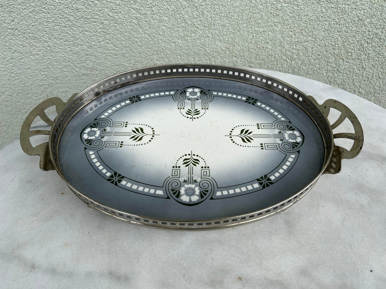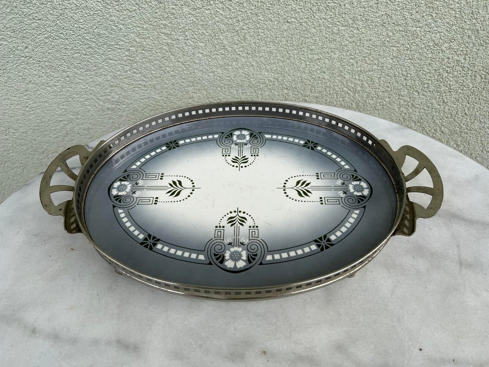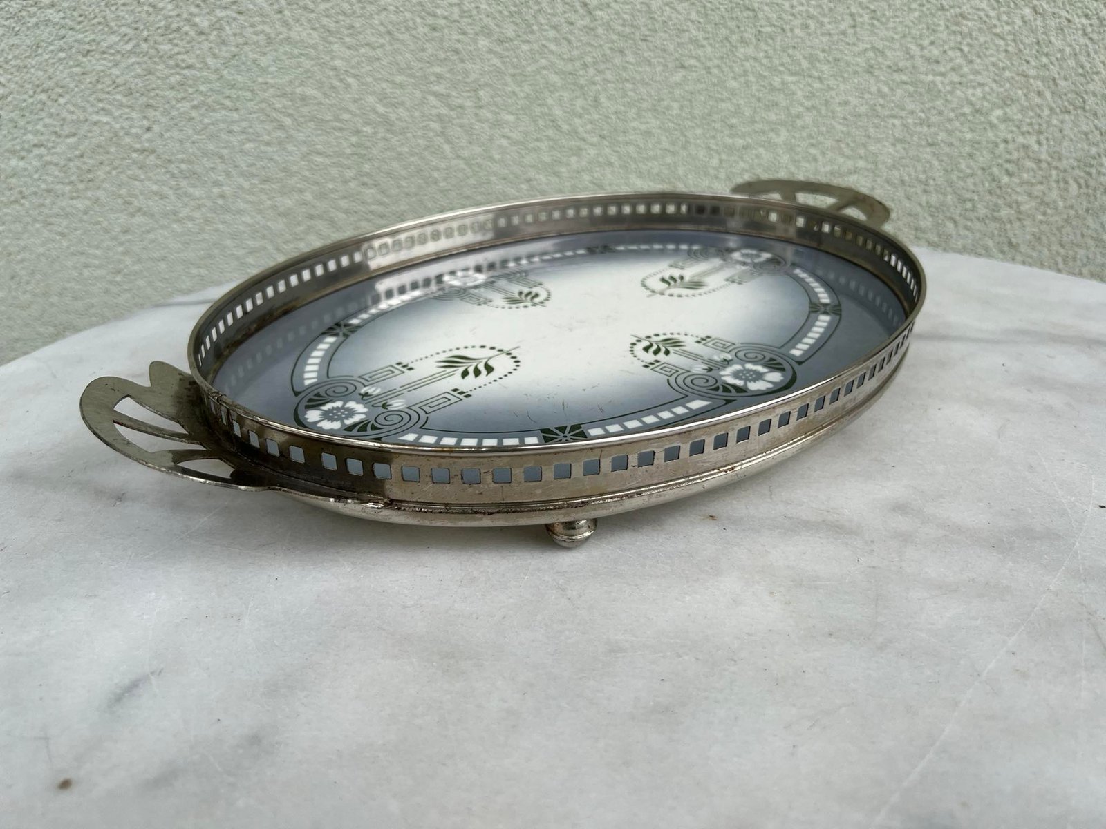 Padėklas antikvarinis fajanso, dengta glazūra ornamentika Art Nouveau stiliaus ir laikotarpio. Ilgis tarp rankenų 37, plotis 23, aukštis 4 cm. Kaina 53