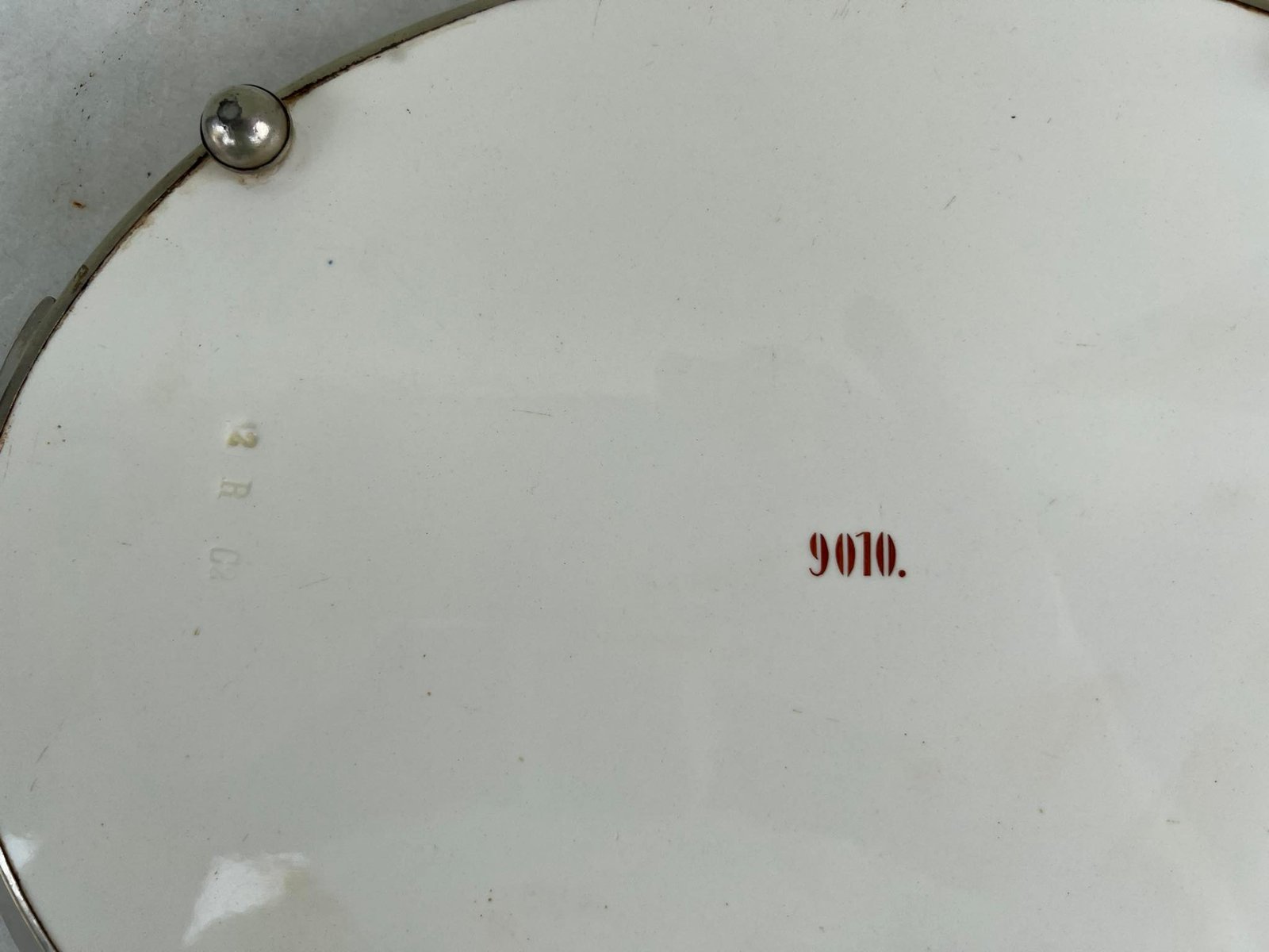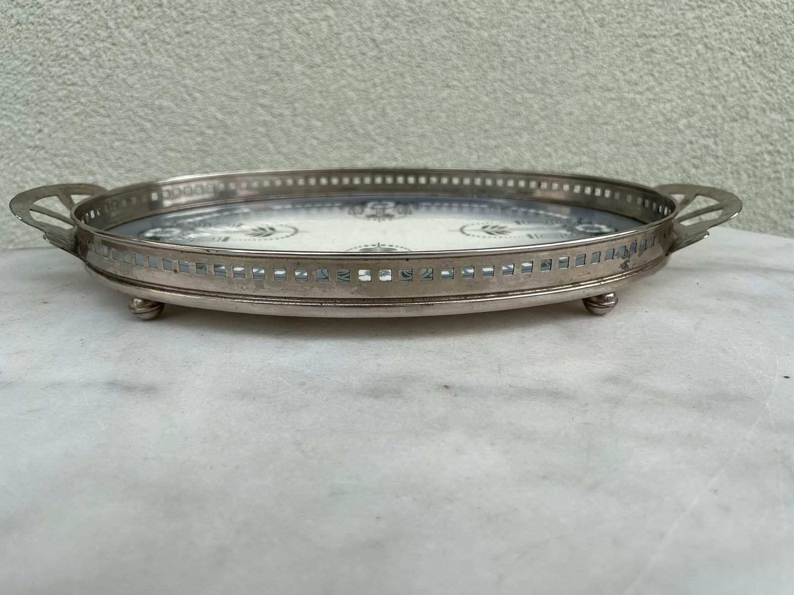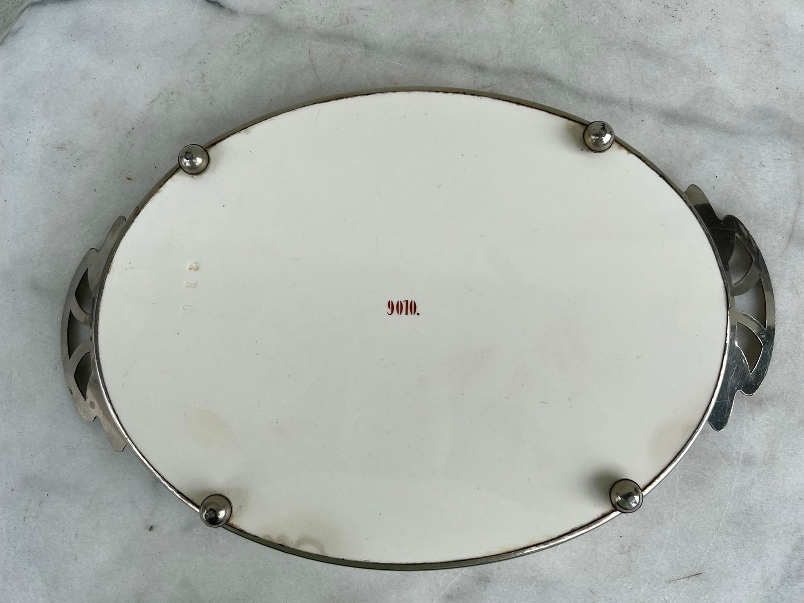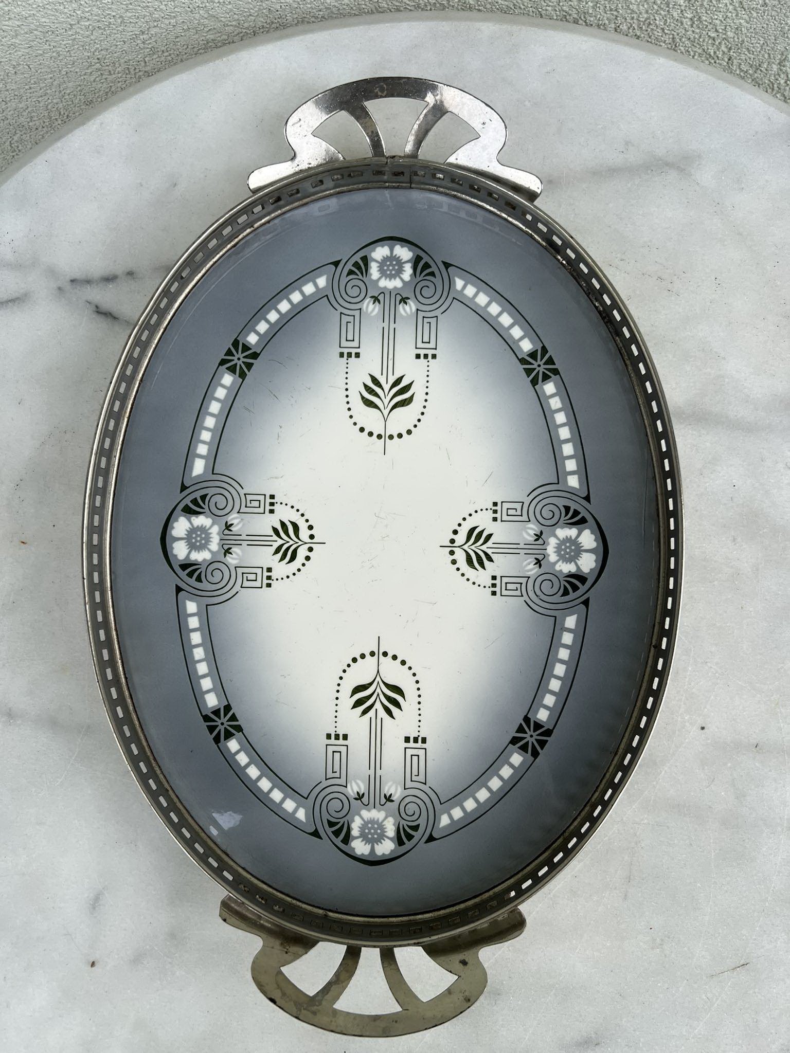 Padėklas antikvarinis fajanso, dengta glazūra ornamentika Art Nouveau stiliaus ir laikotarpio. Ilgis tarp rankenų 37, plotis 23, aukštis 4 cm. Kaina 53