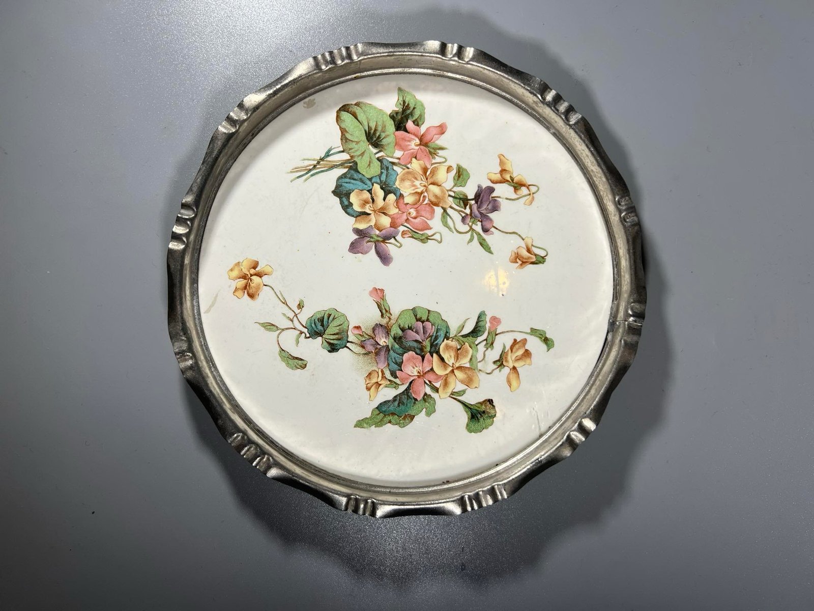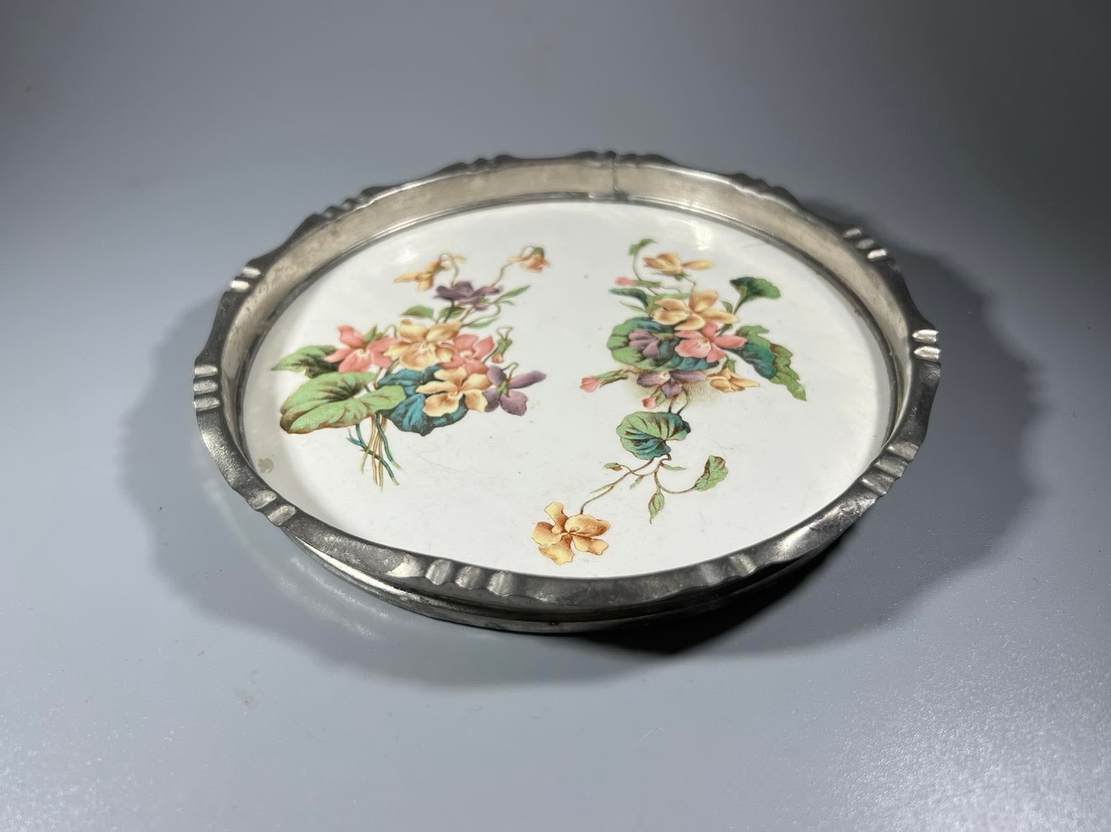 Padėklas glazūruotas alaviniu apvadu antikvarinis. Skersmuo 16, aukštis 2 cm. Kaina 23