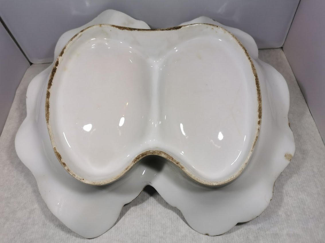 Padėklas, indas dviejų dalių su rankena, porcelianinis, antikvarinis. Trūkumai matosi nuotraukose. Ilgis 27, plotis 30, aukštis 12 cm. Kaina 23