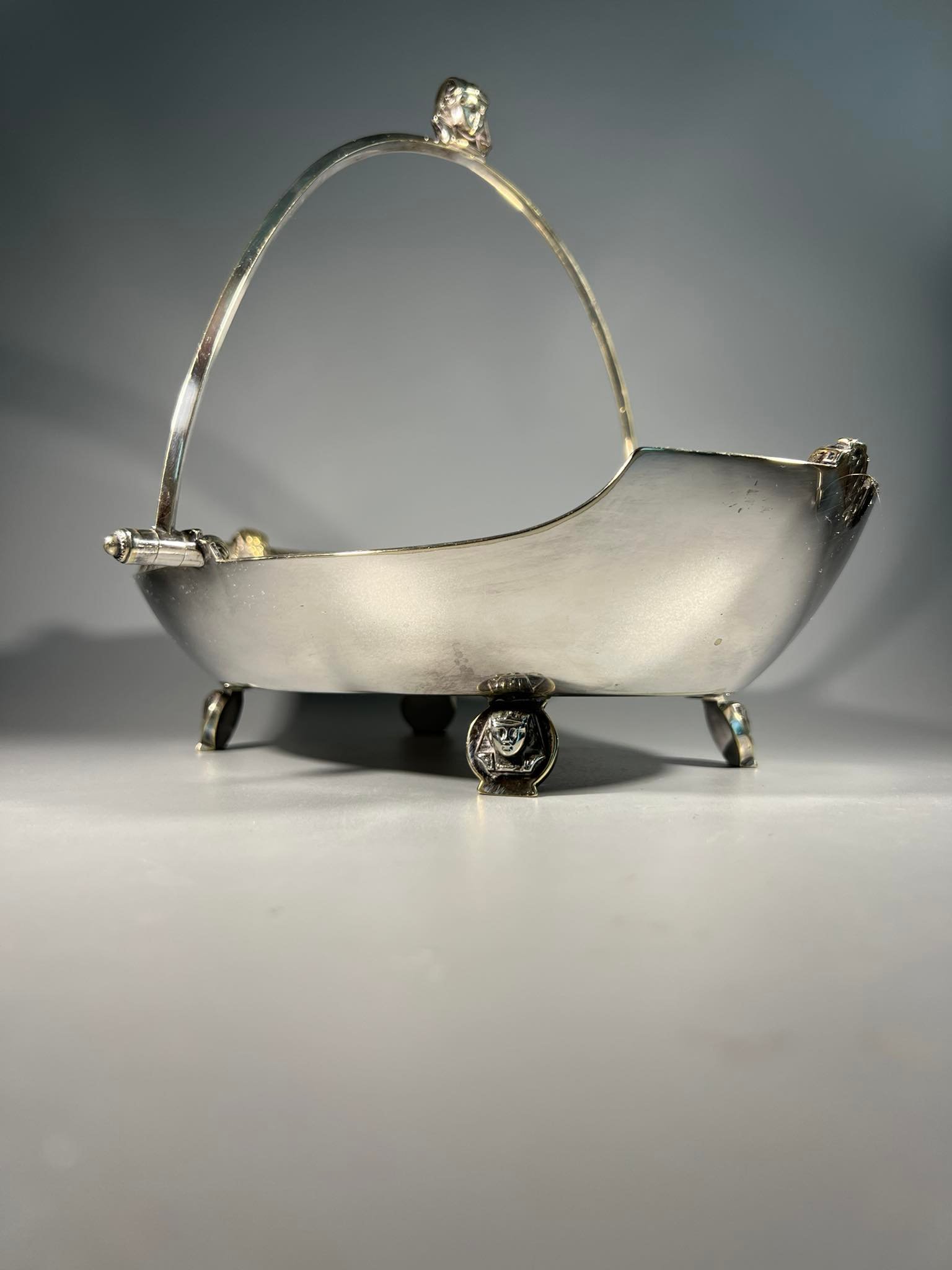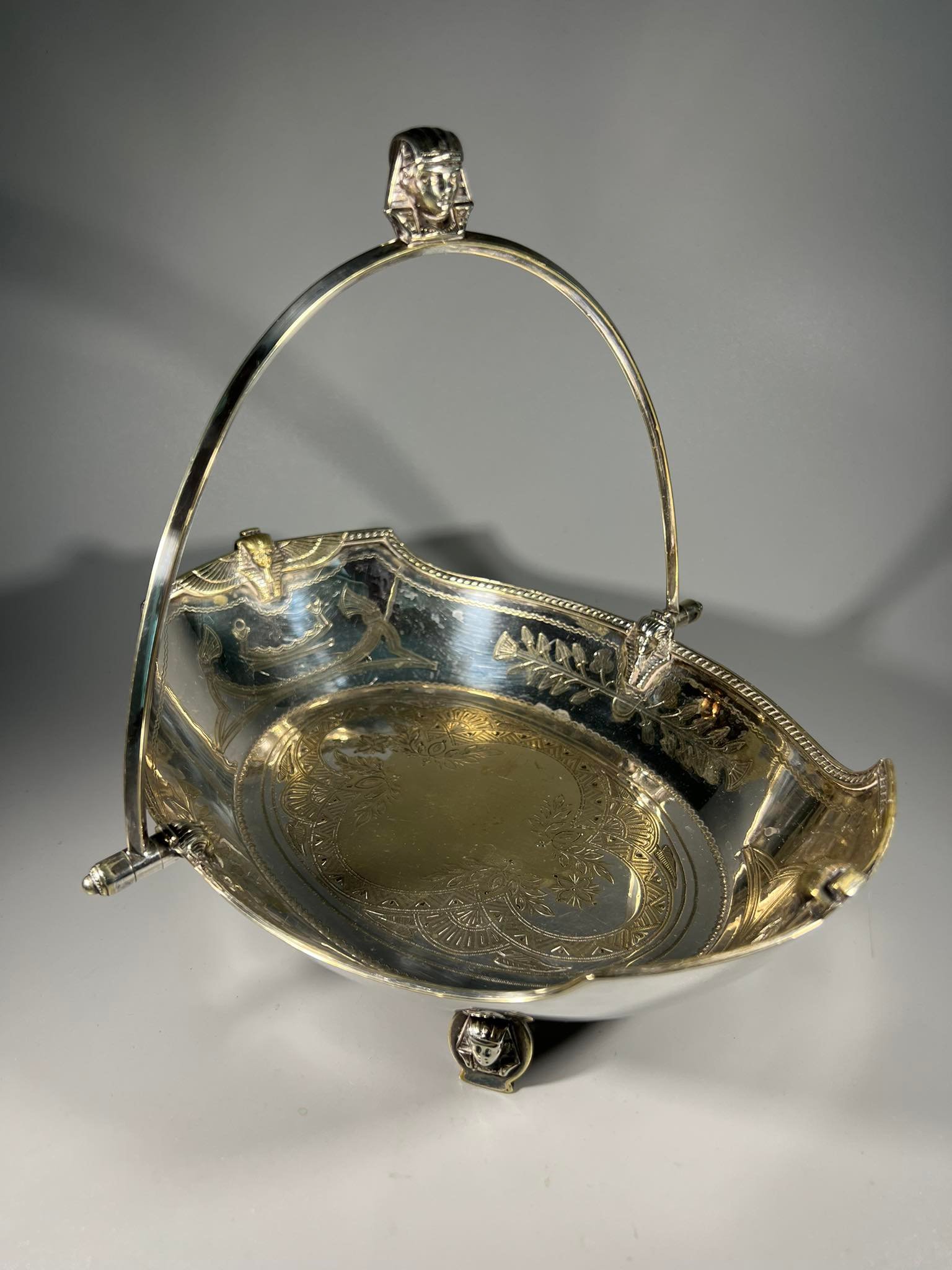 Padėklas, indas su rankena antikvarinis, puoštas faraonais, raižiniais, sidabruotas. Kaina 93