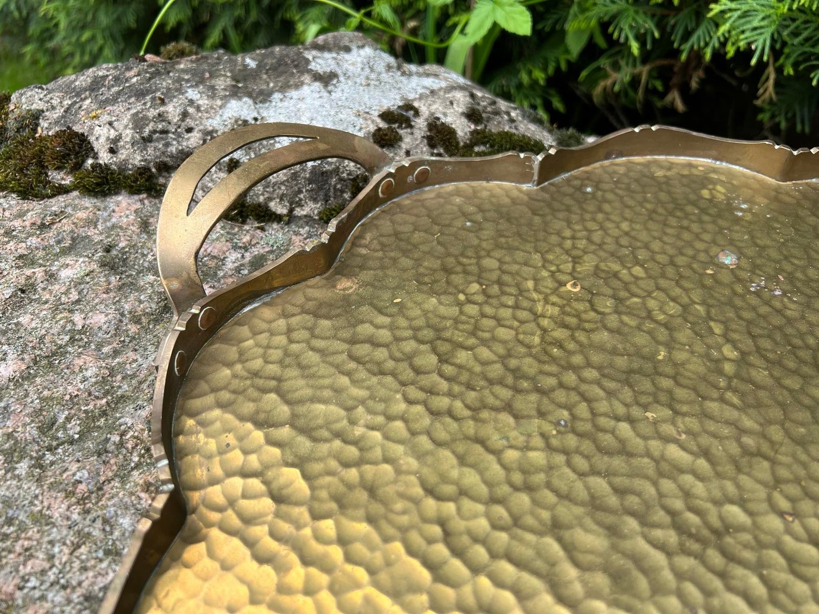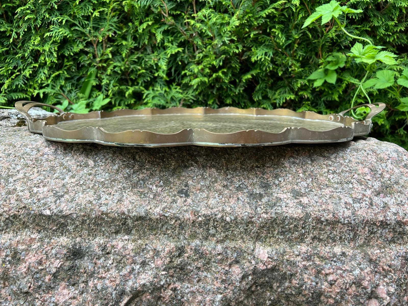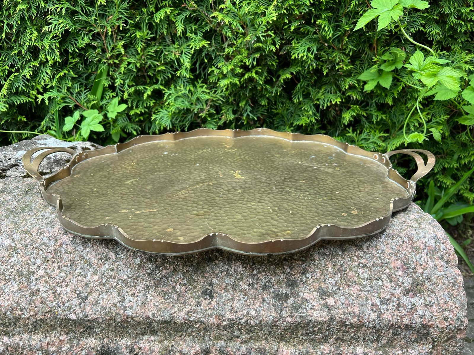 Padėklas masyvus, su rankenomis, didelis, žalvarinis, antikvarinis. Ilgis 55, plotis 37, šonų aukštis 2 cm. Kaina 53