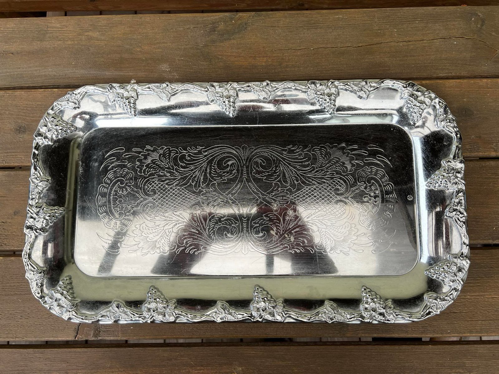 Padėklas metalinis puoštas vynuogėmis, chromuotas. Gamintojo spaudas. Ilgis 47, plotis 27 cm. Kaina 33