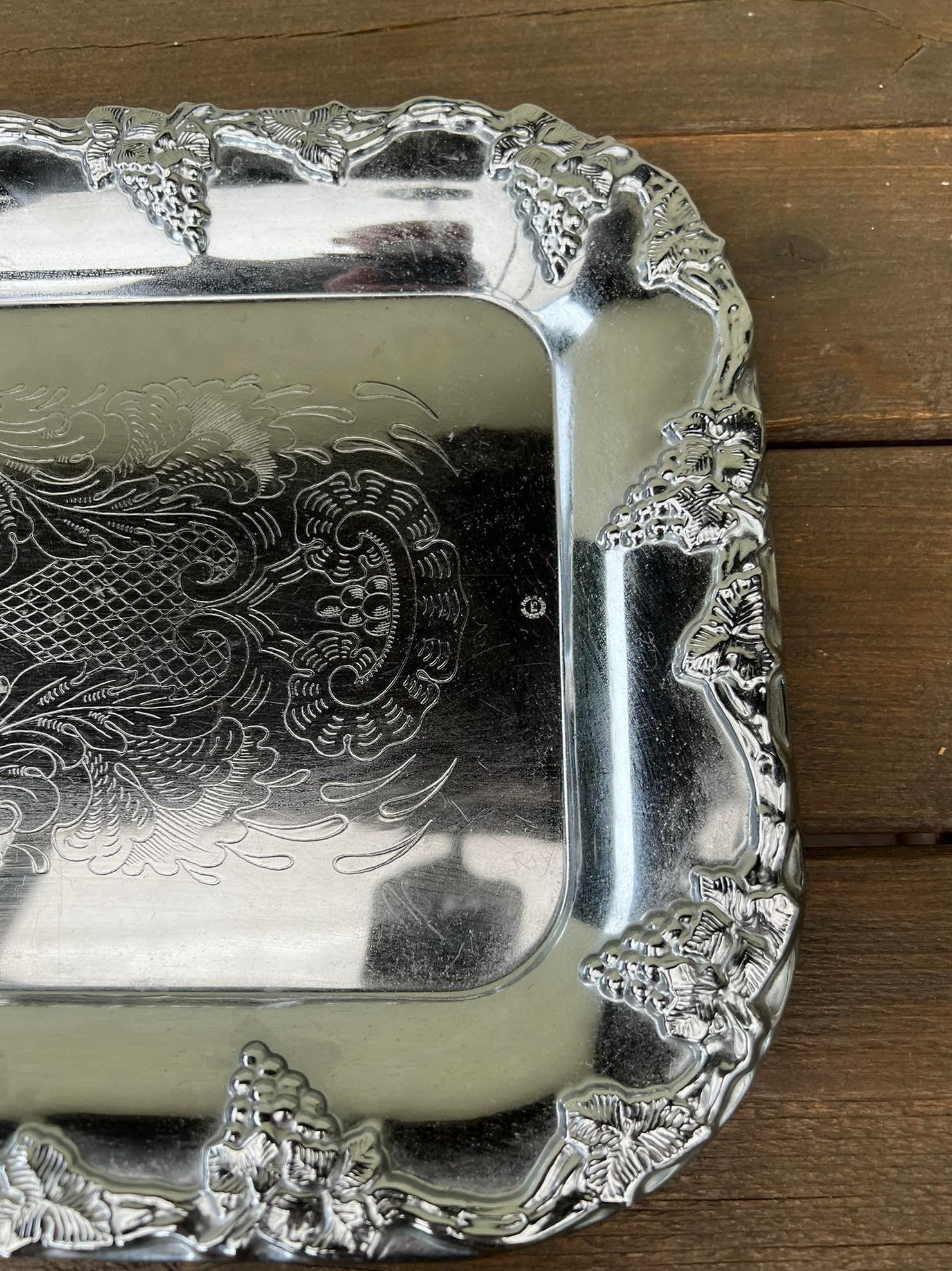 Padėklas metalinis puoštas vynuogėmis, chromuotas. Gamintojo spaudas. Kaina 33