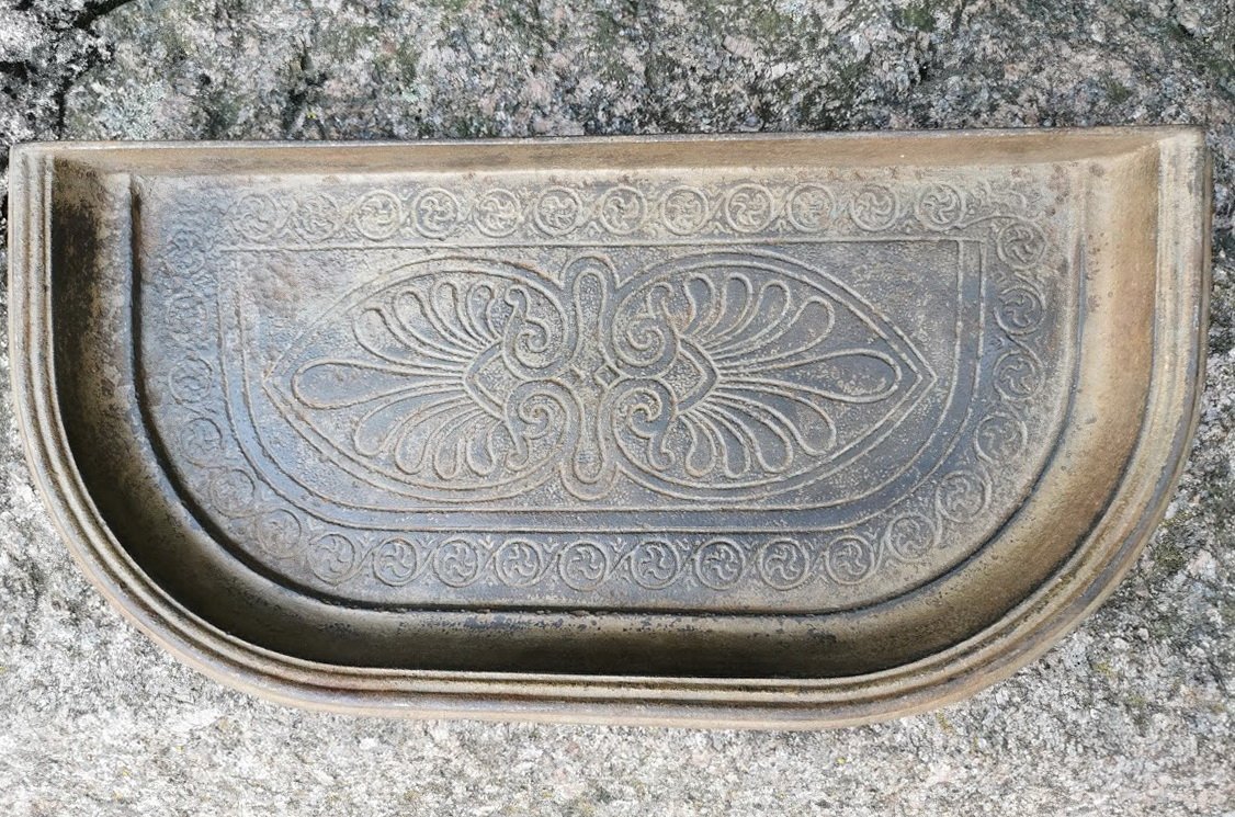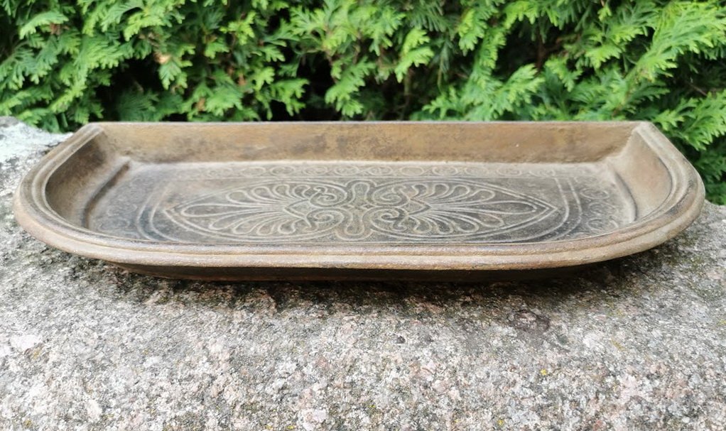 Padėklas prie židinio, krosnies apsaugoti nuo karštų žarijų. Sunkus, pagamintas iš ketaus, špižinis, antikvarinis. Didelis. Ilgis 40, plotis 19, aukštis 4 cm. Svoris: 2,2 kg. Kaina 72