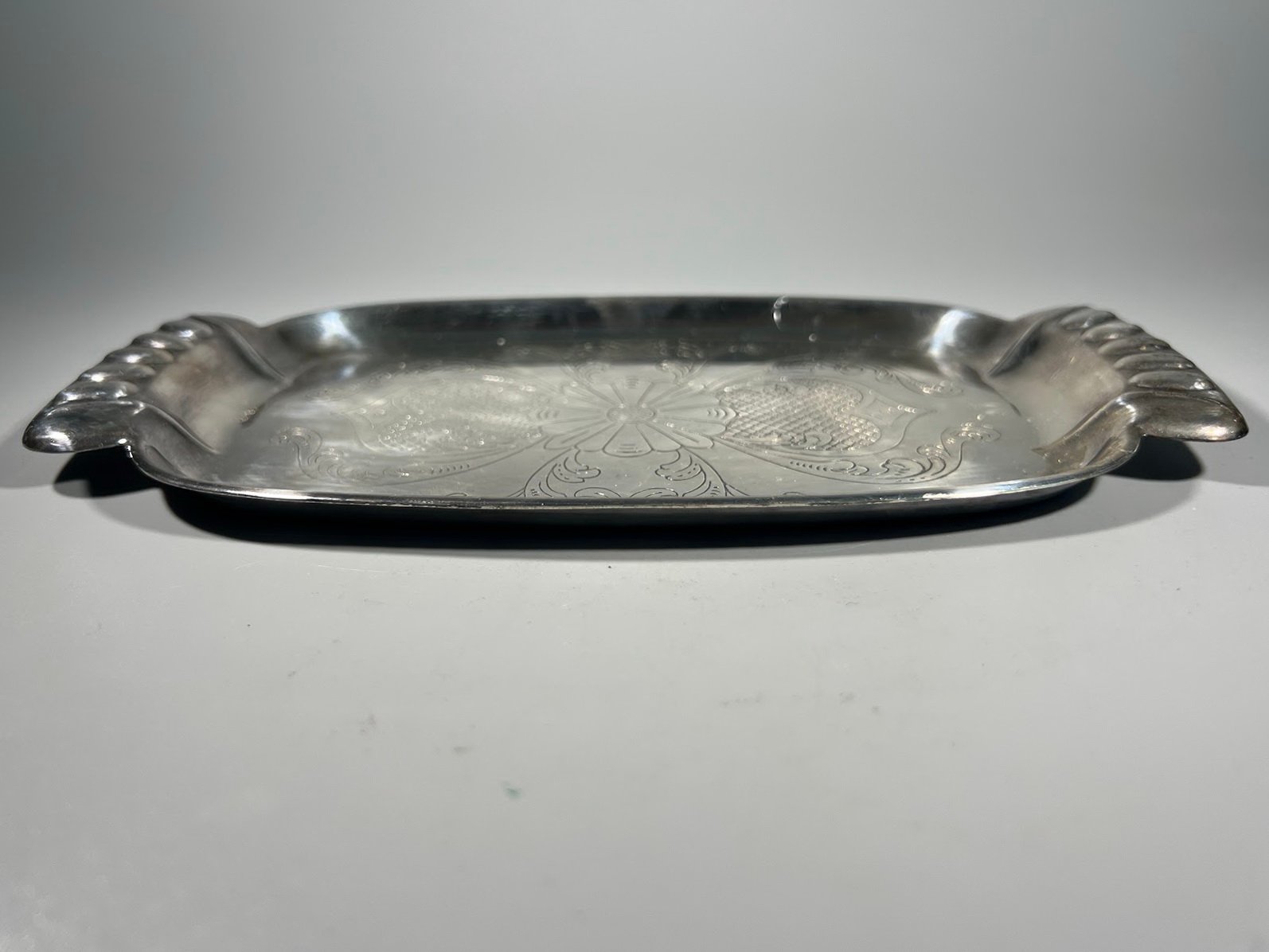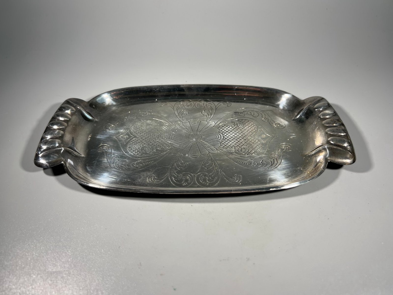 Padėklas sidabruotas, nedidelis, ALE N.S. Dydis: 12 x 22 cm. Kaina 17