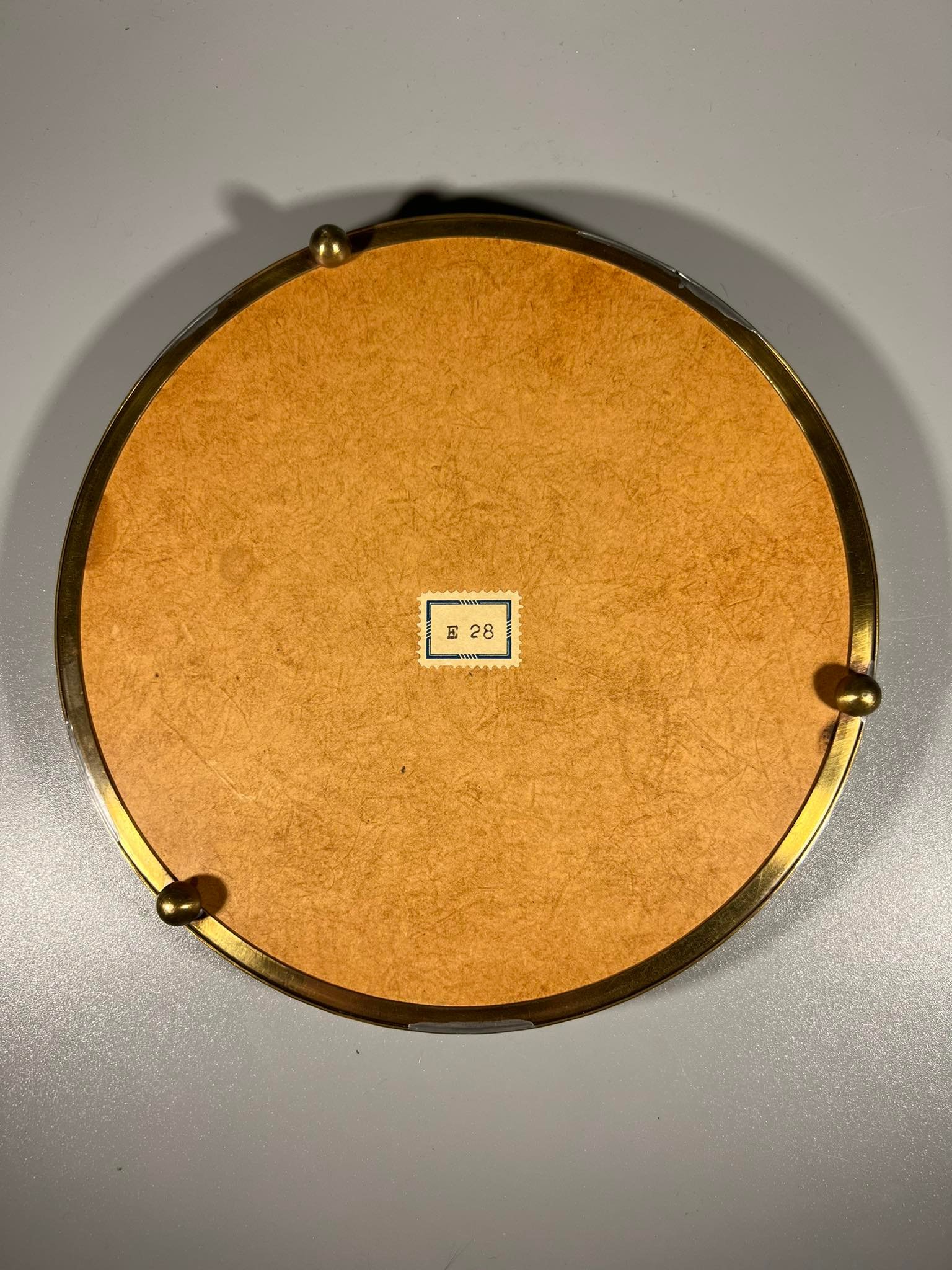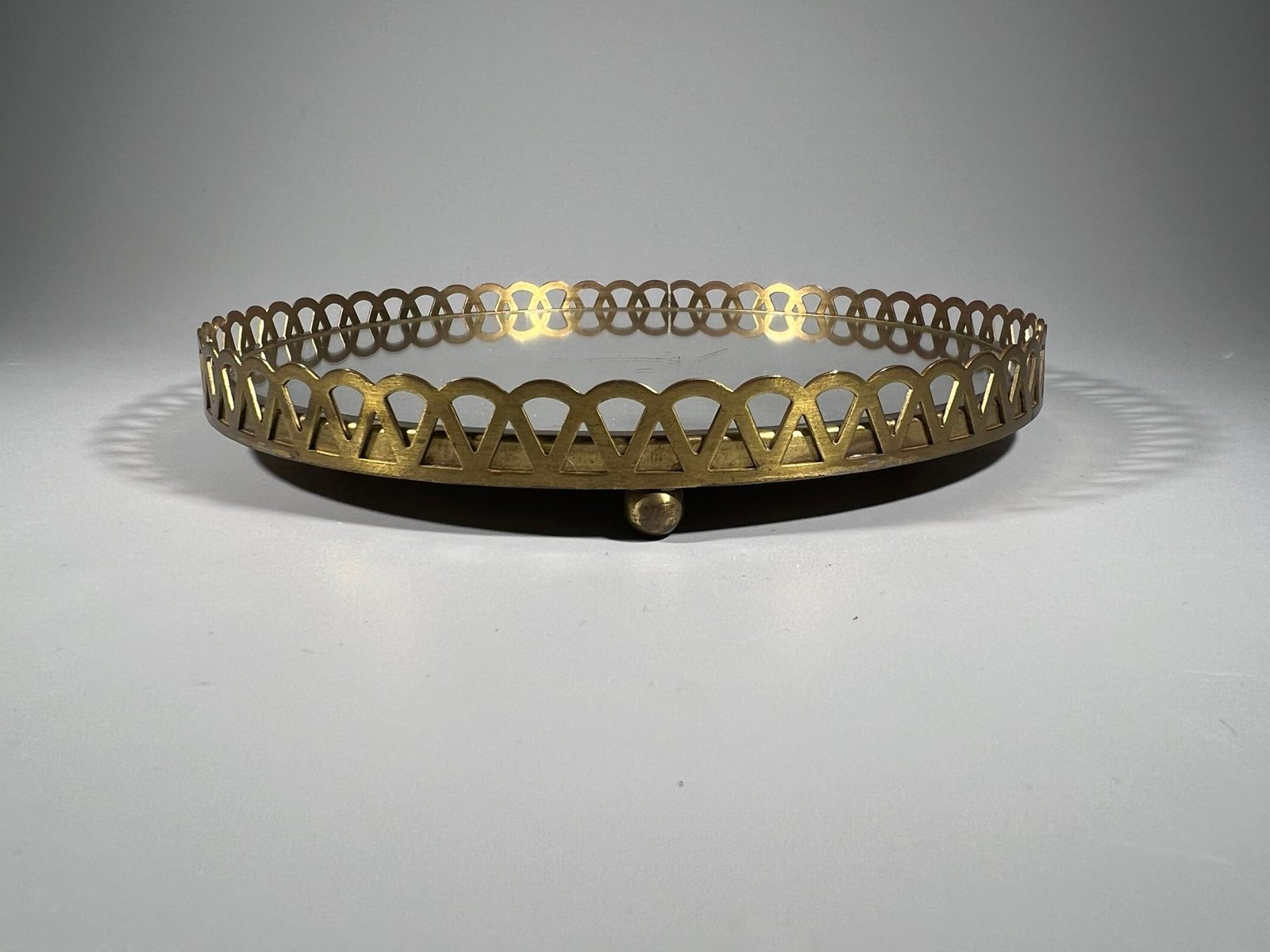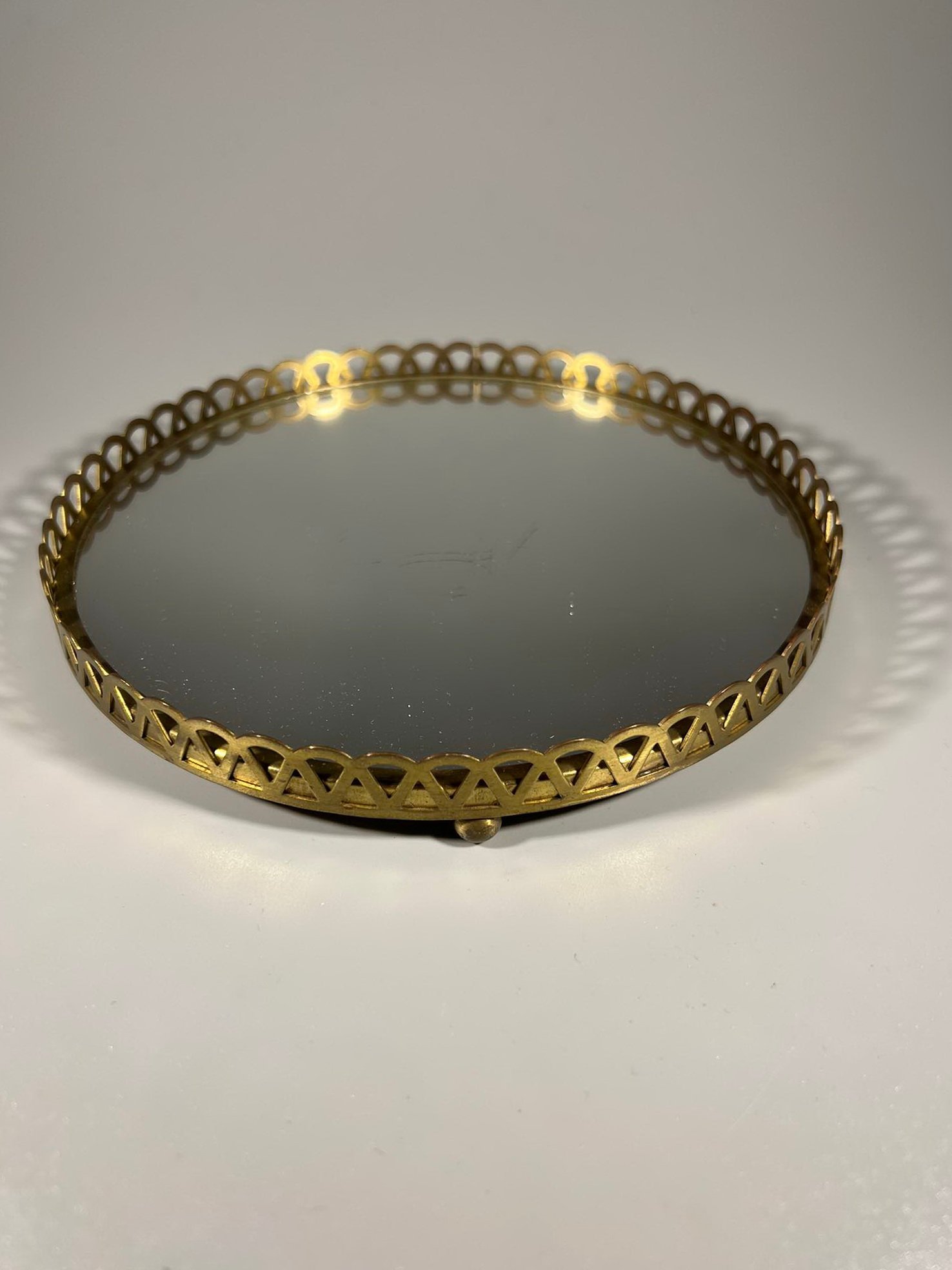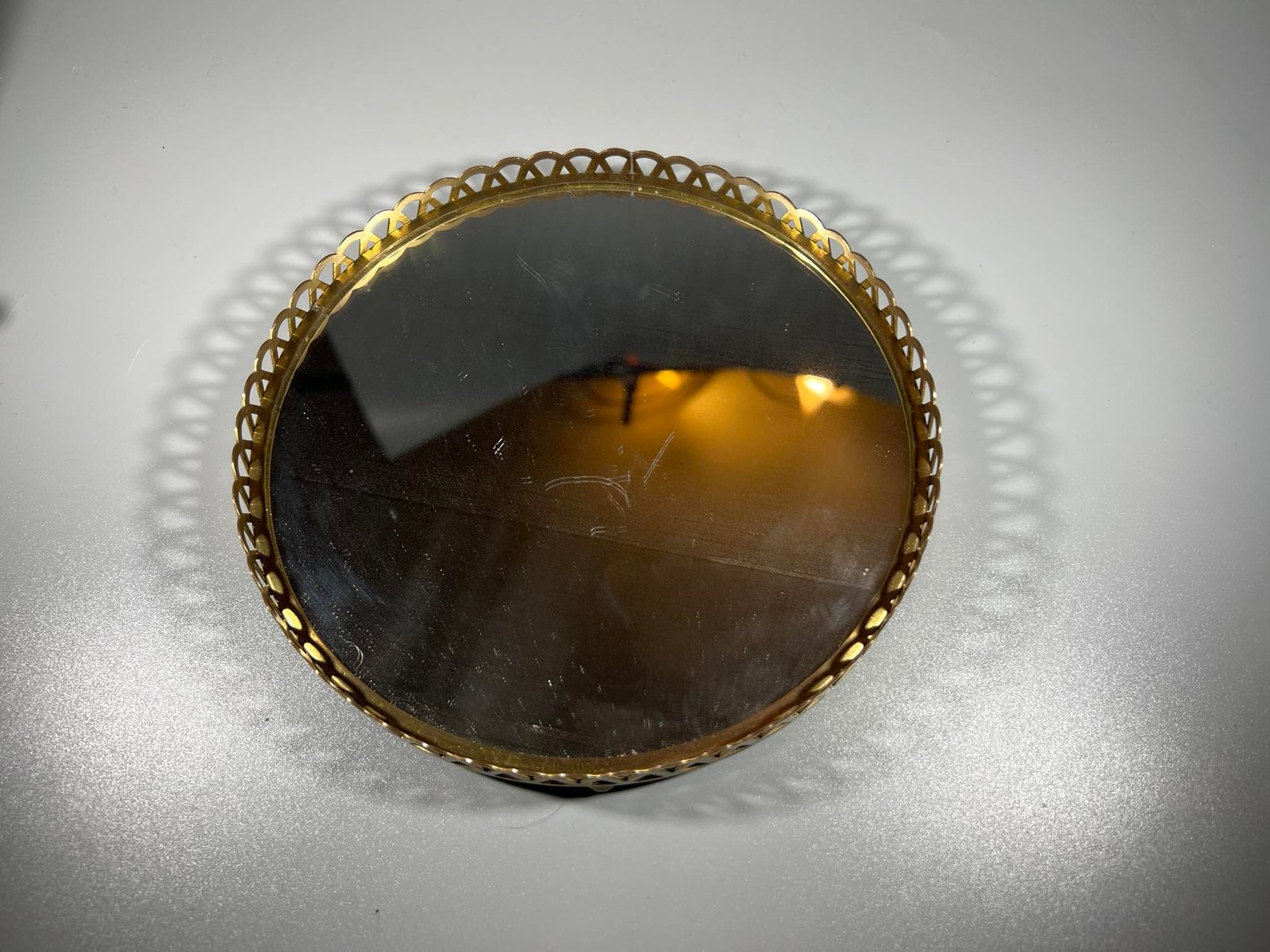 Padėklas su veidrodžiu vintažinis. Skersmuo 17 cm. Aukštis 2,5 cm. Kaina 18
