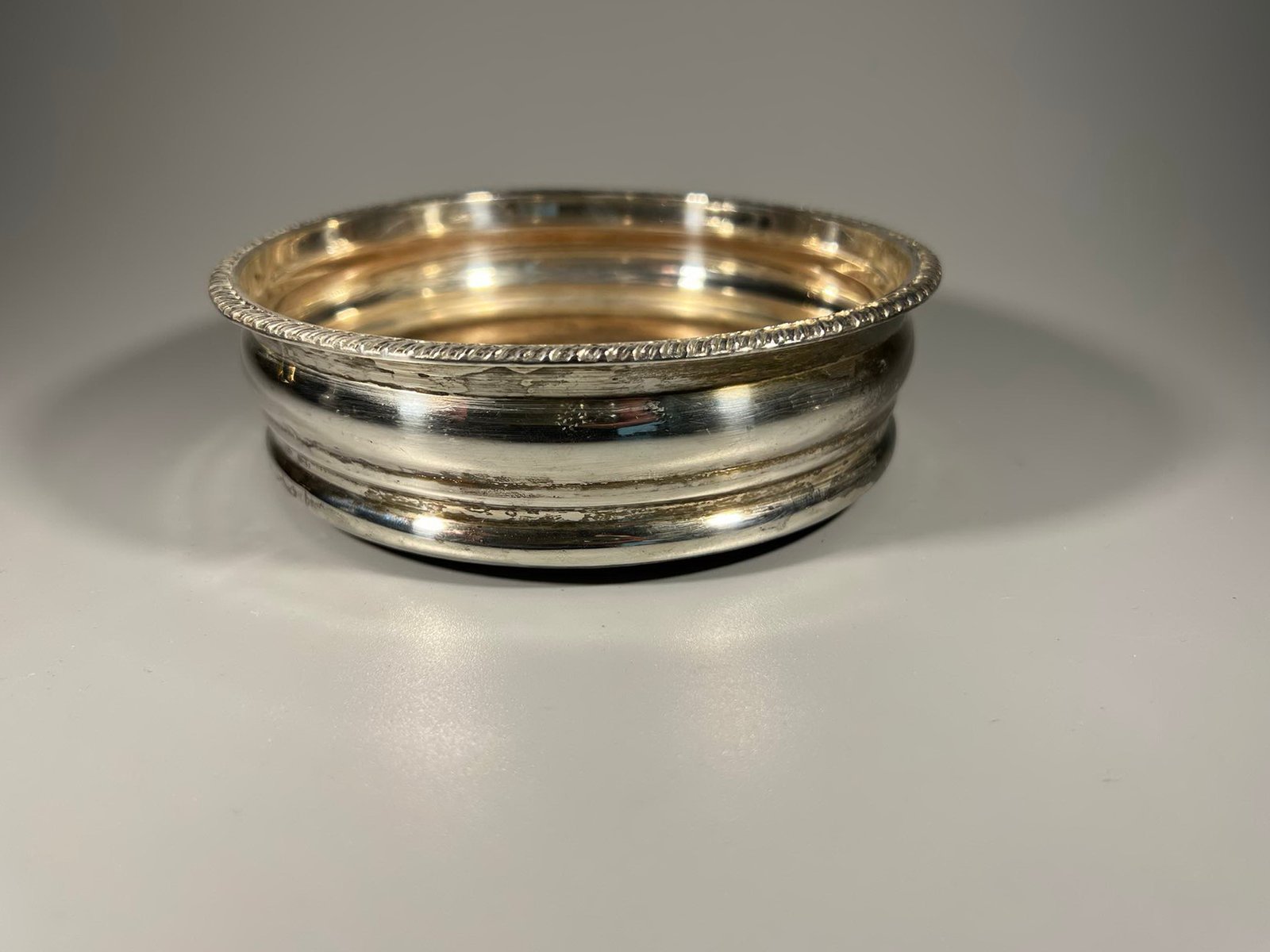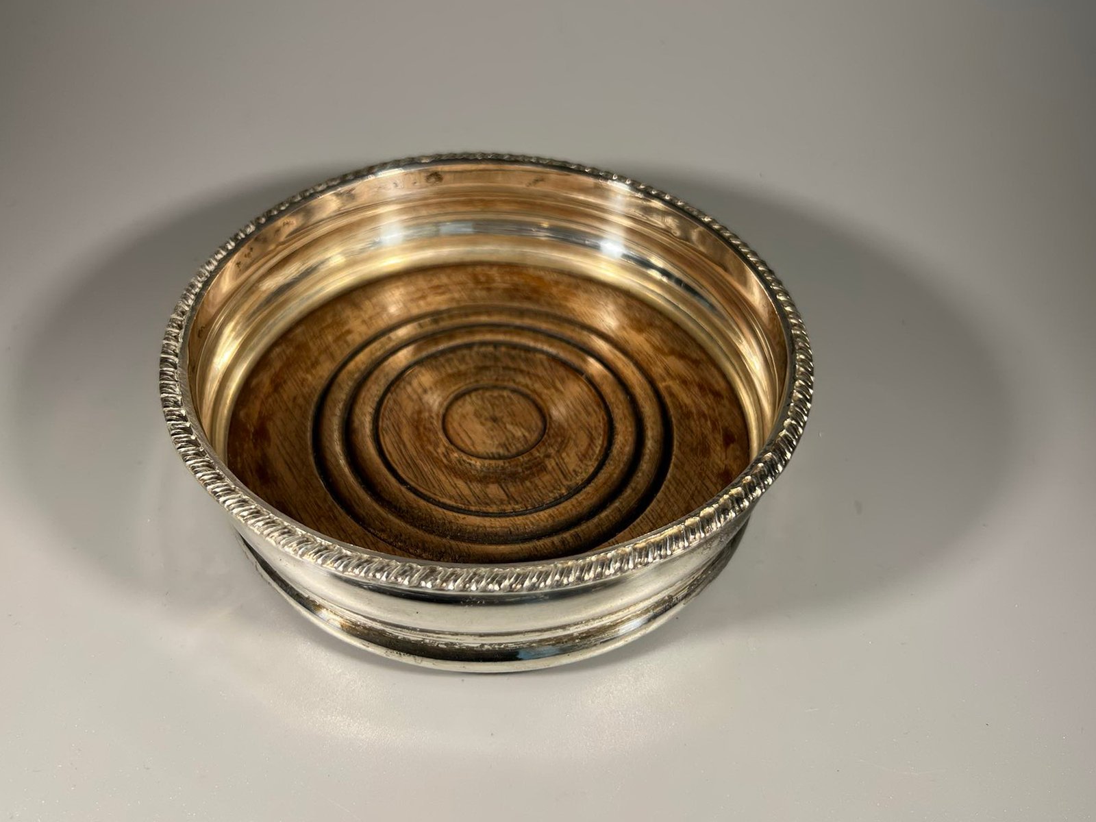 Padėkliukas šampano, vyno buteliui antikvarinis, sidabruotas. Aukštis 3,8 cm. Skersmuo 13,5 cm. Kaina 23