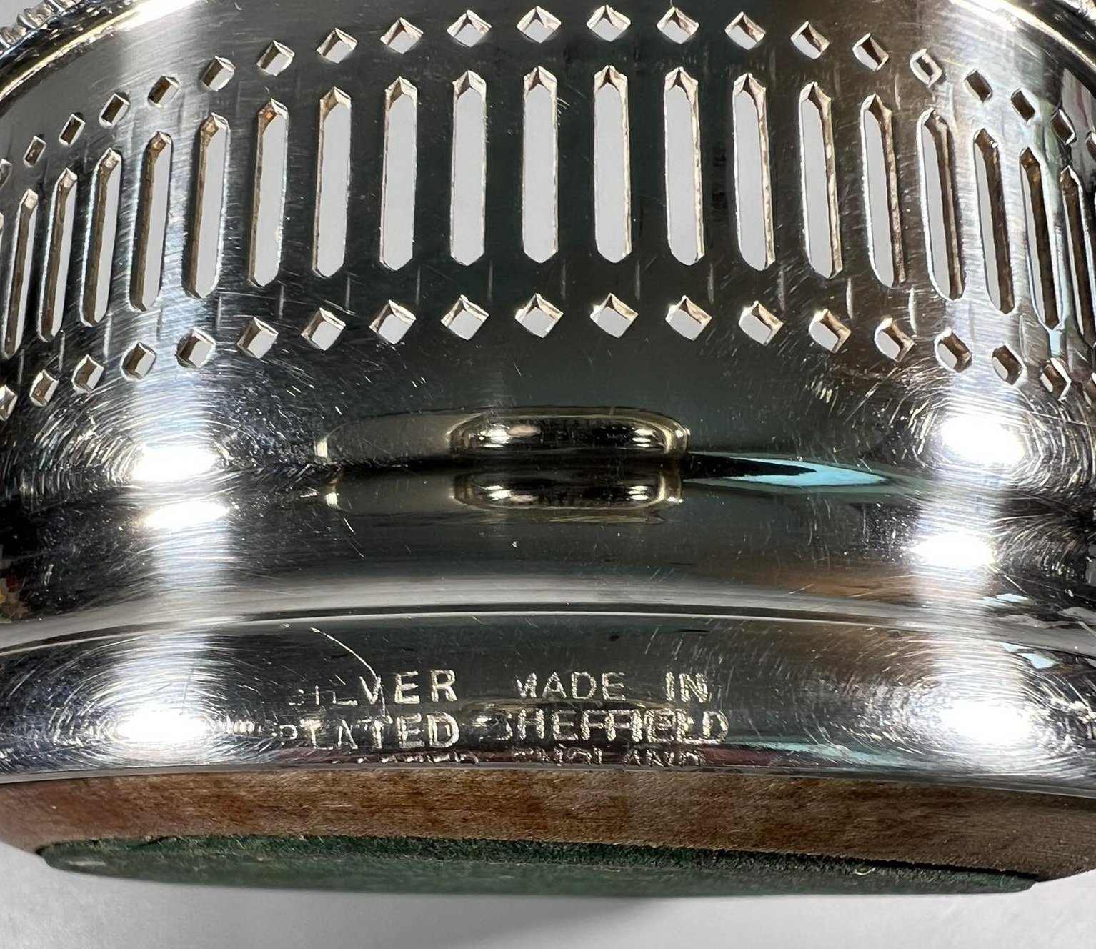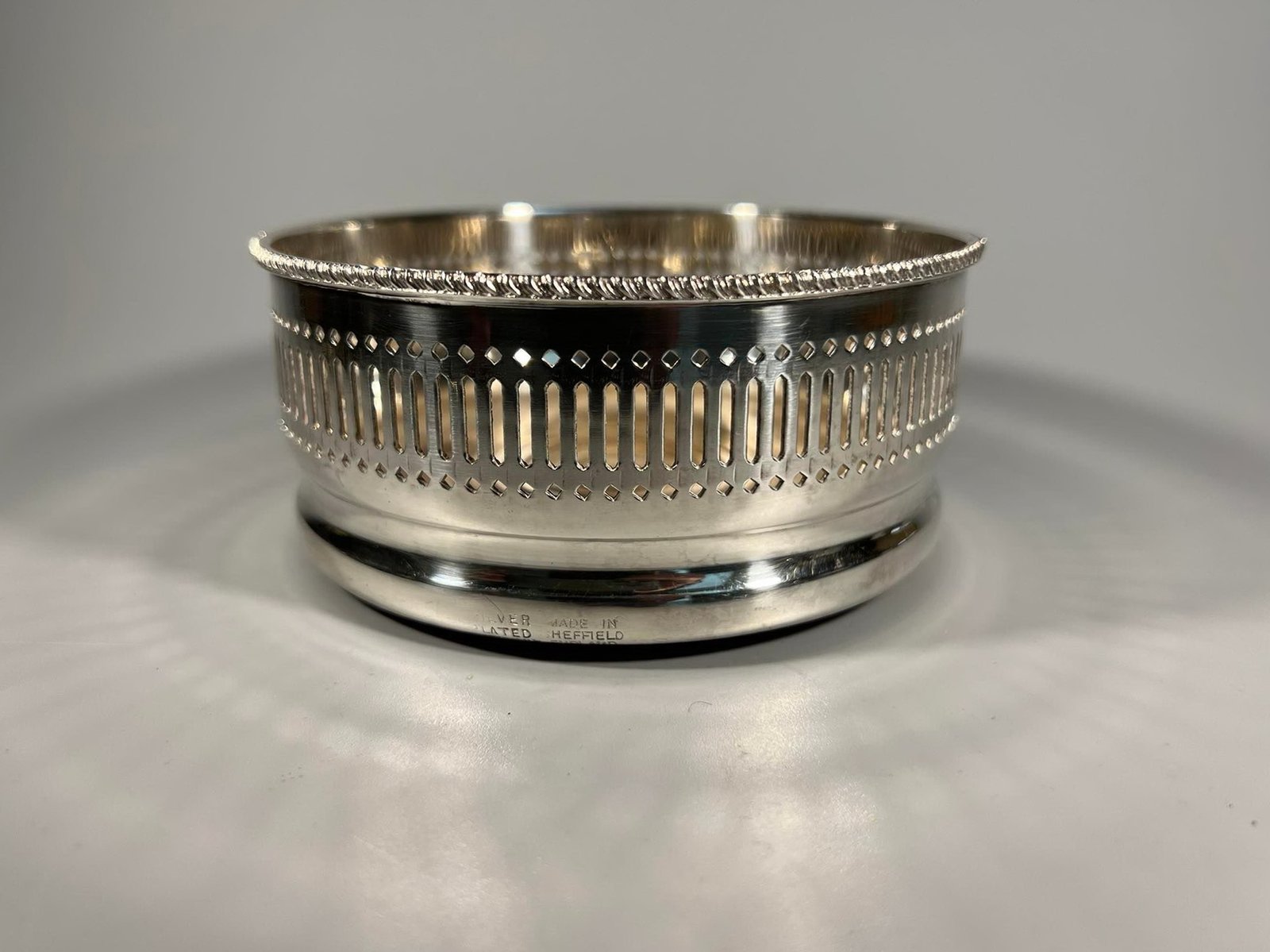 Padėkliukas šampano, vyno buteliui antikvarinis, sidabruotas Silver Plated. Made in Shefield, England. Aukštis 5,5 cm. Skersmuo 11,5 cm. Kaina 36