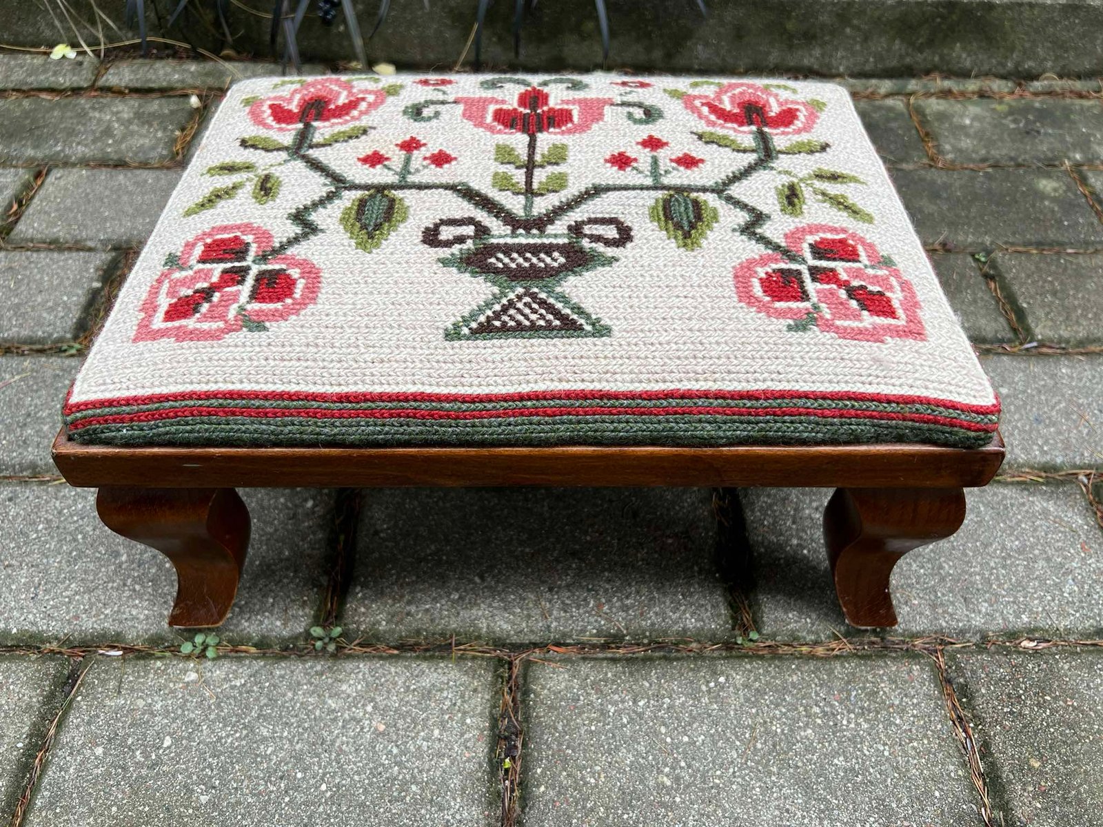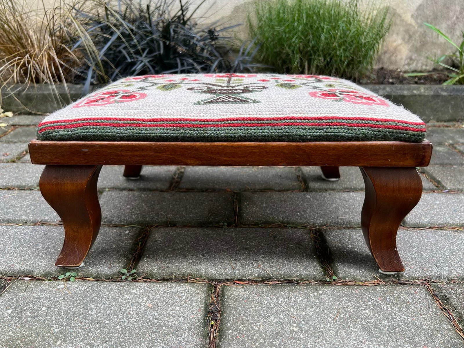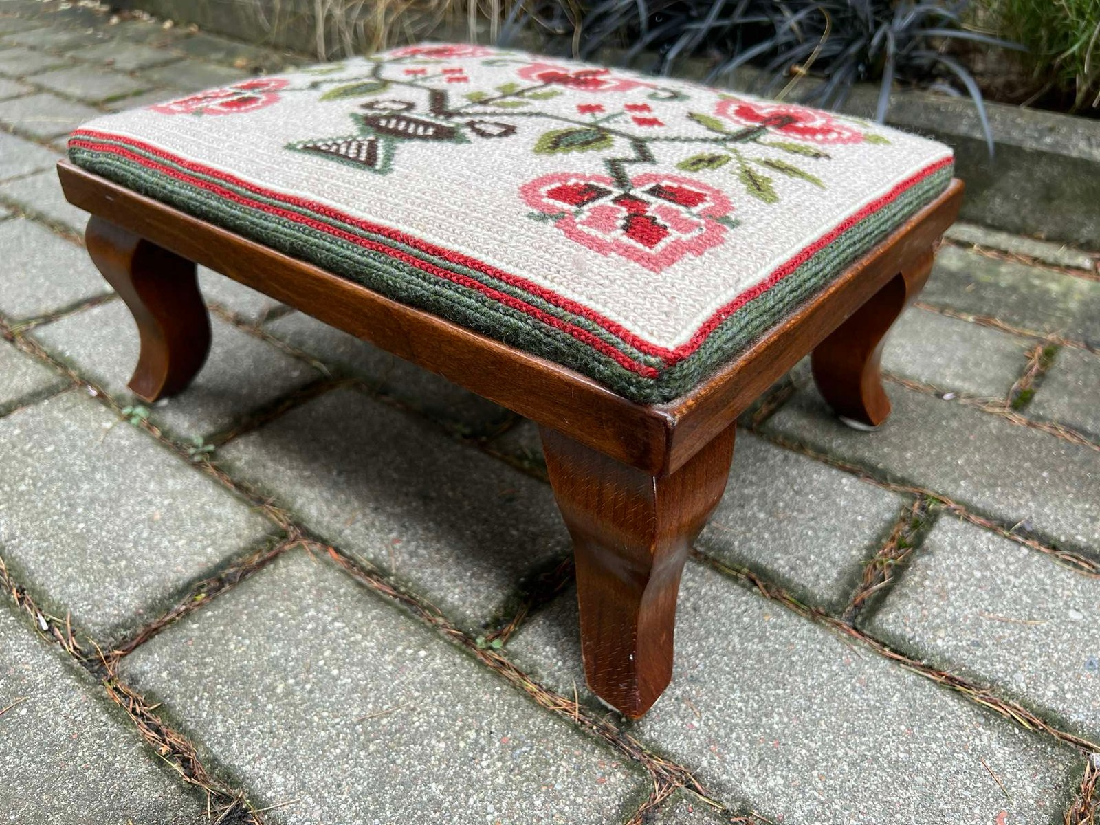Pakojis antikvarinis, siuvinėtas, mažas suolelis. Kaina 53