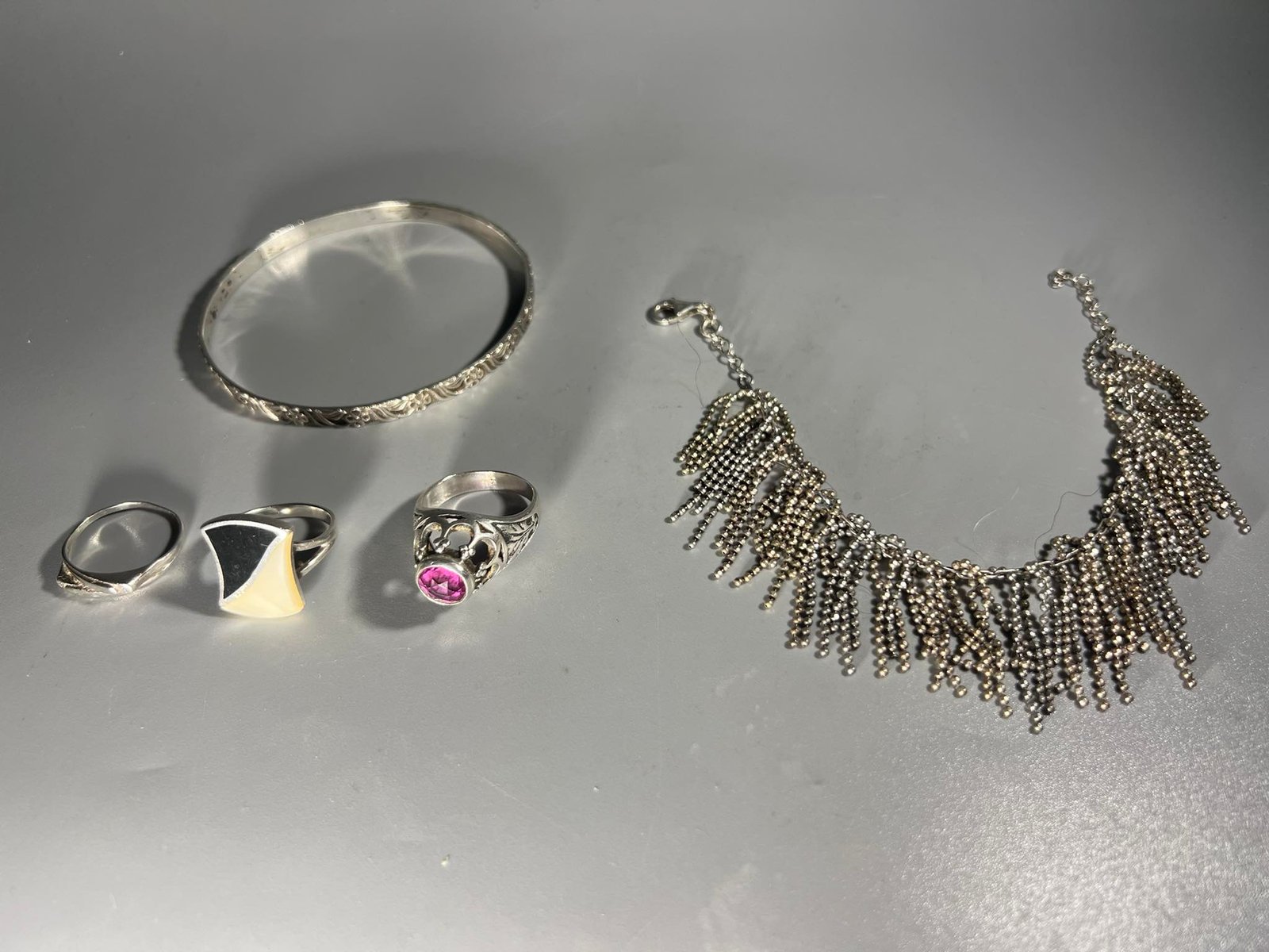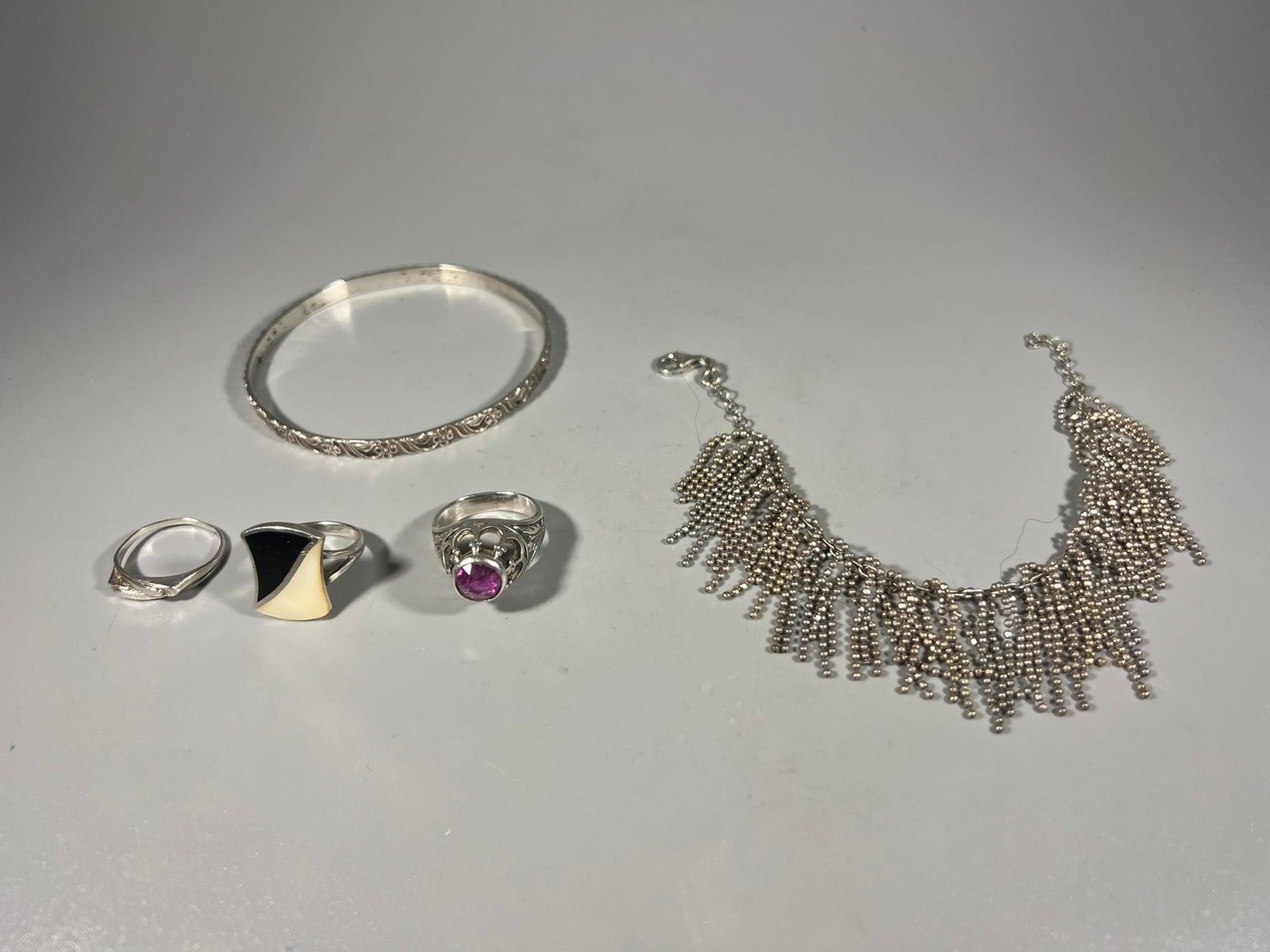 Papuošalai sidabriniai. 5 vnt. Prabos: 875, 925. 3 žiedai ir 2 rankos apyrankės. Kaina 83 už viską.