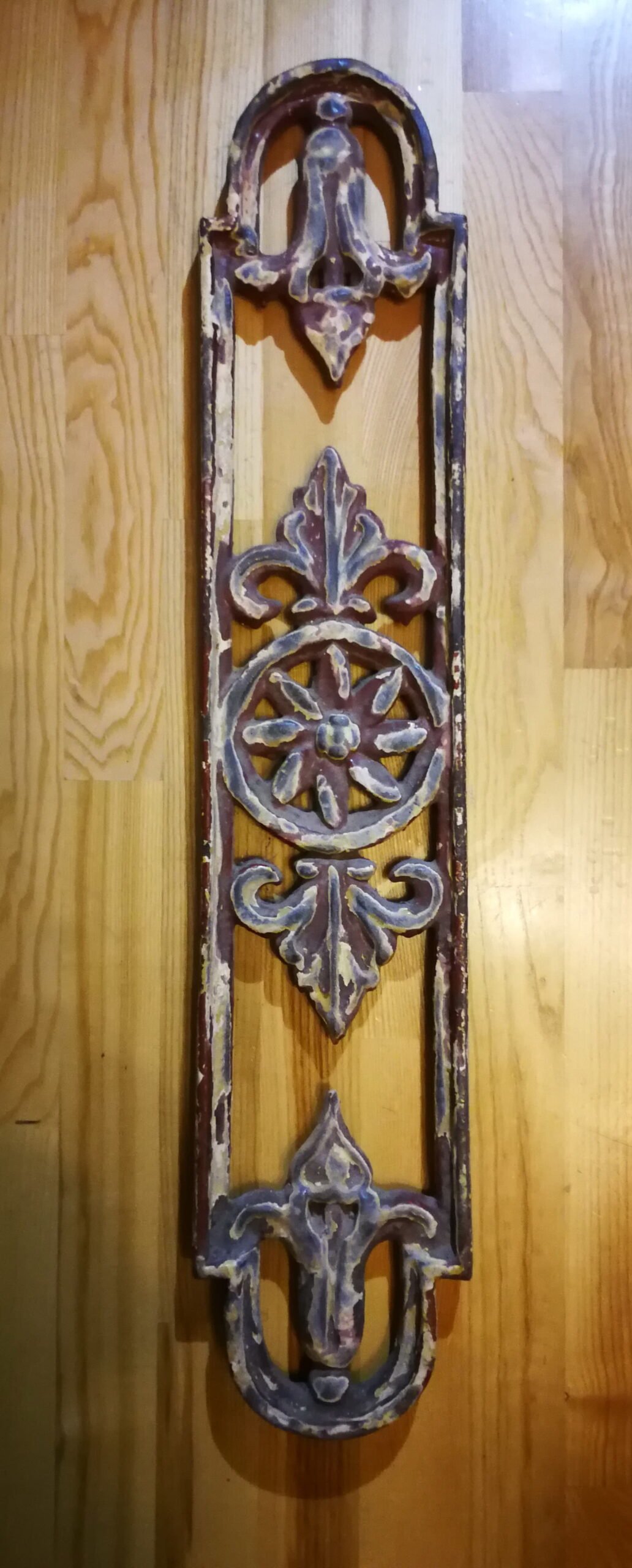 Papuošimas, antikvarinė interjero/eksterjero detalė. Ketus (špižinė), sunki. Ilgis 66, plotis 13, storis 3 cm. Kaina 127