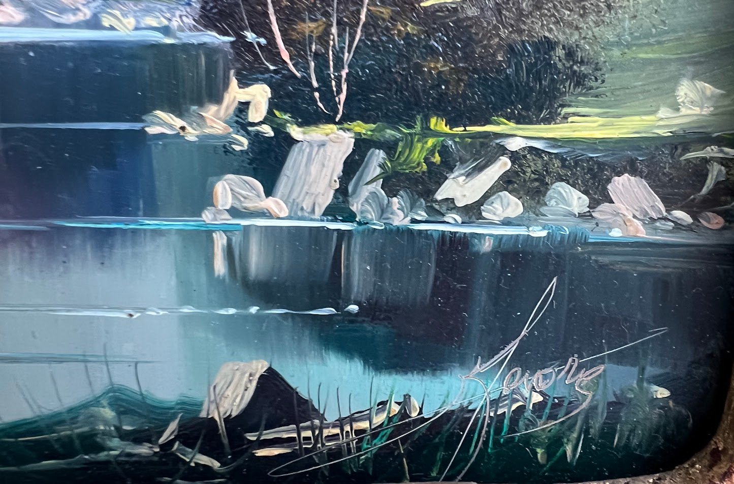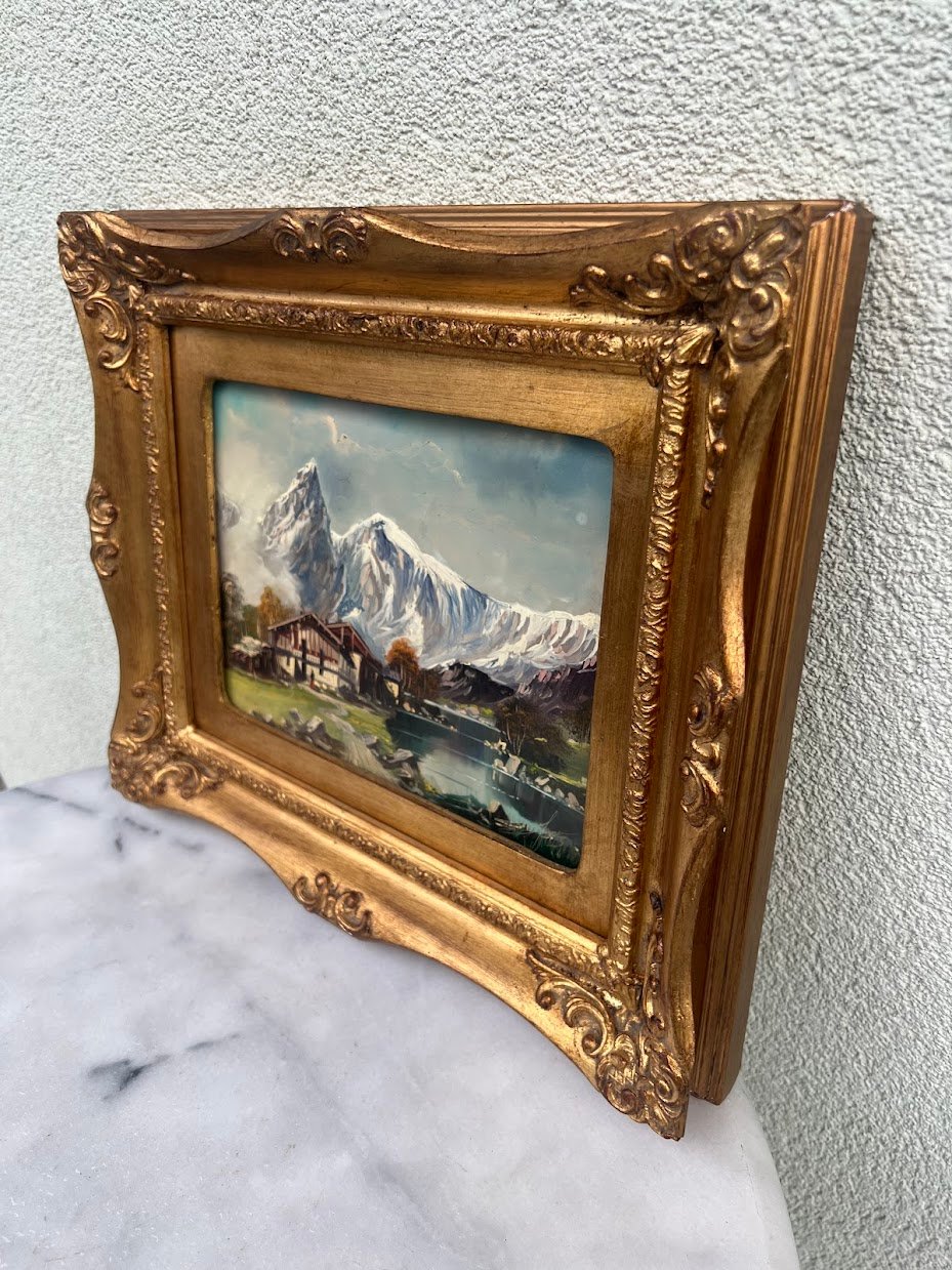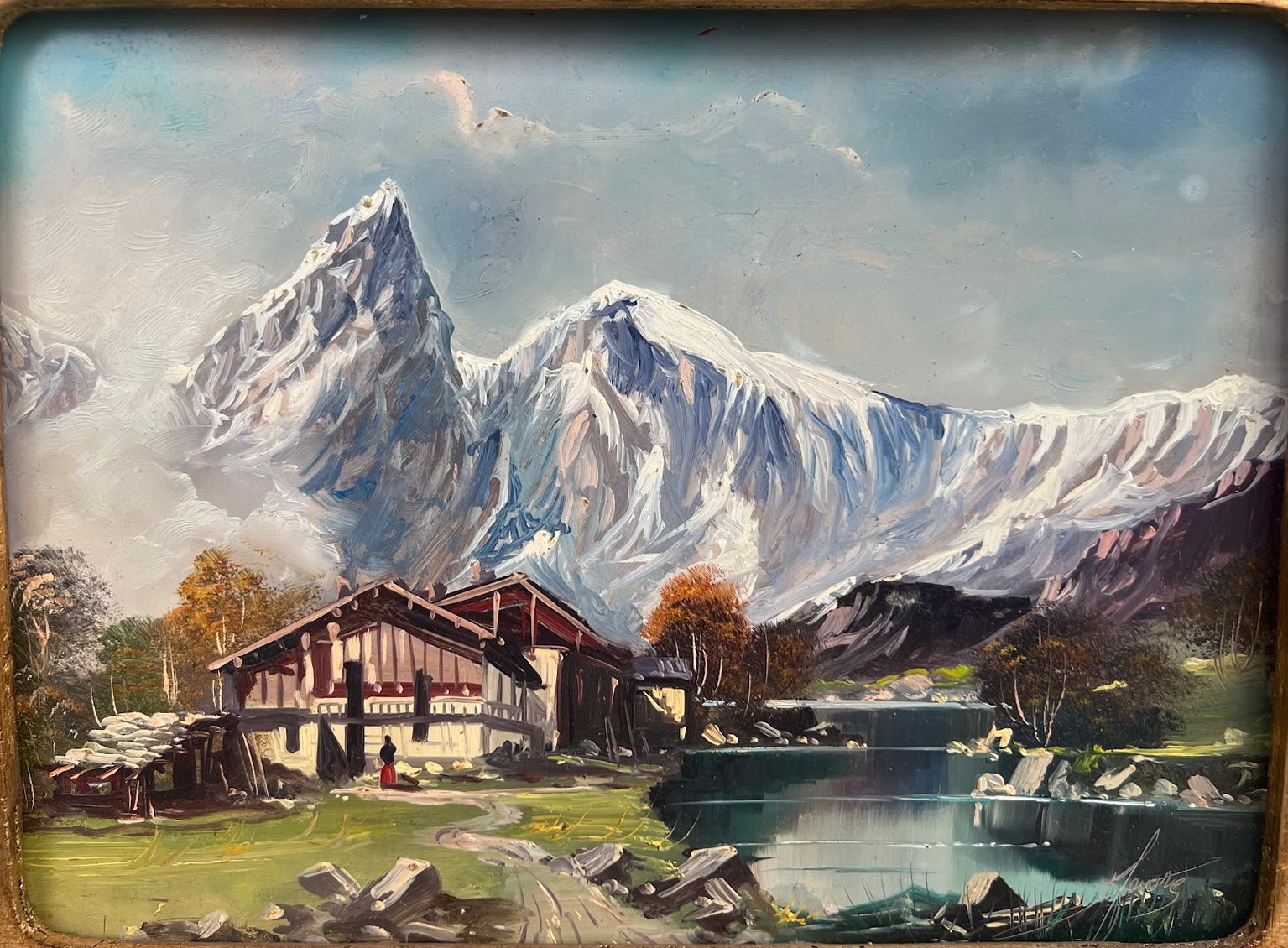 Paveikslas Alpių peizažas. Kartonas, aliejus. Išorinis medinio rėmo dydis: 31 x 37 cm. Kartono dydis: 22,5 x 28, 5 cm. Kaina 78