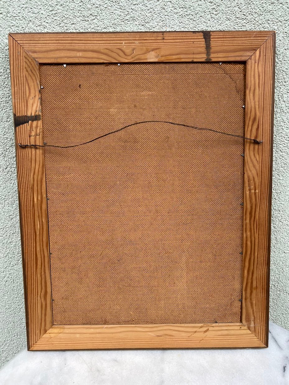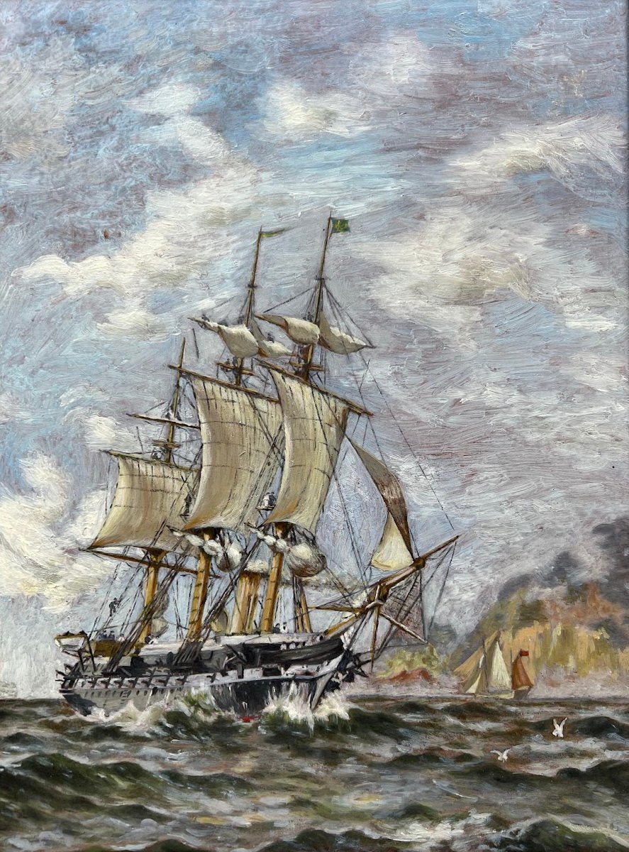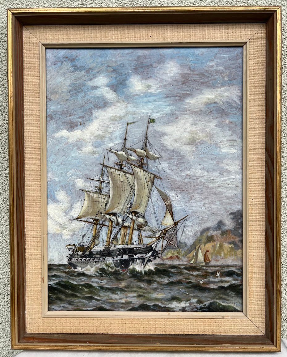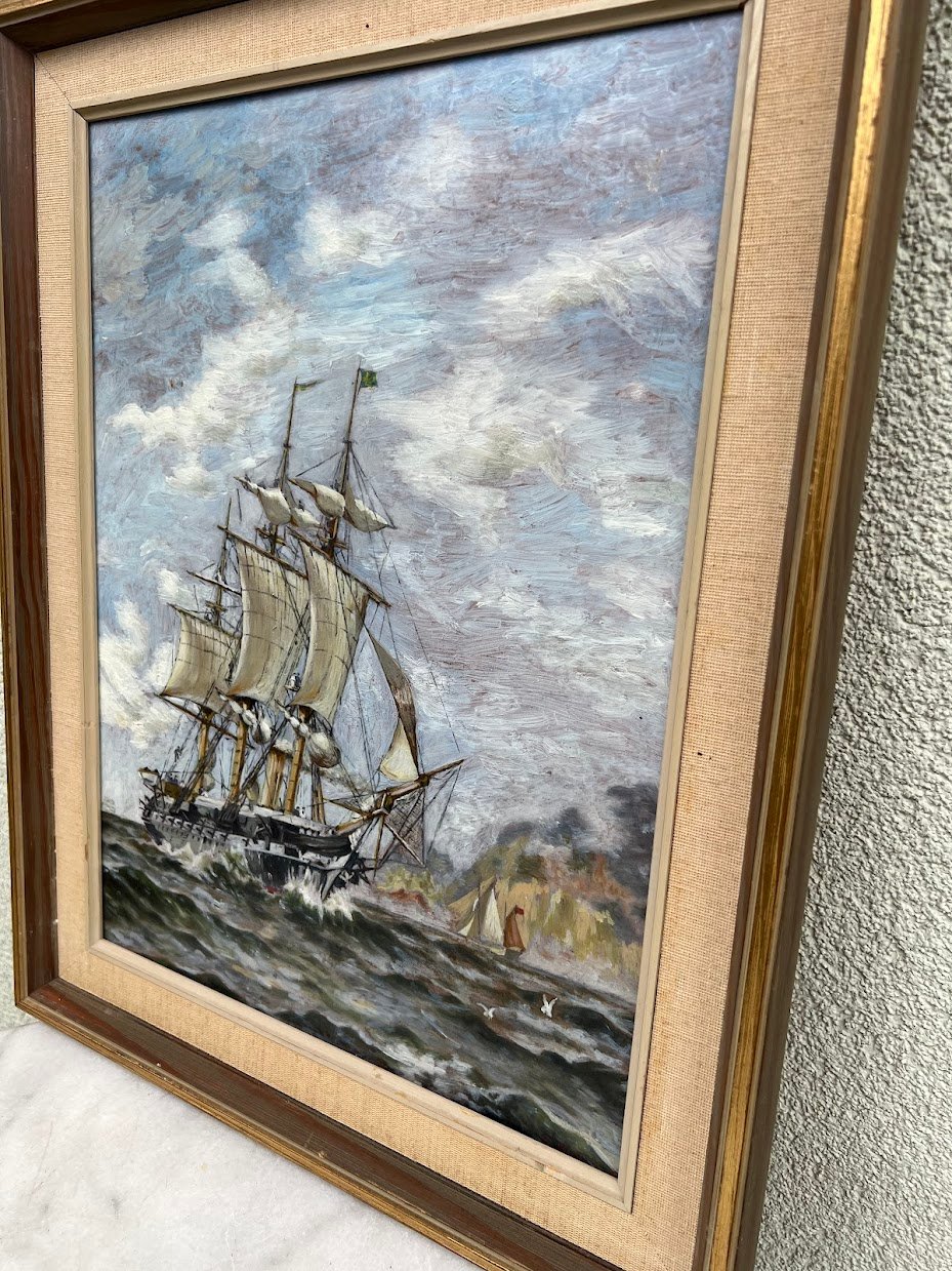 Paveikslas Burlaivis. Kartonas, aliejus. Išorinis rėmo dydis: 38 x 48 cm. Paveikslo dydis: 30 x 40 cm. Kaina 58