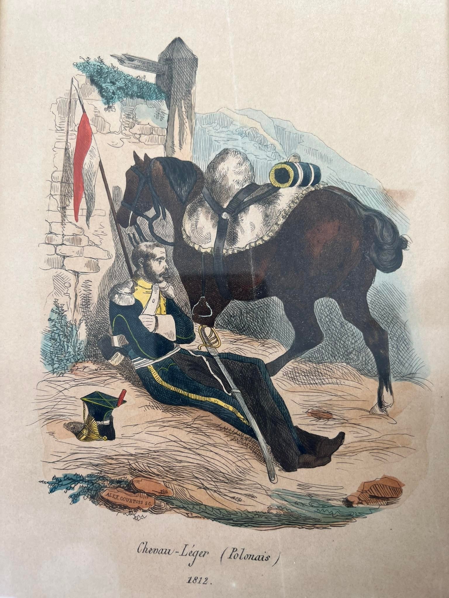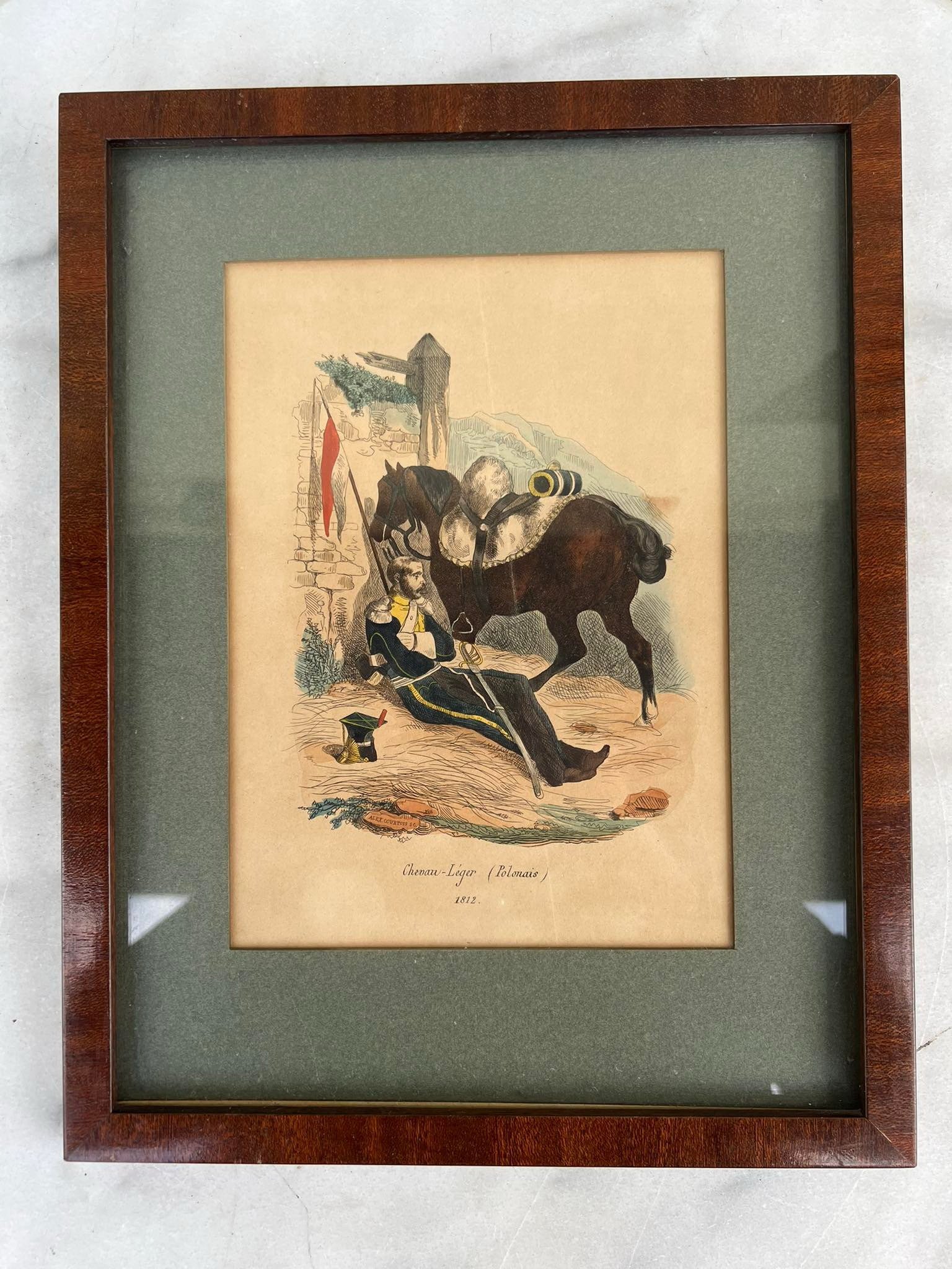Paveikslas, grafika antikvarinė militaristine tema, Napoleono laikų. Medinis rėmelis, stiklas. Prancūzija. Kaina 68