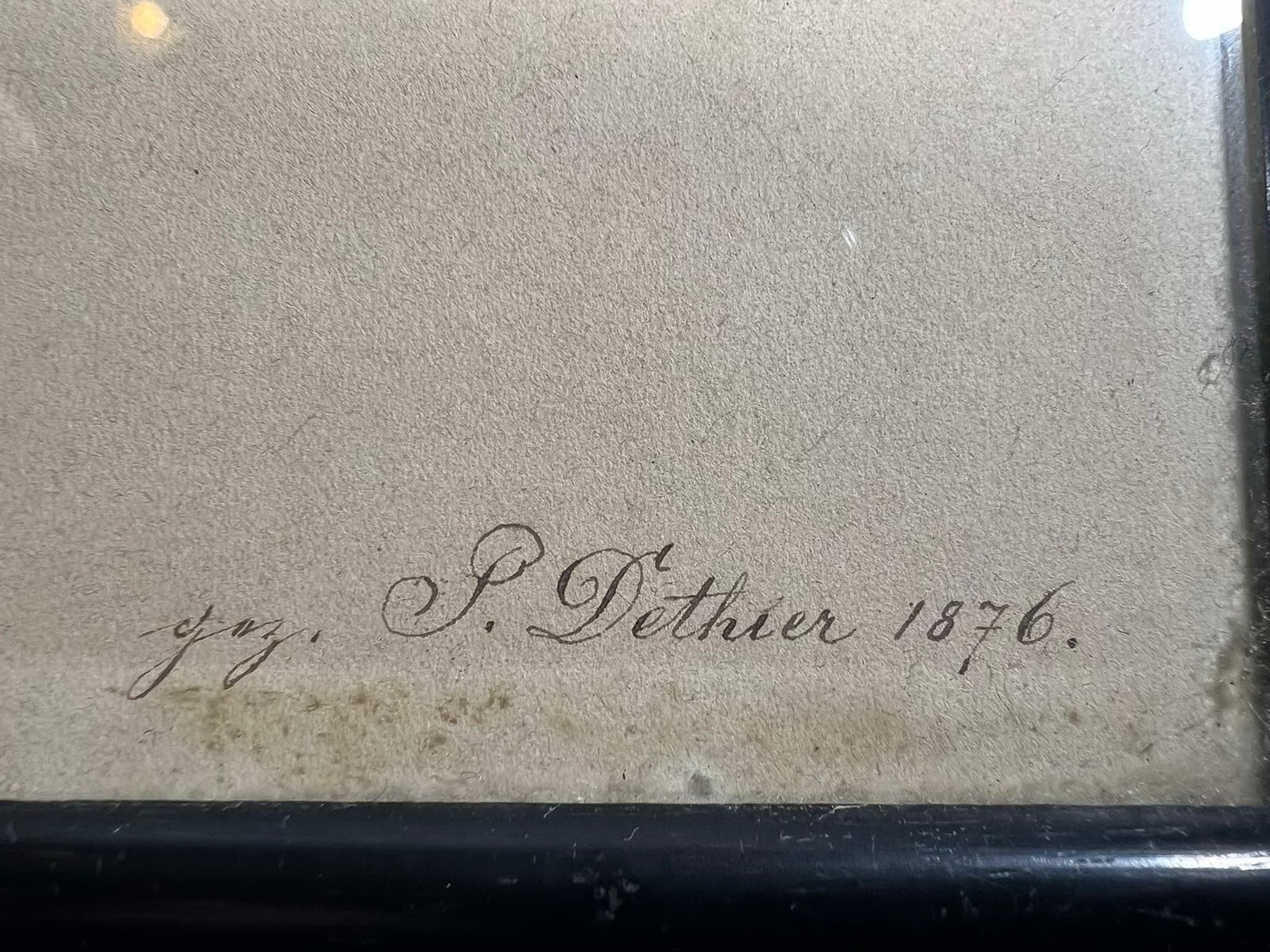 Paveikslas graviūra antikvarinė Jaunos moters portretas. P. Dethier. Pieštukas, popierius, signatūra P. Dethier, 1876 m. Dydis: 21 x 29 cm. Kaina 63