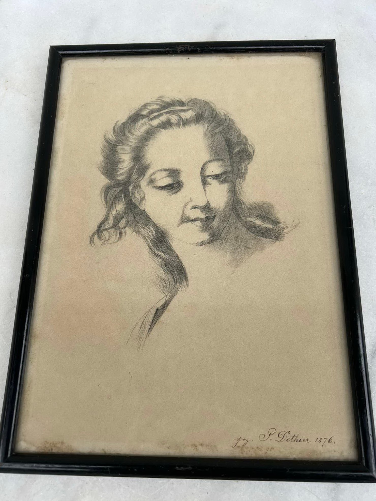 Paveikslas graviūra antikvarinė Jaunos moters portretas. P. Dethier. Pieštukas, popierius, signatūra P. Dethier, 1876 m. Kaina 63
