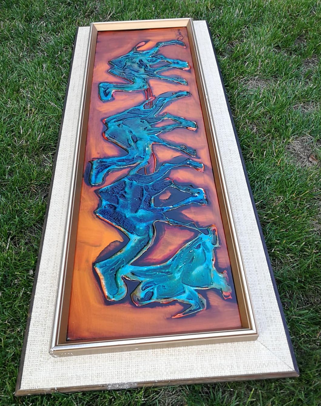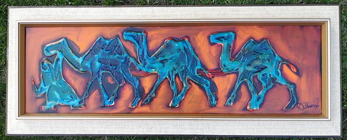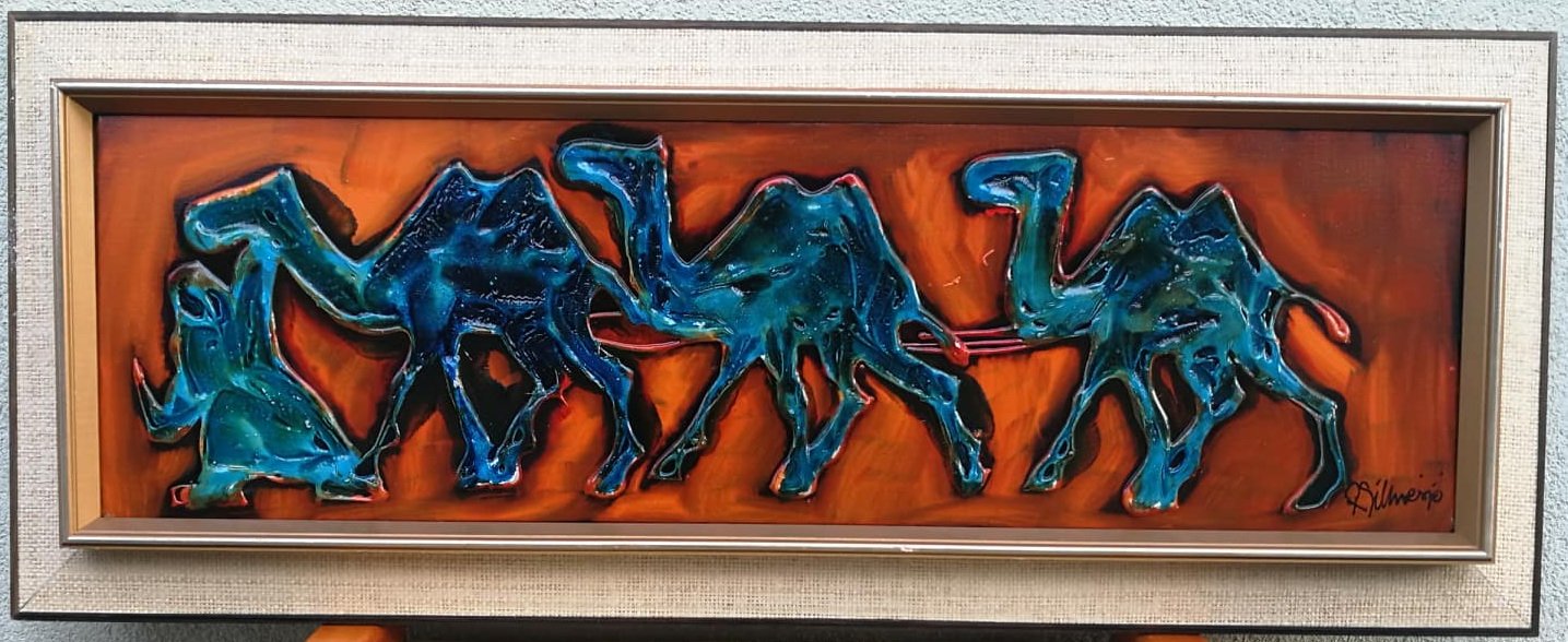 Paveikslas Kupranugariai, rytietiškais motyvais. Drobė. Drobės dydis: 102 x 32 cm. Išorinis rėmo dydis: 115 x 46 cm. Kaina 42
