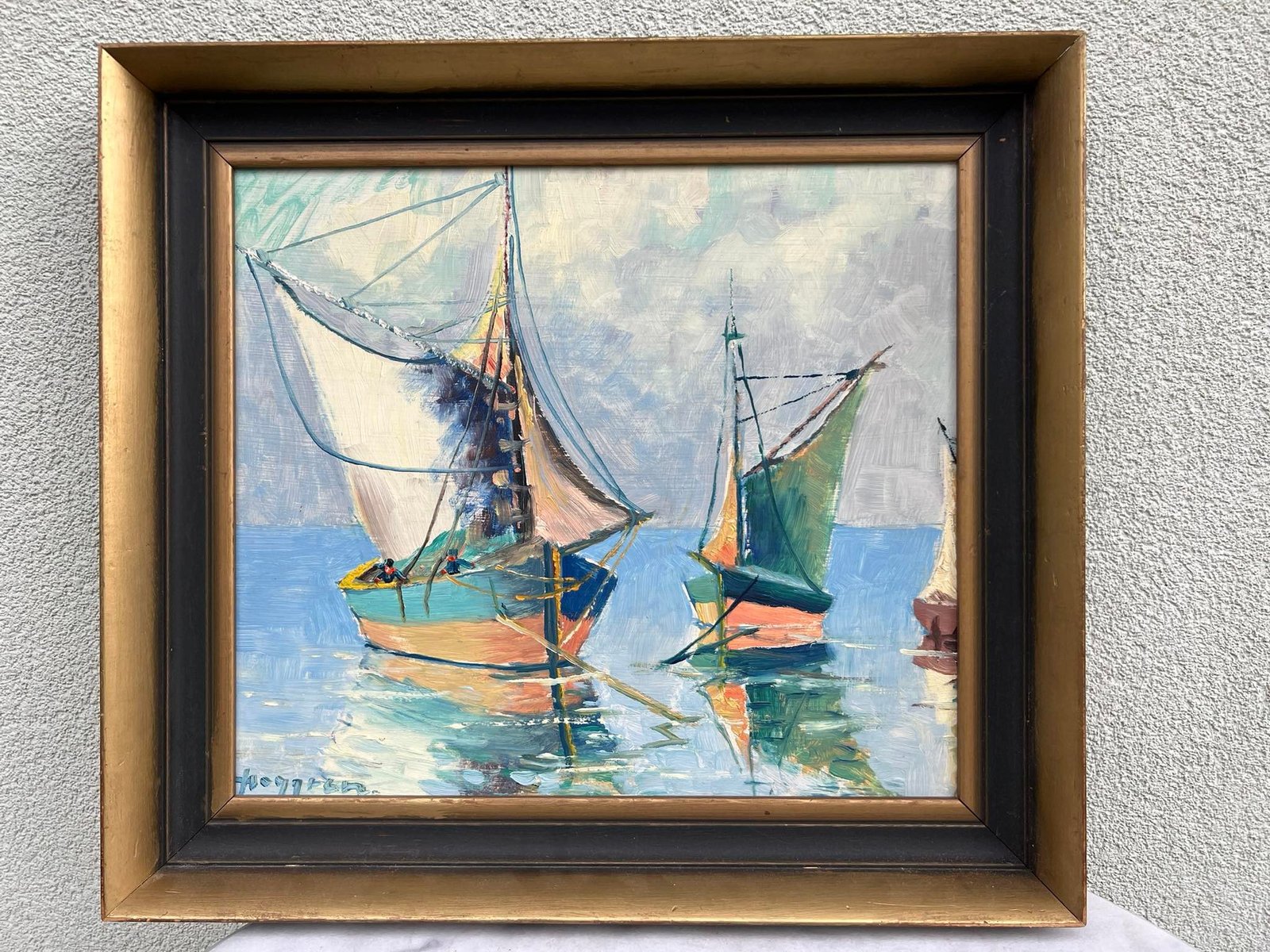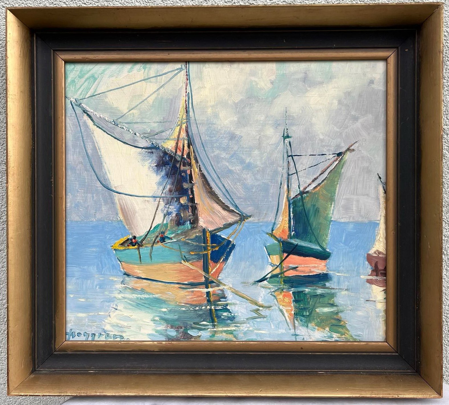 Paveikslas Laivai, marinistinis. Kartonas, aliejus. Išorinis rėmo dydis: 45 x 50 cm. Paveikslo dydis: 36 x 41 cm. Kaina 78