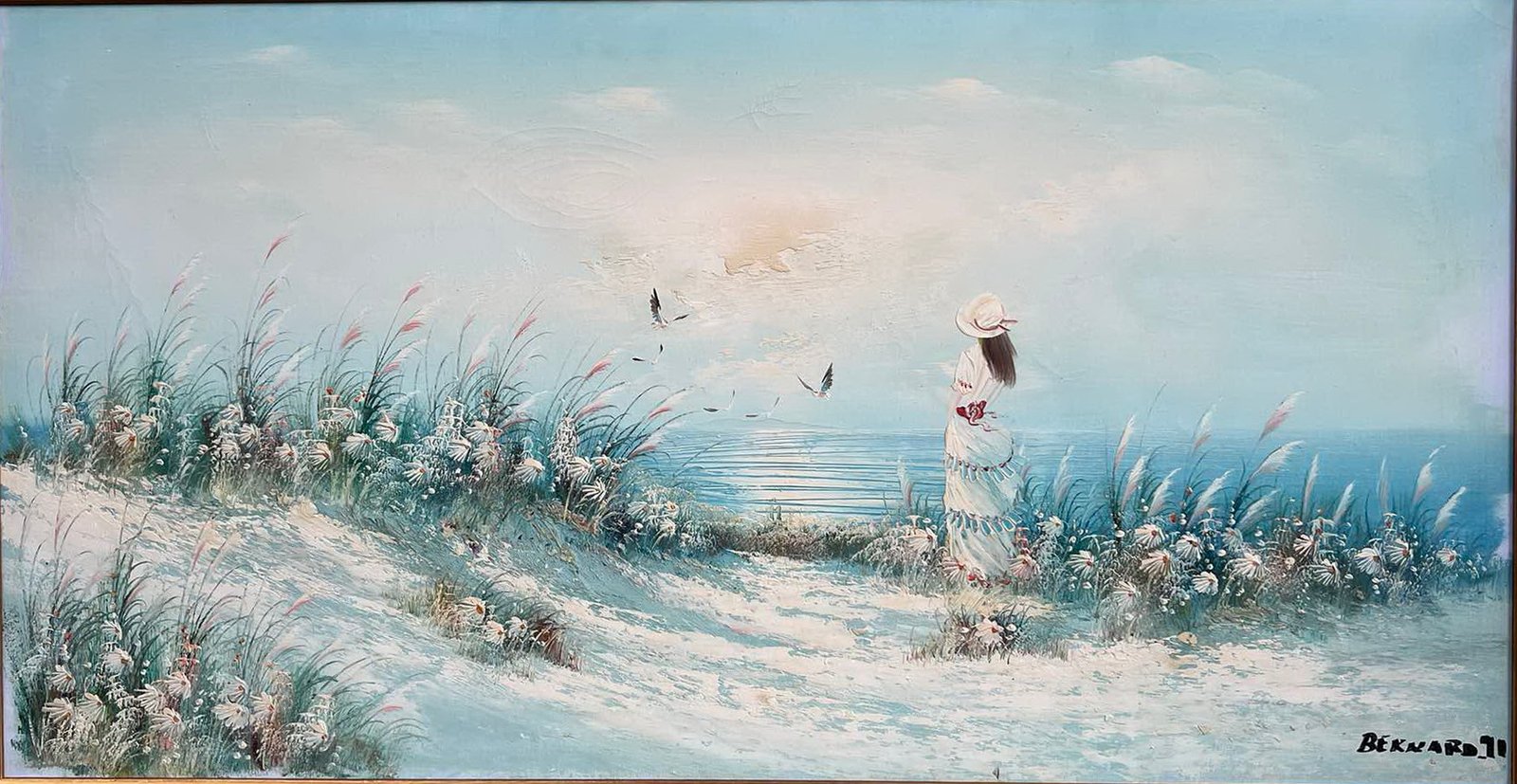 Paveikslas Mergina prie jūros. Drobė, aliejus. Paveikslo dydis: 45 x 85 cm. Medinio rėmo plotis 3 cm. Kaina 138