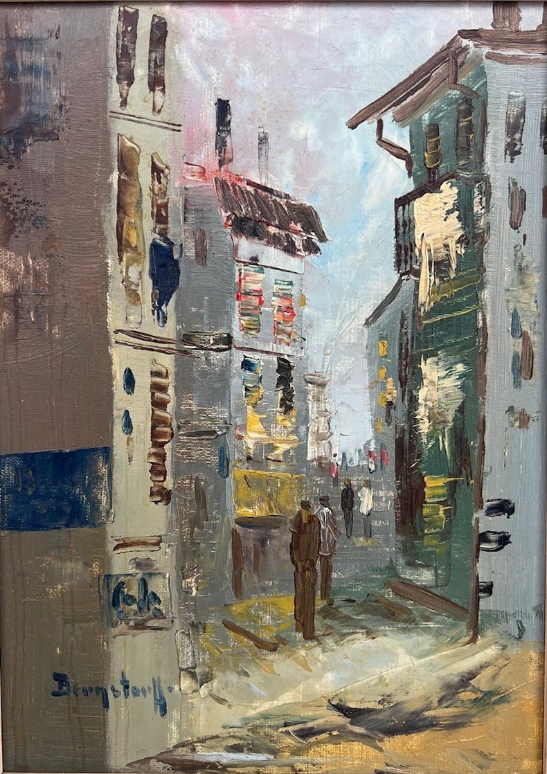 Paveikslas Miestas, urbanistinis peizažas. Drobė, aliejus. Signatūra. Išorinis medinio rėmo dydis: 39 x 37 cm. Kaina 43
