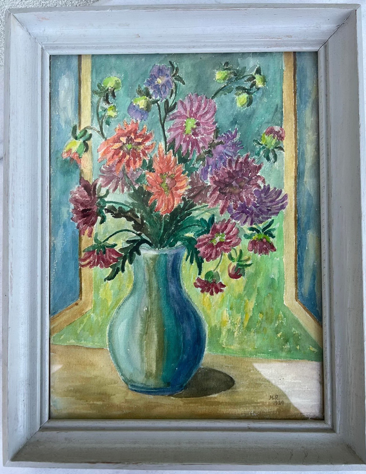 Paveikslas Natiurmortas. Kartonas, akvarelė. 1989 M. R. Lietuva. Išorinis rėmo dydis: 29 x 37 cm. Paveikslo dydis: 24 x 32 cm. Kaina 38
