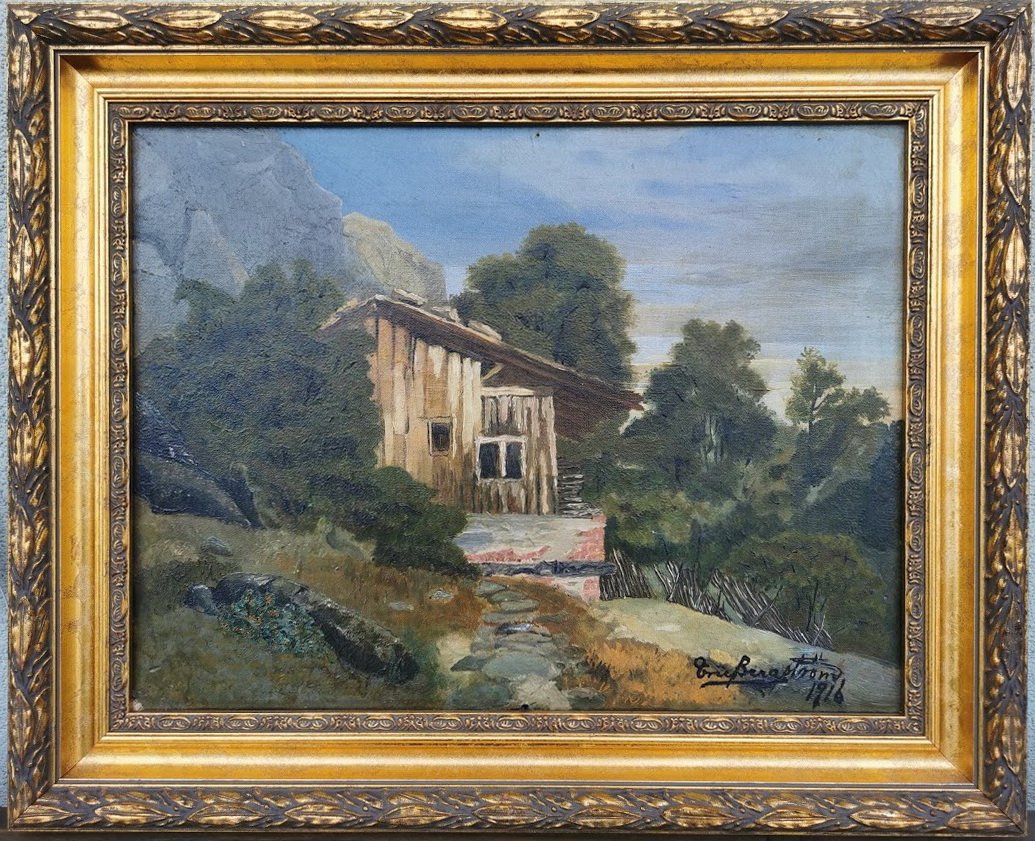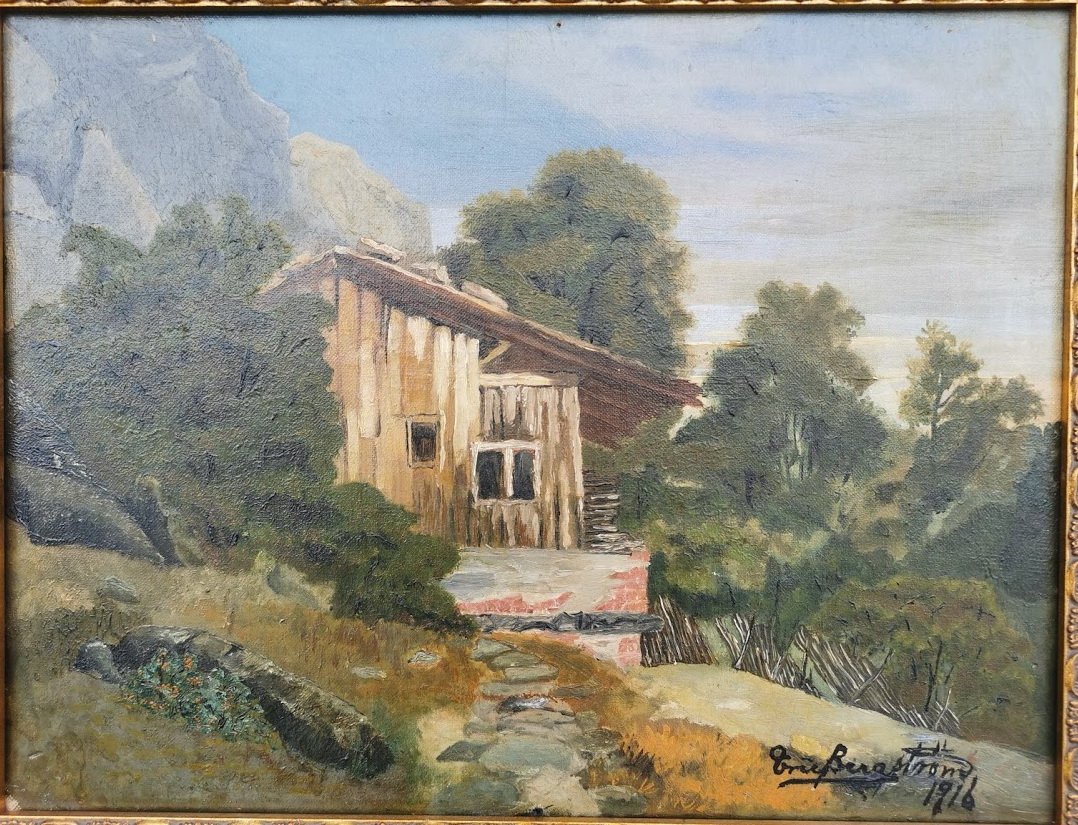 Paveikslas Peizažas su namu. Aliejus, drobė. 1916 m. Rėmo išorinis dydis: 45 x 55 cm. Kaina 87
