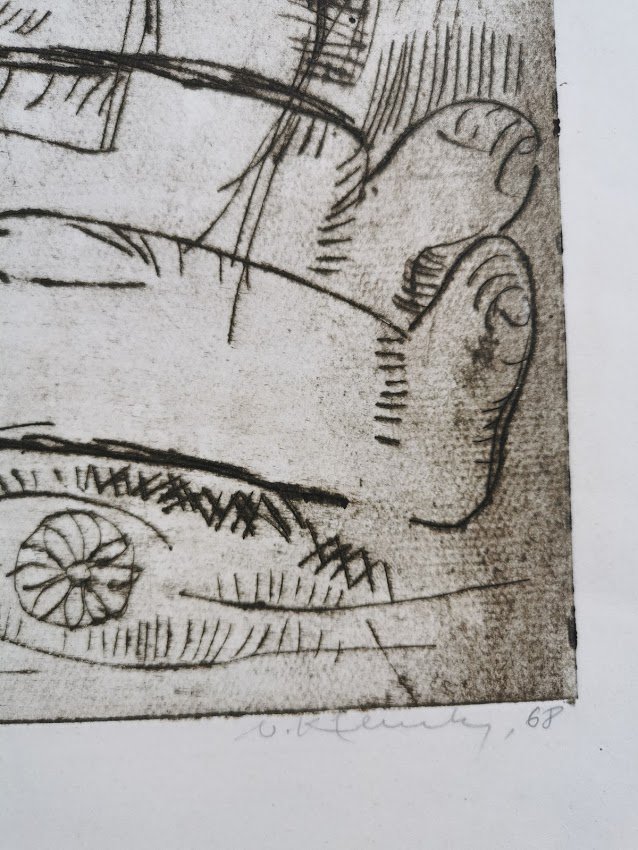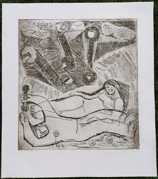 Paveikslas, raižinys Mechanizatoriai. 1968 m. Vytautas Klemka (1924–1991). Kaina 138