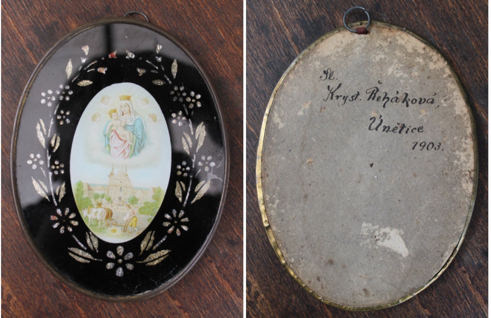 Paveikslas religinis, antikvarinis, Marijos su kūdikiu atvaizdas. 1902 m. Dydis: 11 x 14 cm. Kaina 38