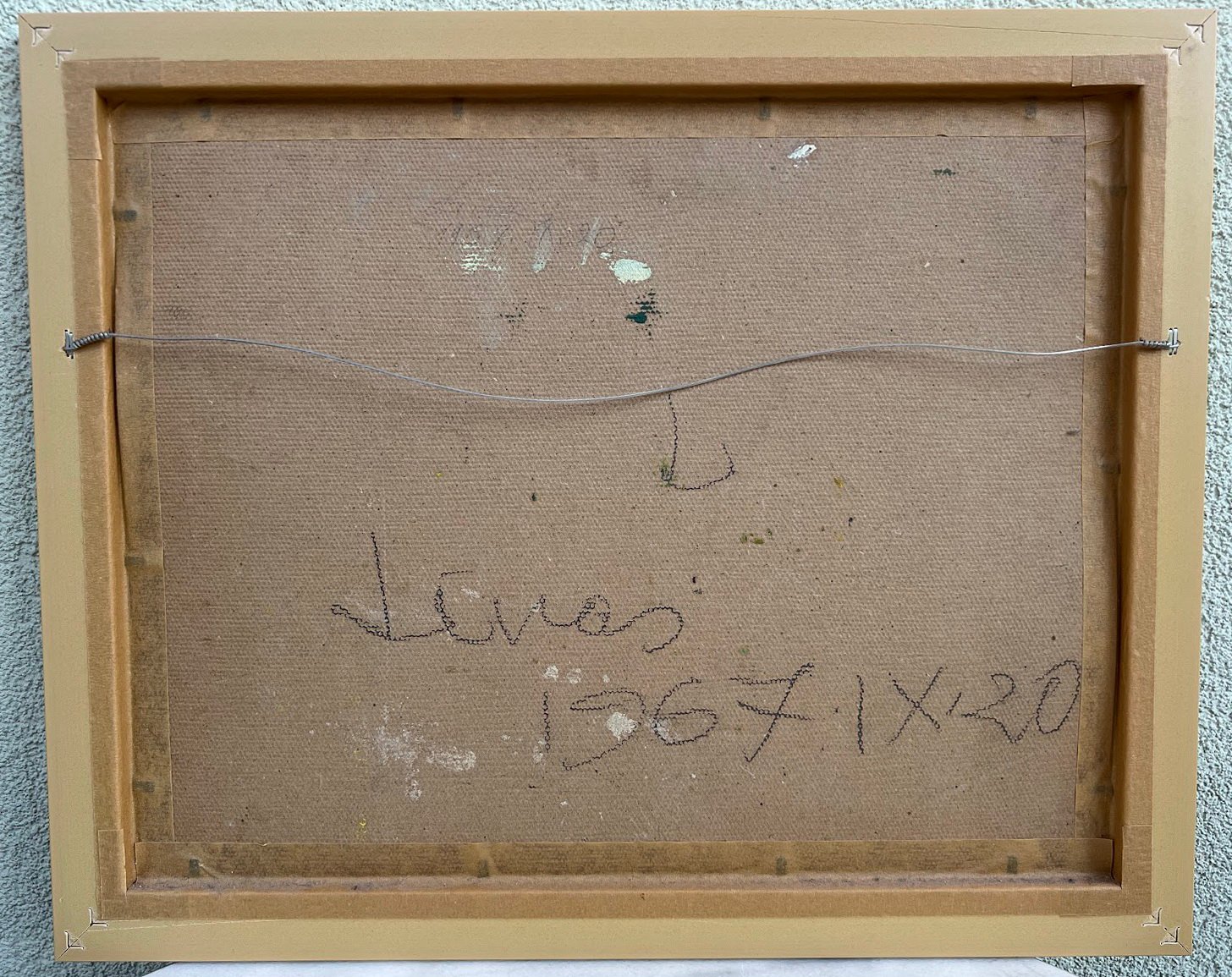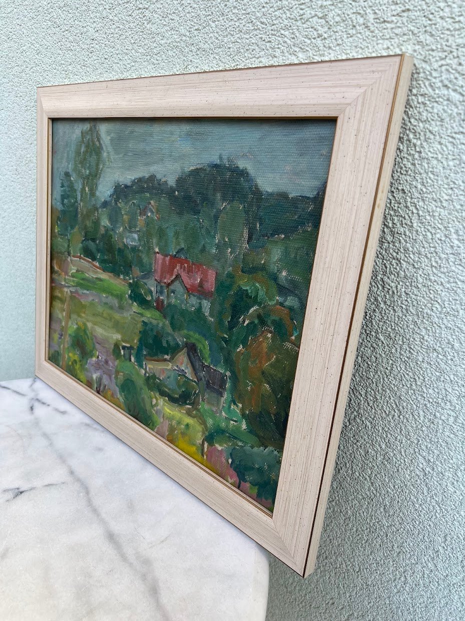 Paveikslas „Sapieginės peizažas su namu raudonu stogu“. Kartonu, aliejus. Autorius Linas Leonas Katinas (1941–2020), Lietuva. 1958 m. Kartono išmatavimai: 33,0 x 41,7 cm. Rėmas medinis. Kaina 1385
