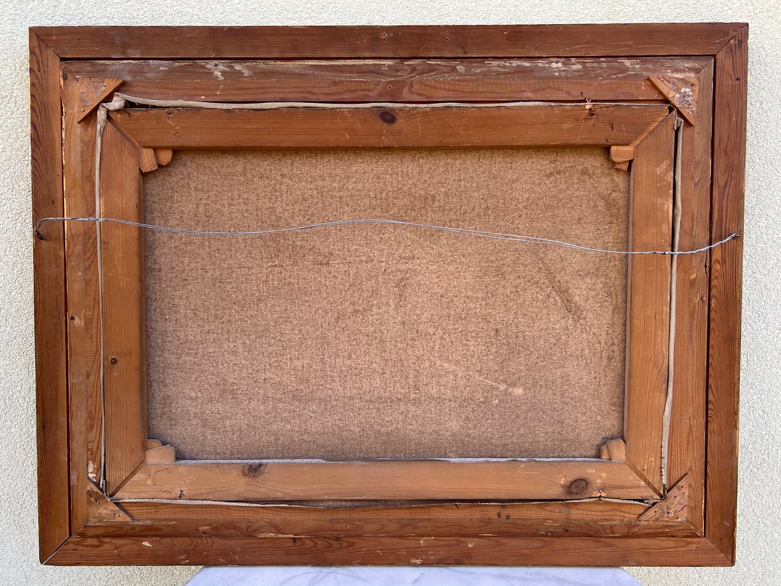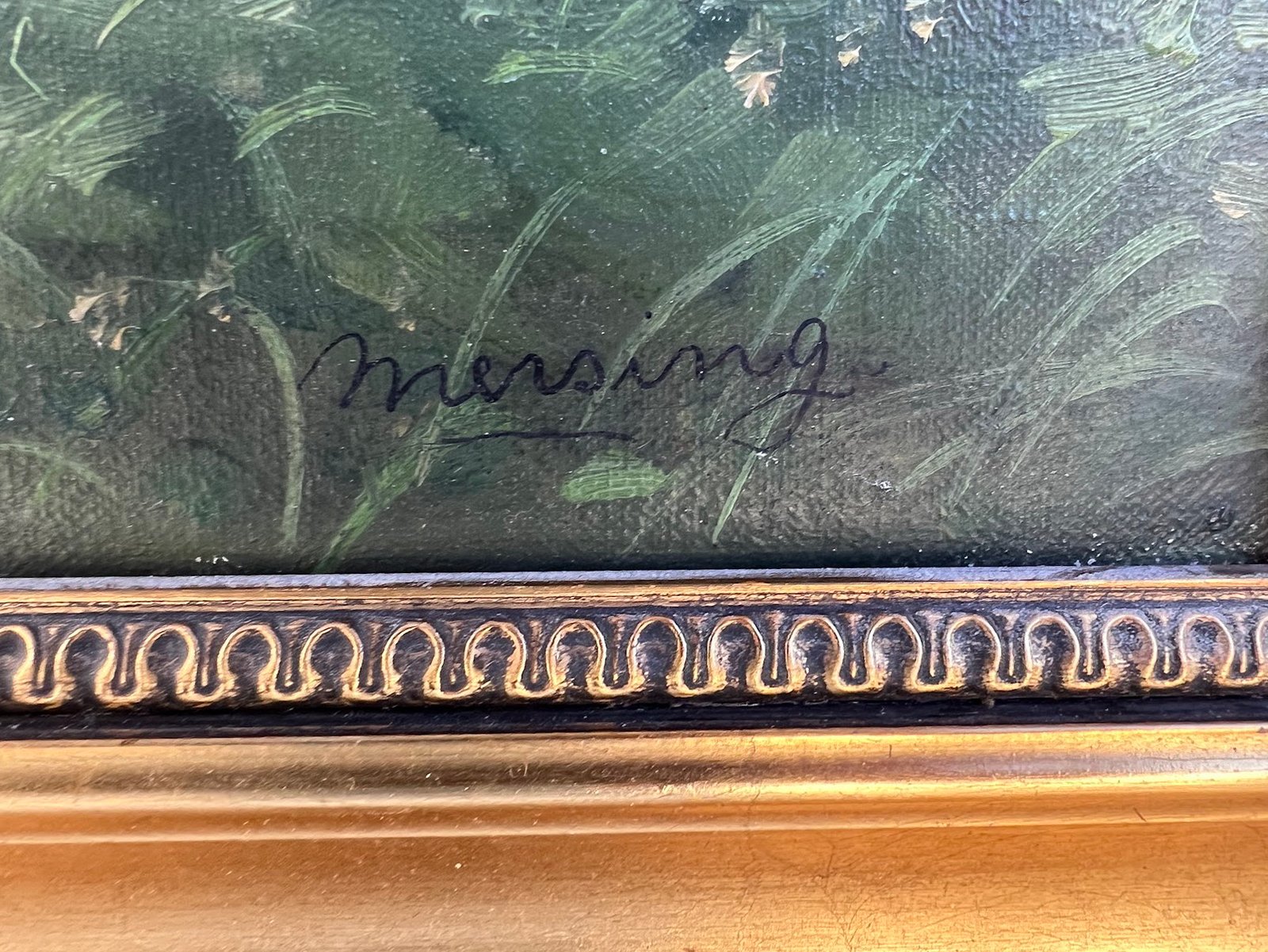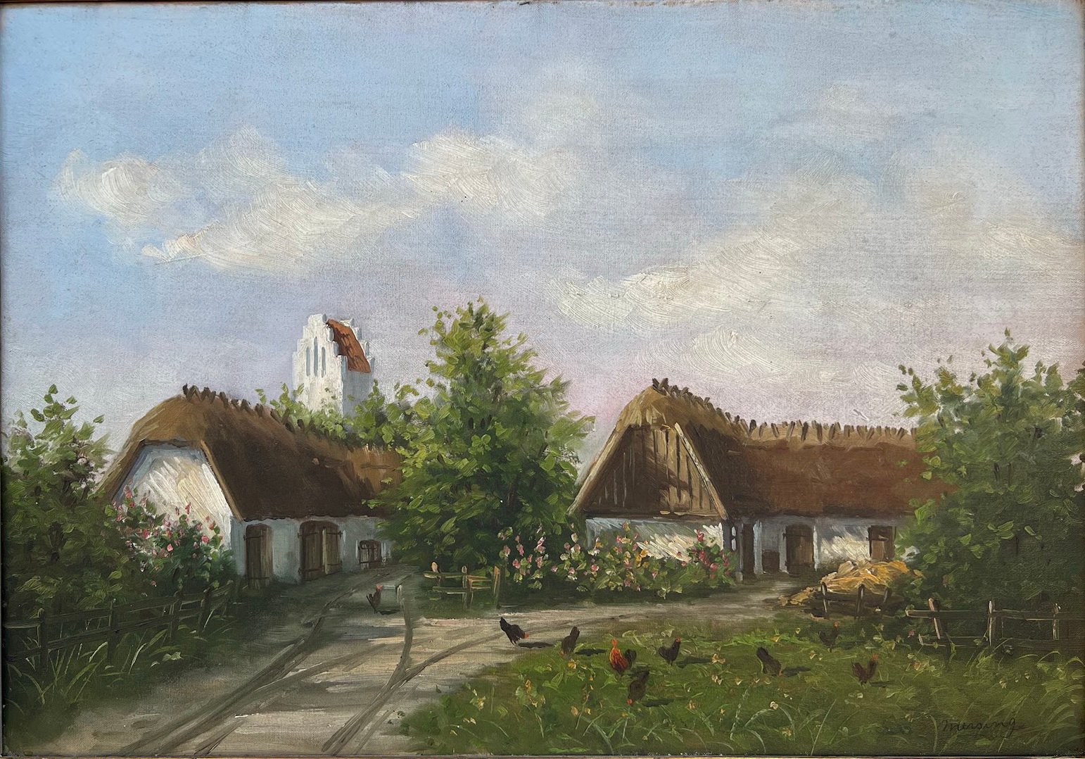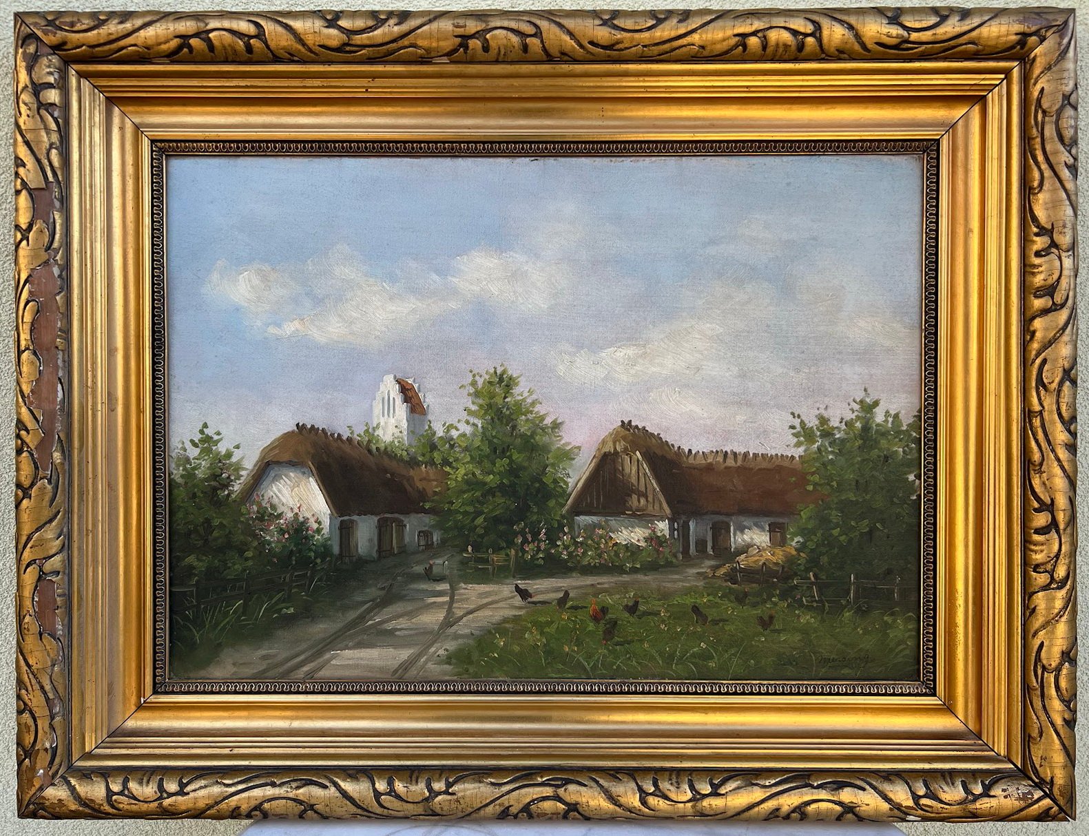 Paveikslas Sodybos kiemas. Drobė, aliejus. Rėmas medinis, auksuotas, turi nedidelį dedektą. Išorinis rėmo dydis: 66 x 86 cm. Drobės dydis: 46 x 67 cm. Kaina 168