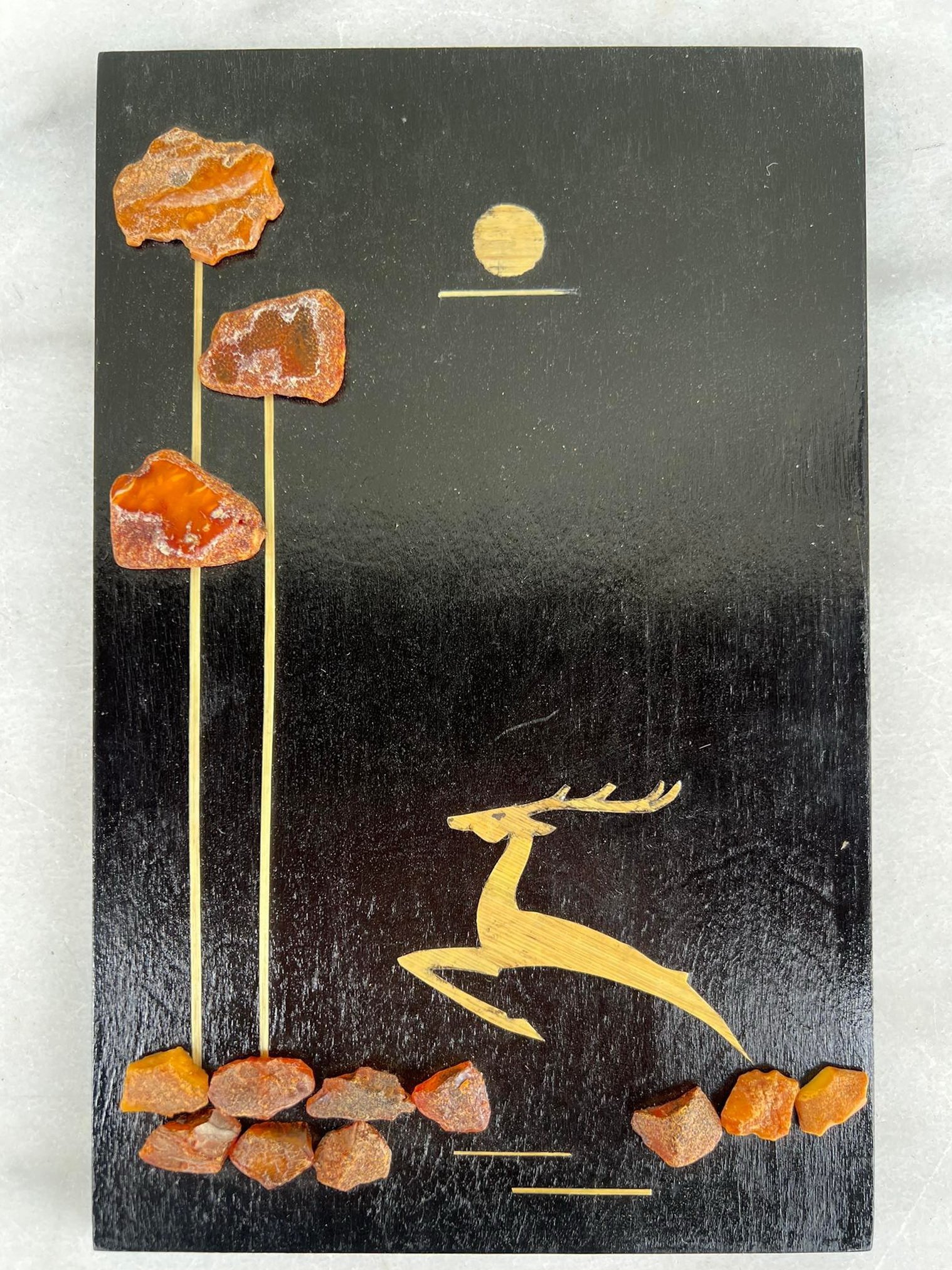 Paveikslėlis medinis su gintaru sovietinis, tarybinių laikų Stirna. Dydis: 16 x 24 cm. Kaina 42