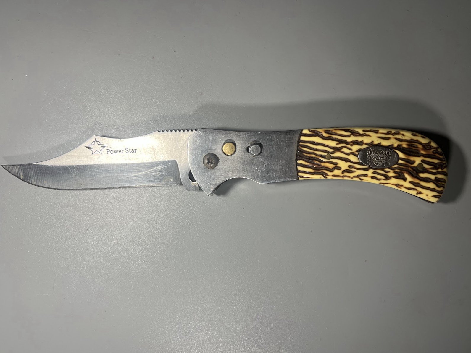Peilis kišeninis sulankstomas, prekės ženklas „Power Star“ ant geležtės, medžioklinis, išgyvenimo peilis, dekoratyvi, rago imitacijos rankena. Kaina 18