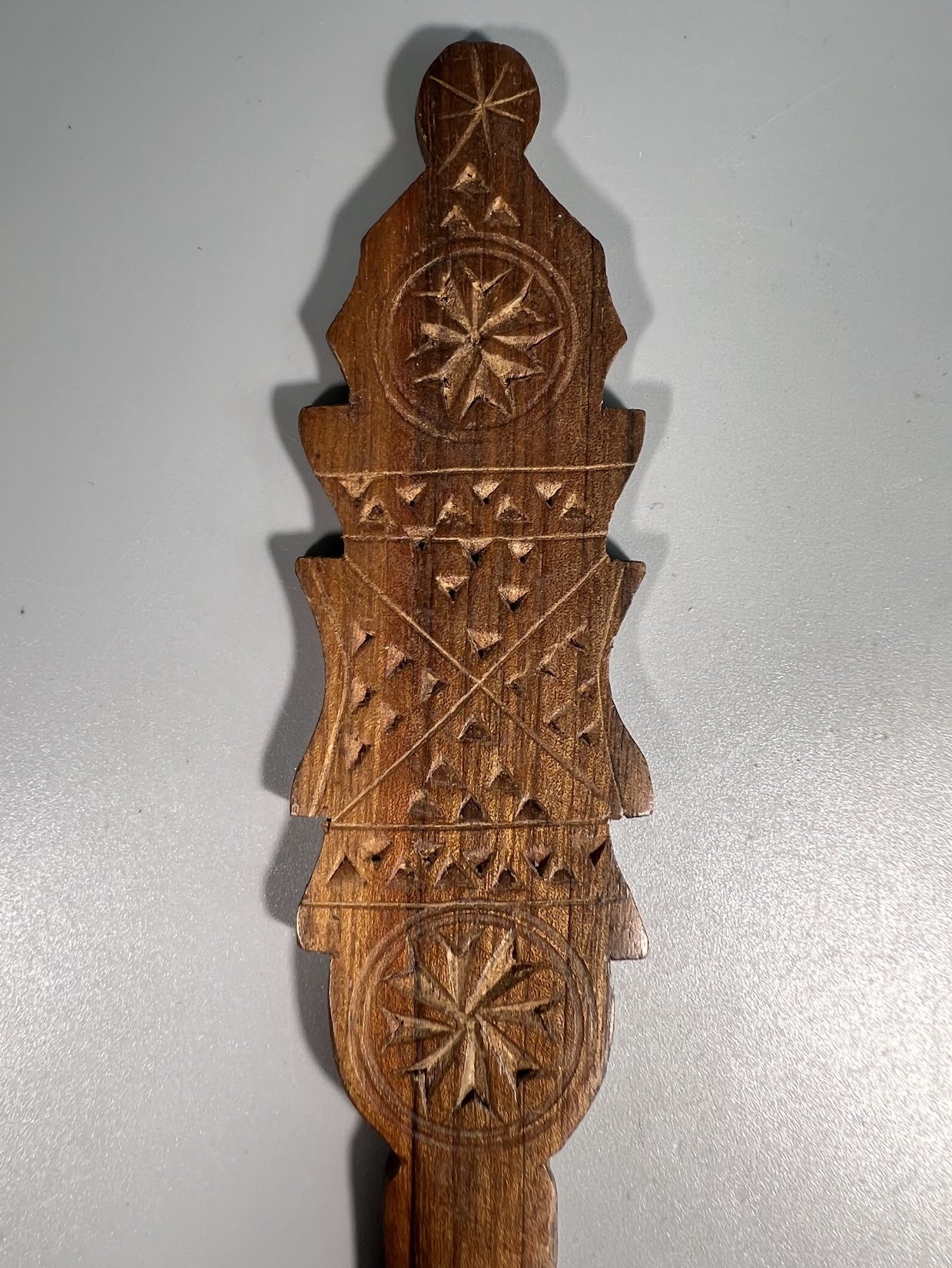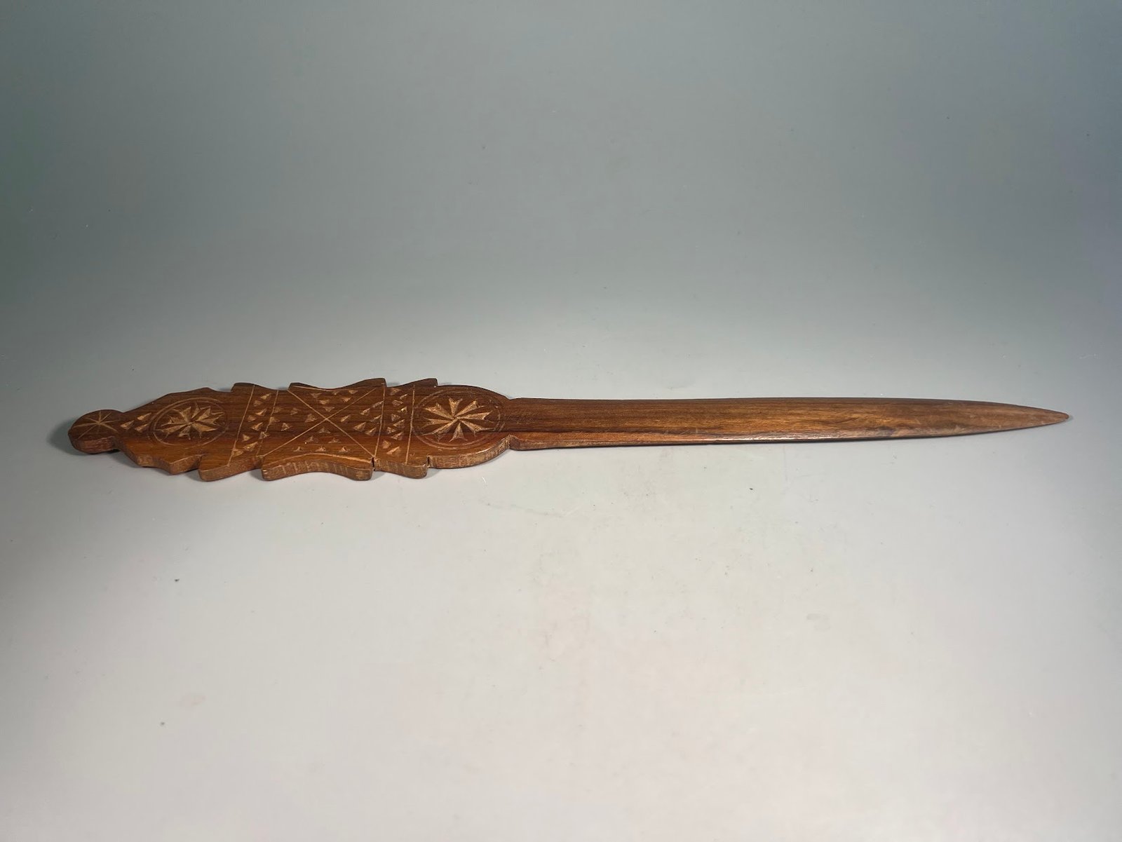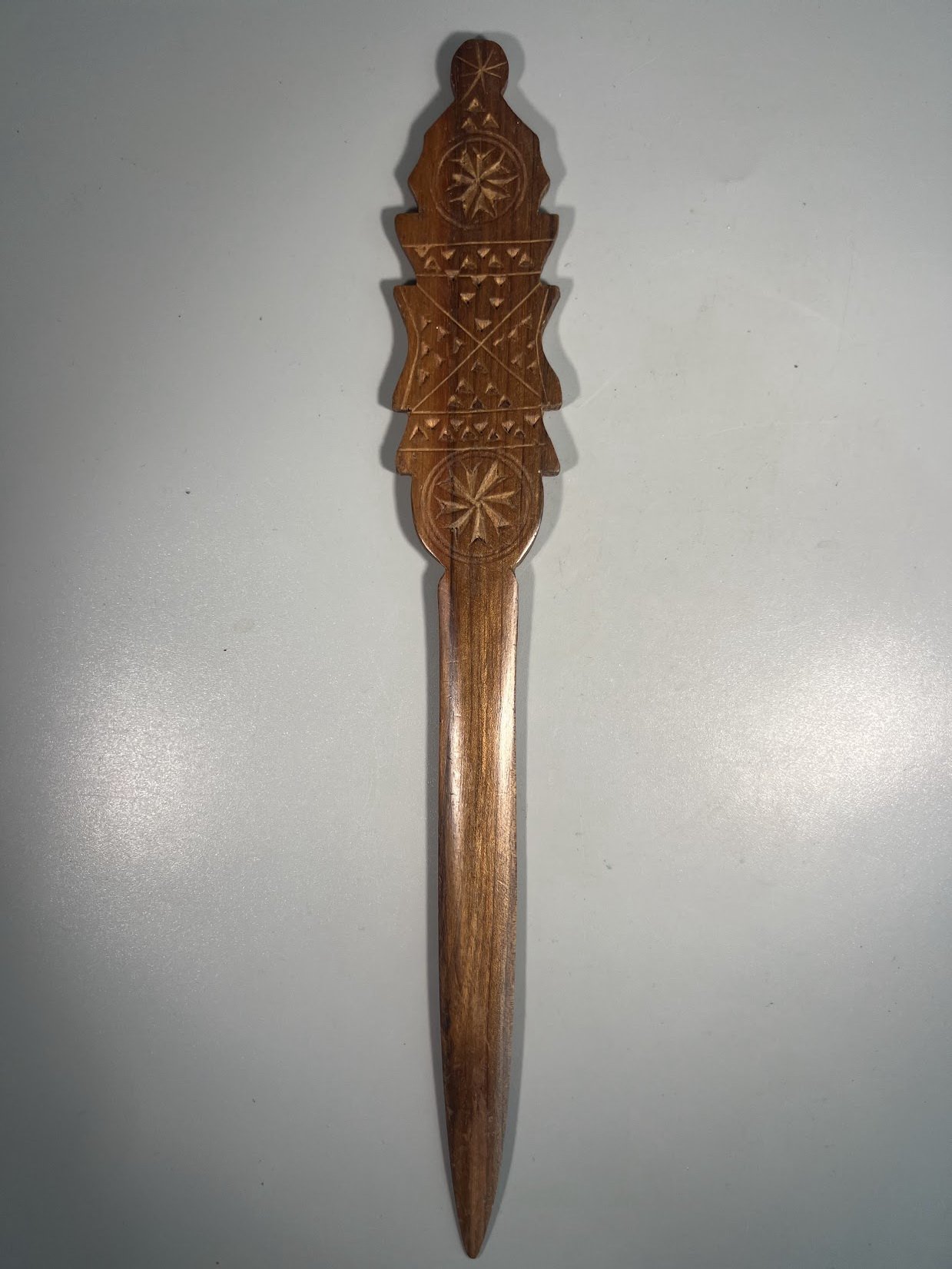 Peilis medinis, drožinėtas laiškams, popieriui atplėšti. Ilgis 28 cm. Kaina 22
