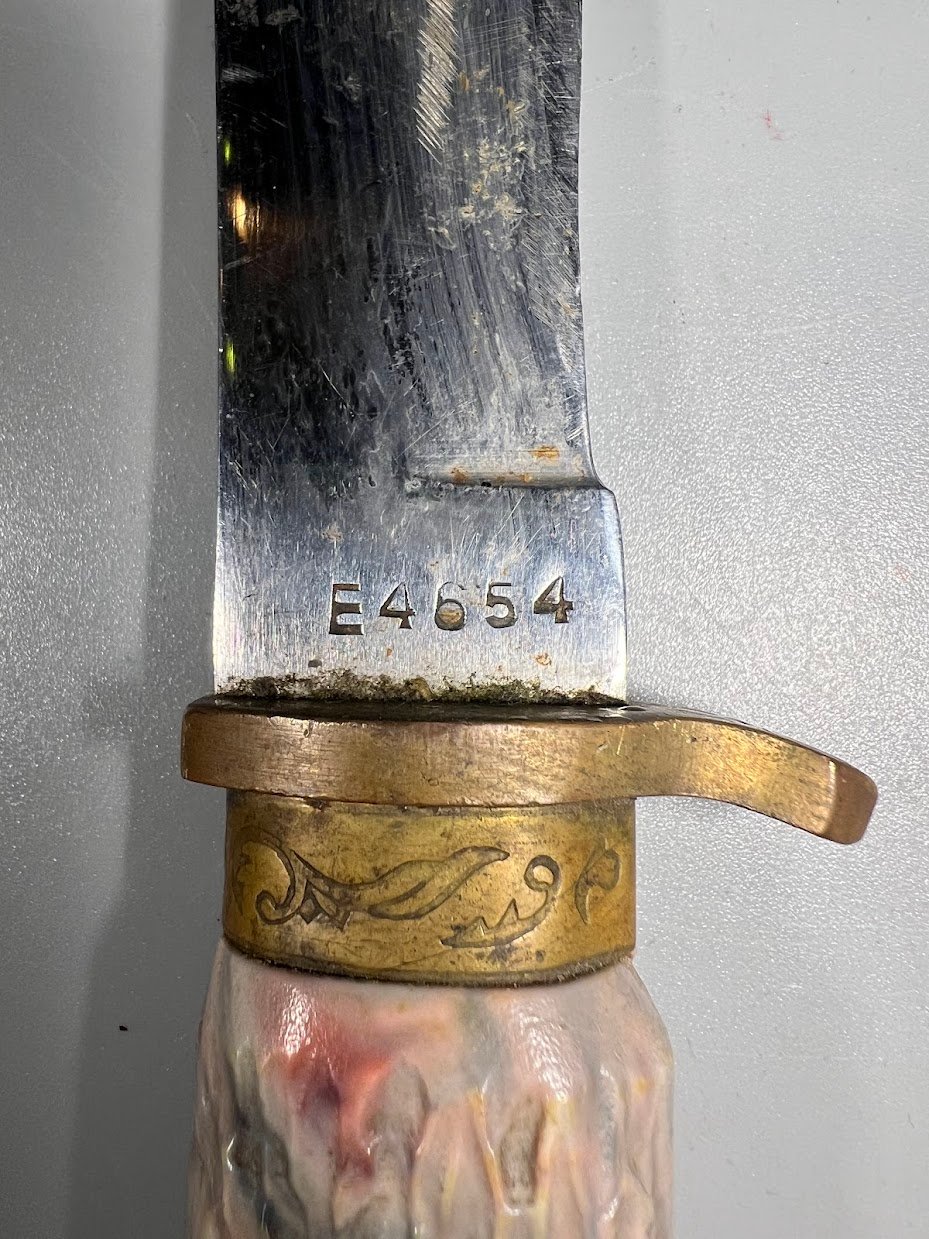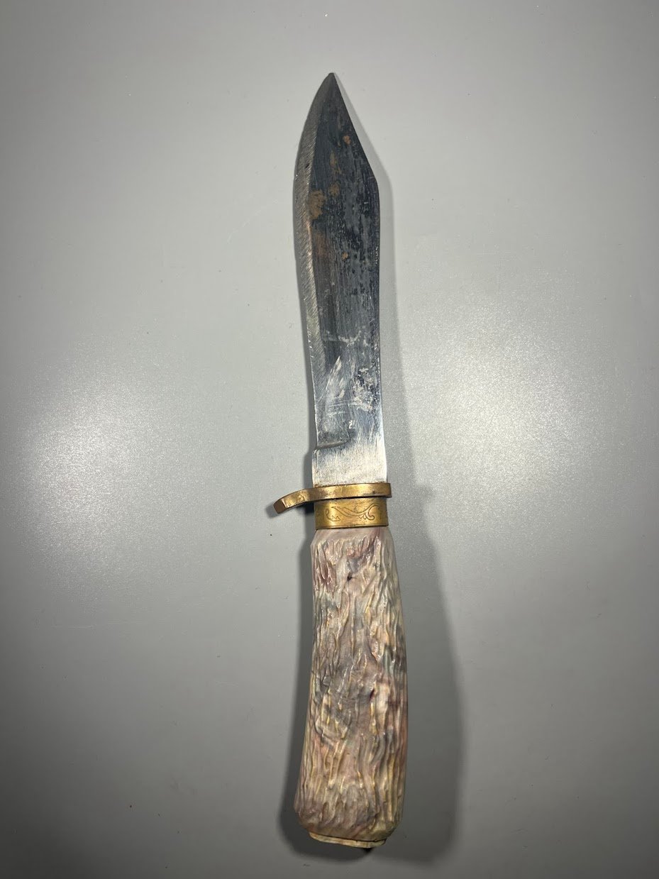 Peilis medžioklinis, antikvarinis, dekoratyvi kaulo rankenos imitacija, tvirtas plienas, numeruotas. Kaina 36
