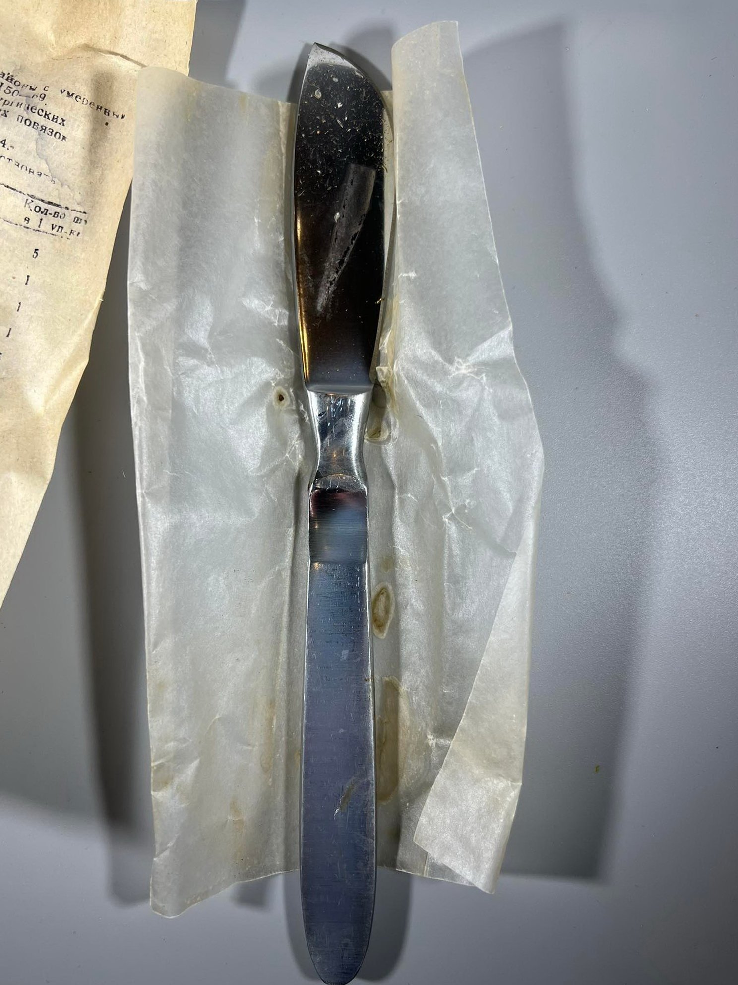 Peilis, skalpelis medicinis, chirurginis, stambus. Nenaudota. 3 vnt. Medicininio nerūdijančio, nikeliuoto plieno. Dėžutės ilgis 23 cm. Kaina po 28