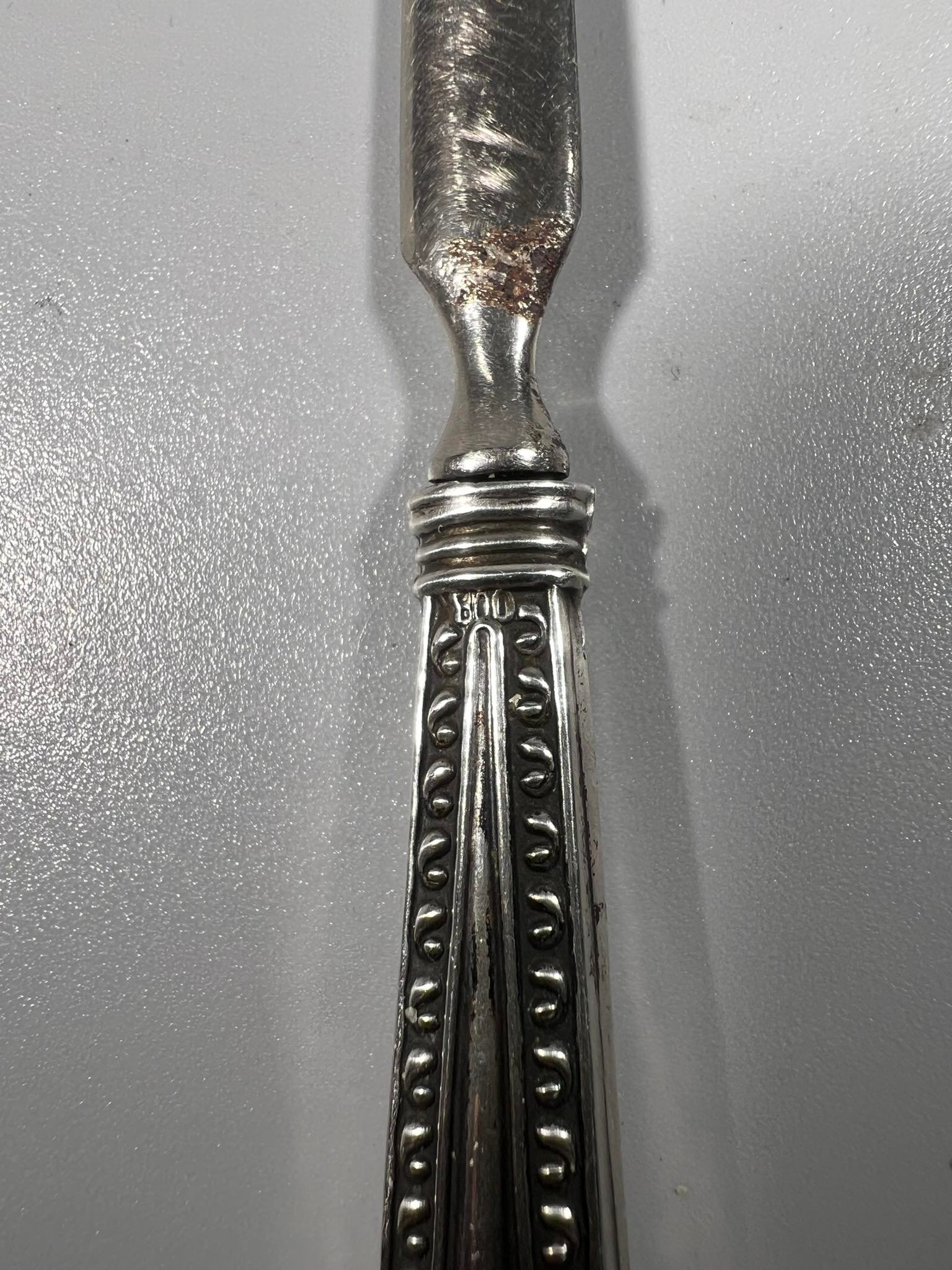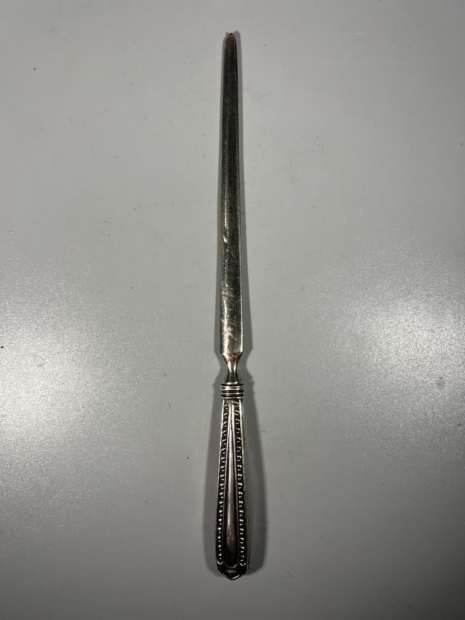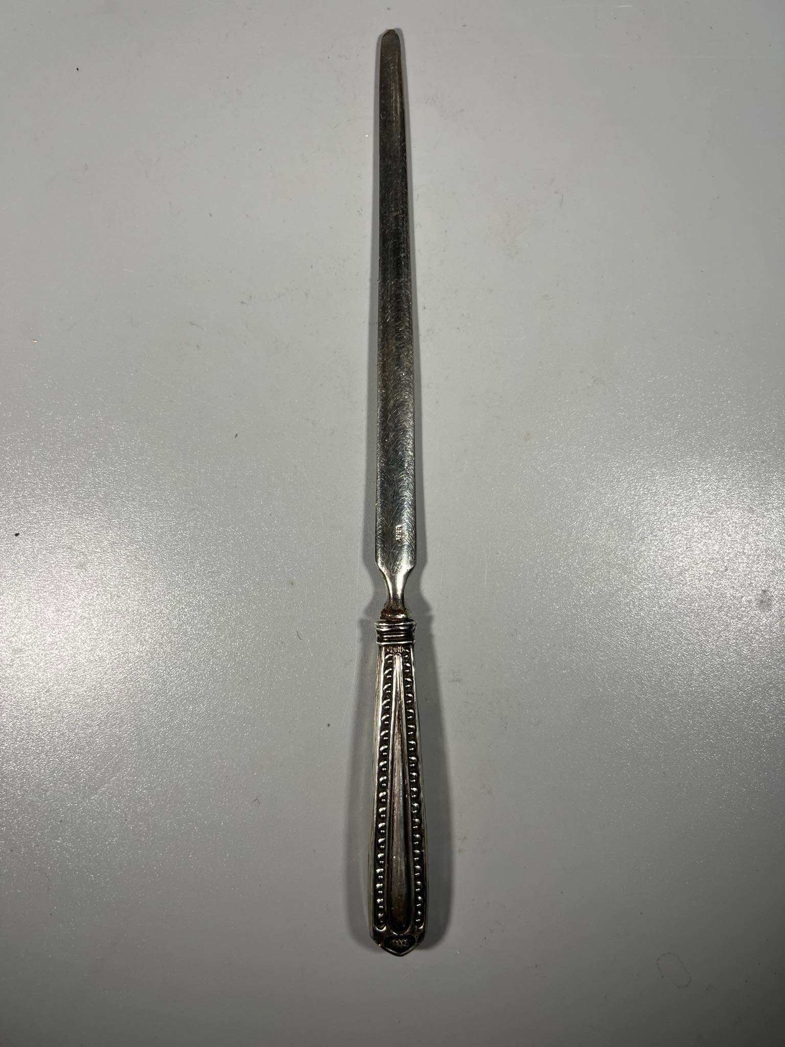Peilis vokams atplėšti sidabrinis, antikvarinis. Praba 800. Ilgis 20 cm. Kaina 28