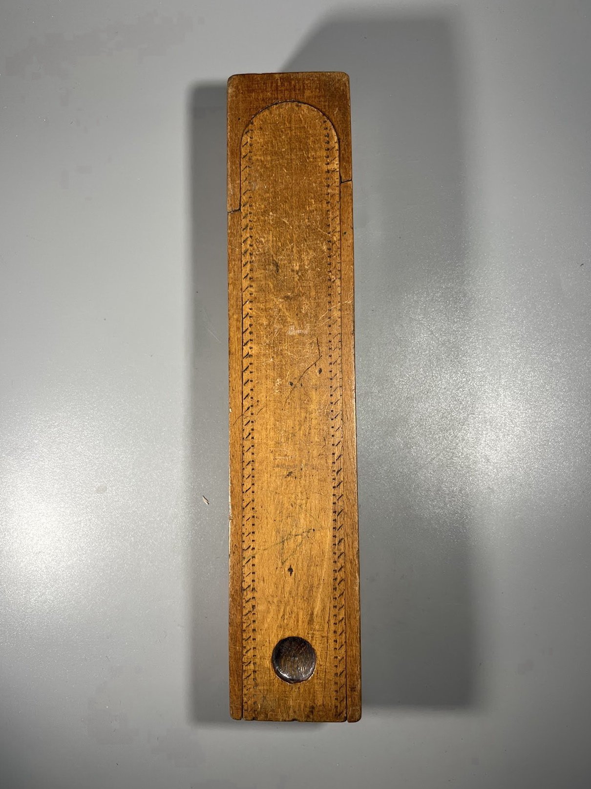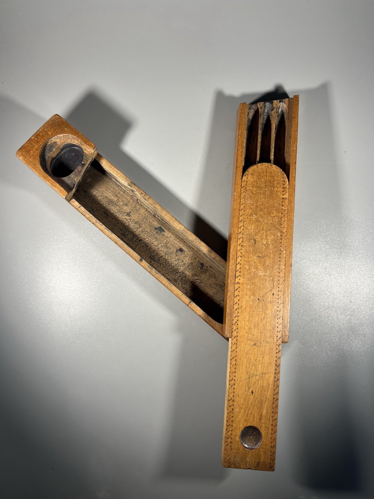 Penalas medinis, antikvarinis, dviejų aukštų, sulankstomas. Aukštis 3,5, plotis 4,5, ilgis 23,5 cm. Kaina 28