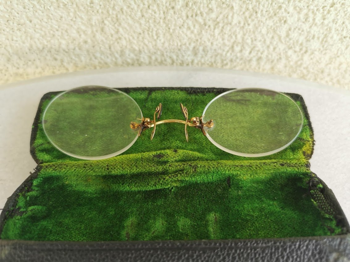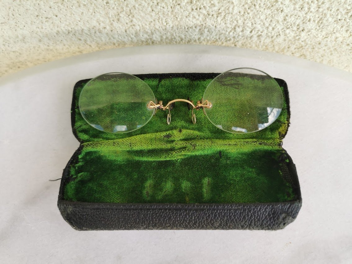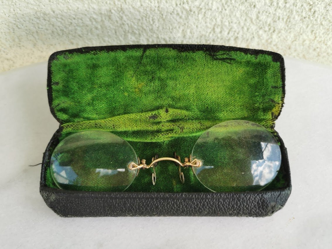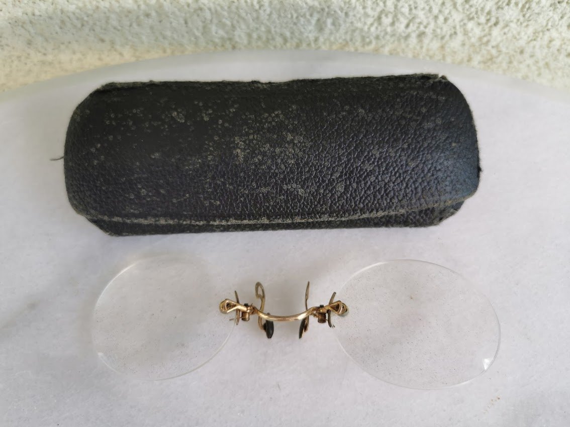 Pensne akiniai antikvariniai, auksuoti, dėžutėje. Kaina 68