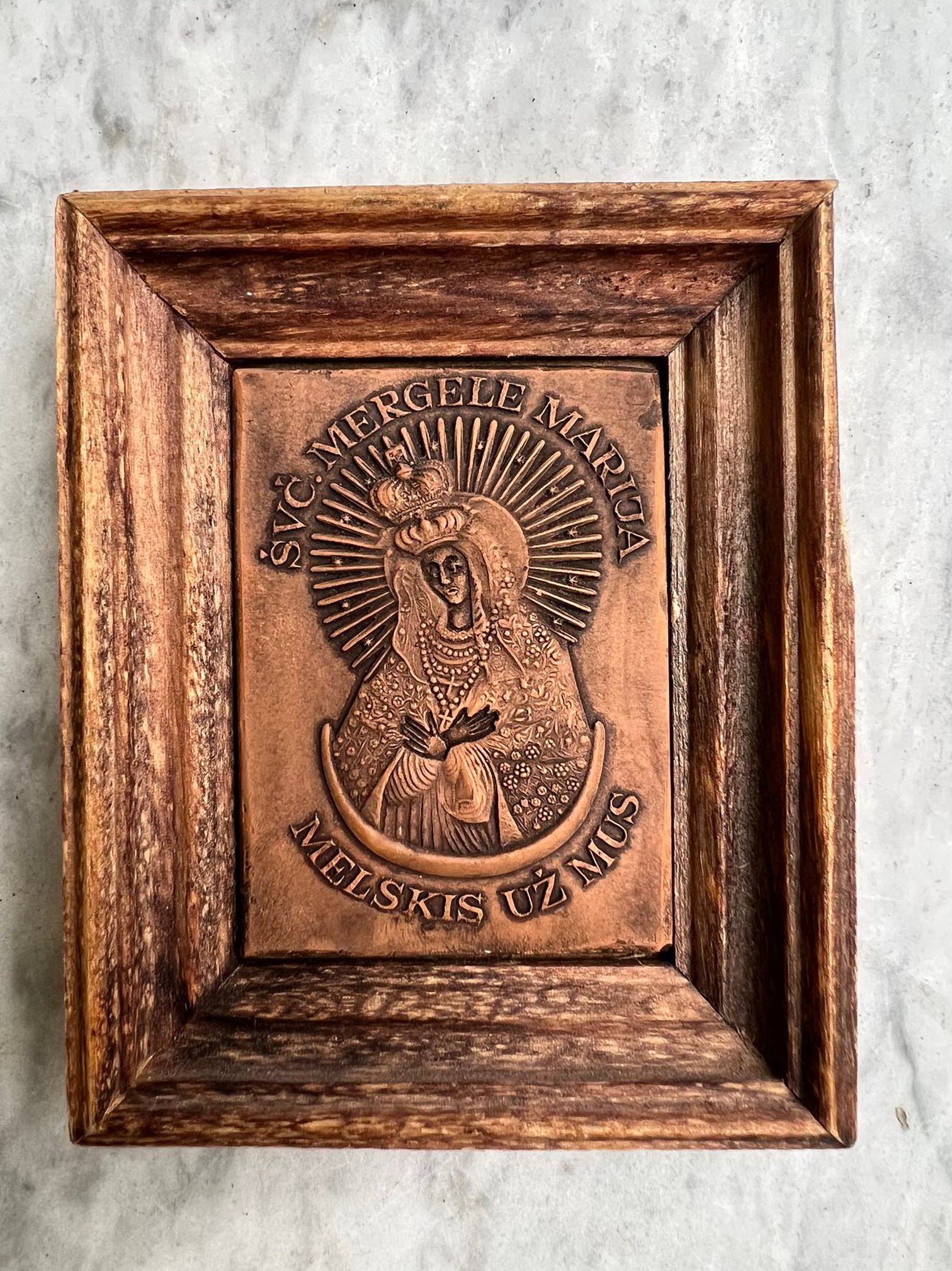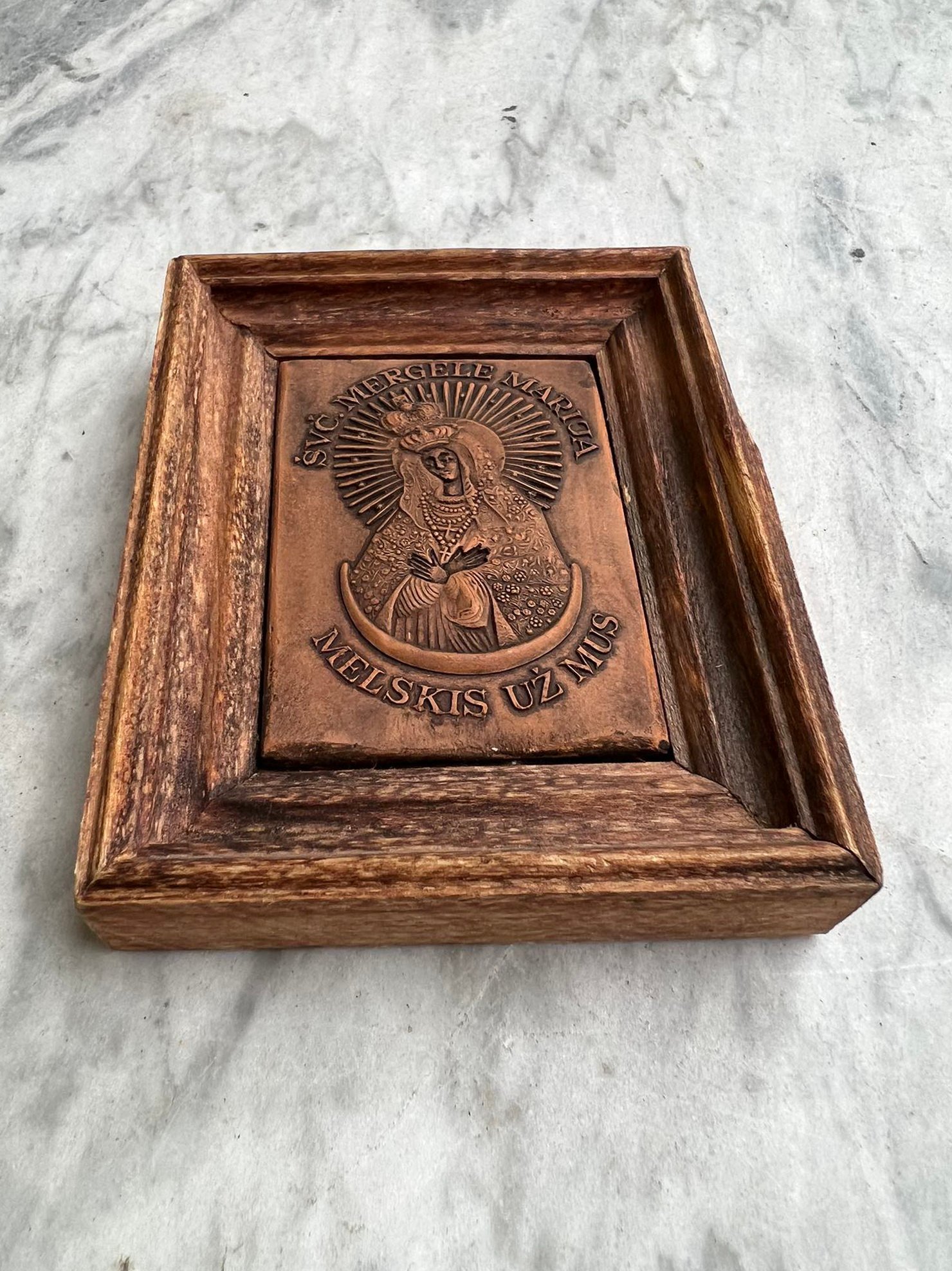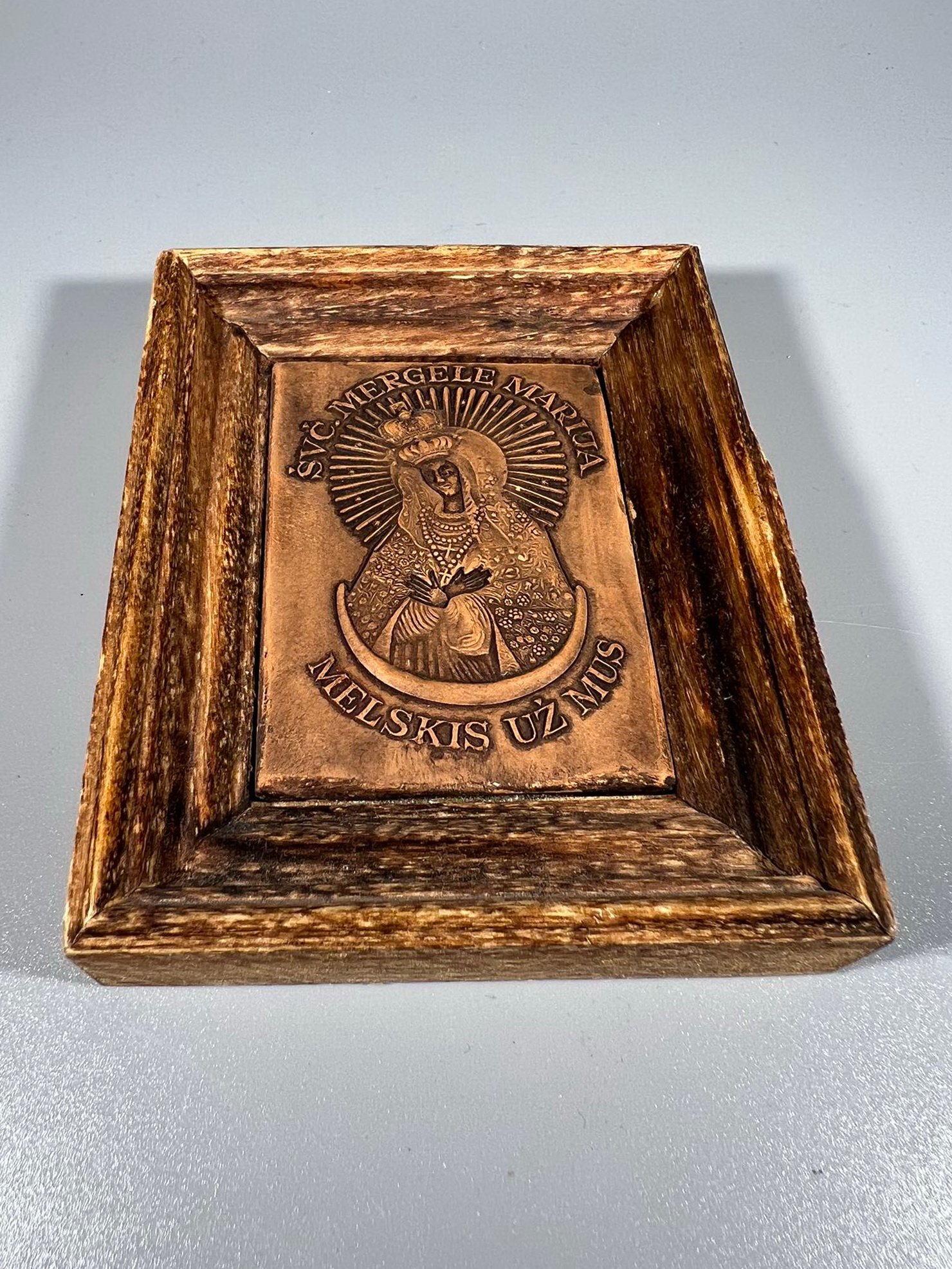 Plaketė keraminė, molinė Švč. mergele Marija melskis už mus. Mediniame rėmelyje. Išoriinis rėmelio dydis: 8 x 10 cm. Kaina 13
